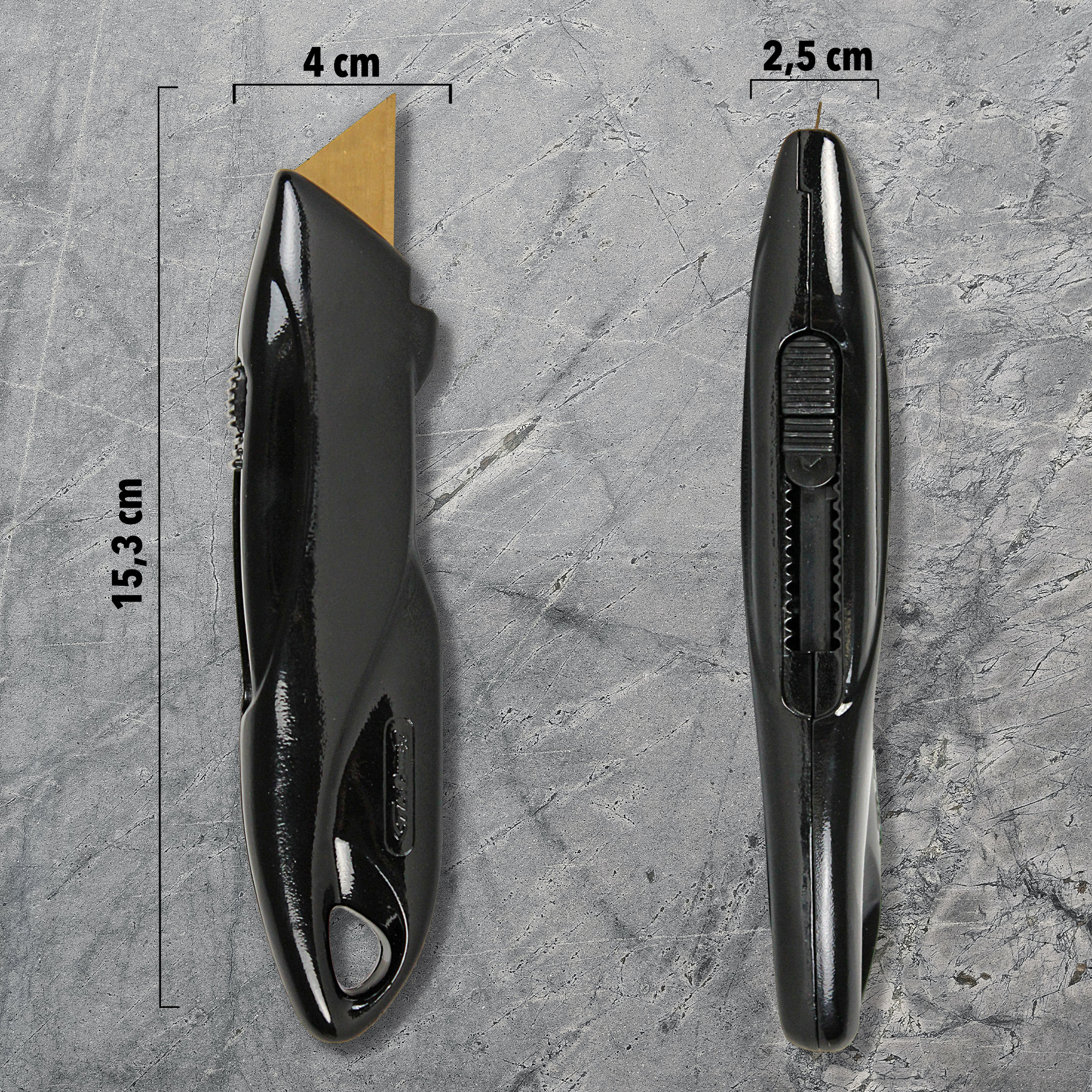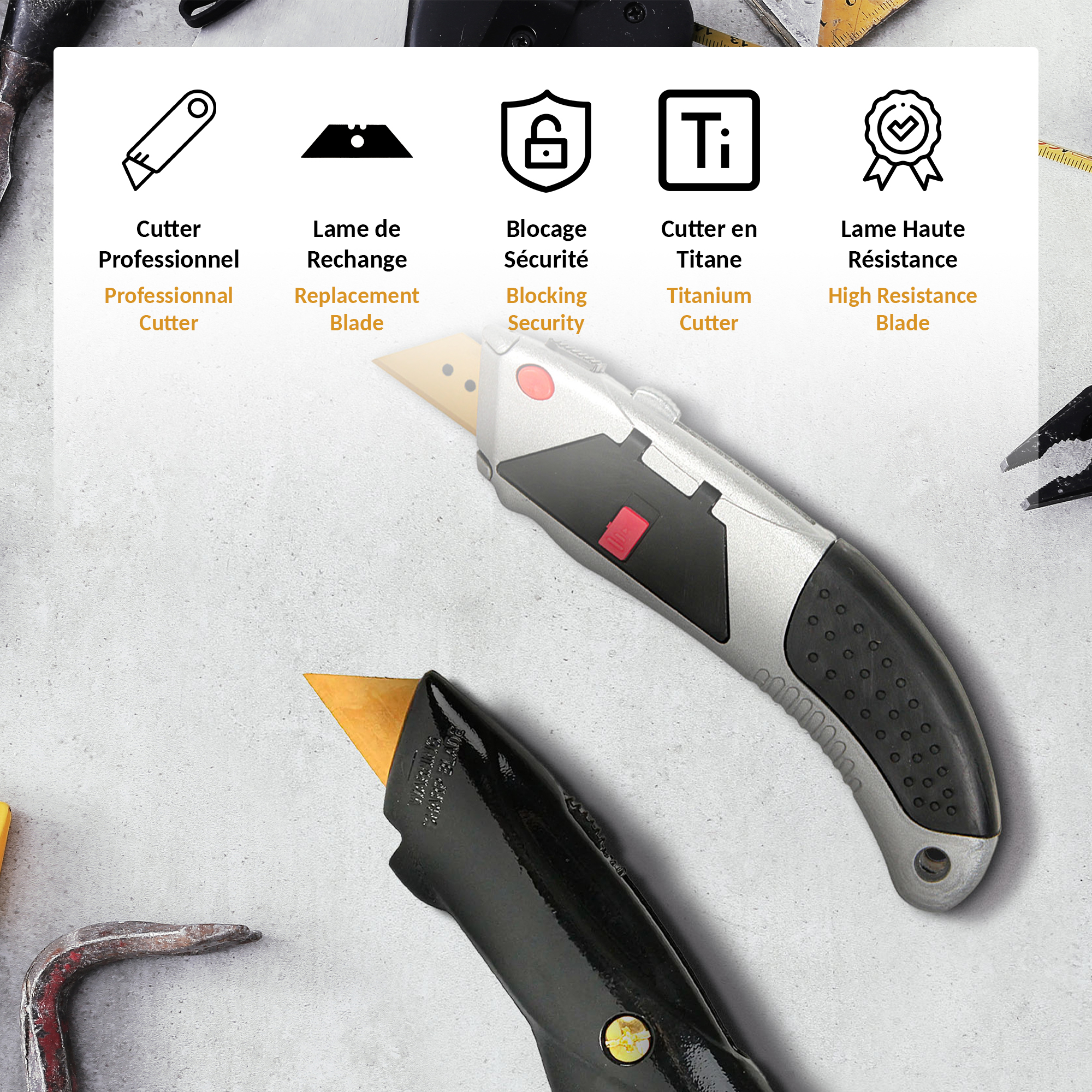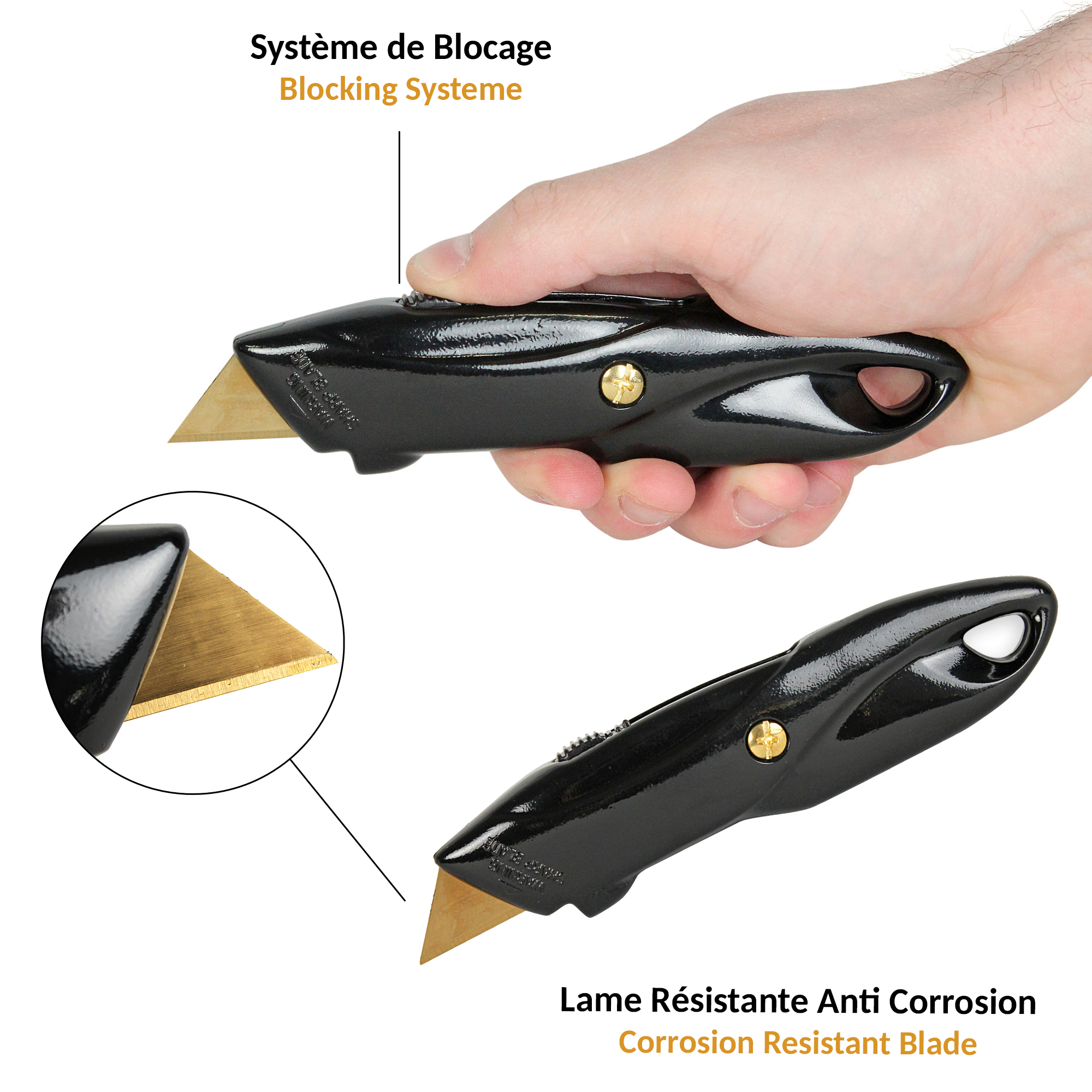 Une lame recouverte de titane, comme le blindage des porte-avions américains! Utilisé dans les secteurs aérospatial et militaire, le titane est un métal connu pour sa grande légèreté, et sa résistance à la corrosion. Ce cutter ergonomique en métal possède une lame recouverte en Titane, ce qui lui confère une précision et une résistance exceptionnelles! Inutile de forcer, sa lame ultra fine coupera avec précision et sans effort. Pratique, son système de blocage anti-retour permet de maintenir la lame fermement pendant la coupe. Sa finition laquée en fait un objet élégant et moderne. Précision, légèreté, résistance: optez pour un outil de grande qualité! Caractéristiques: – Matières: POM, alliage de zinc, titane – 1 lame supplémentaire fournie – Packaging: Boîte VPC