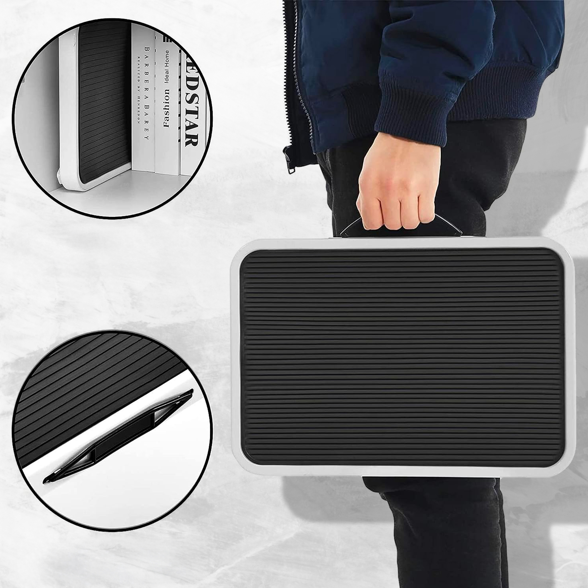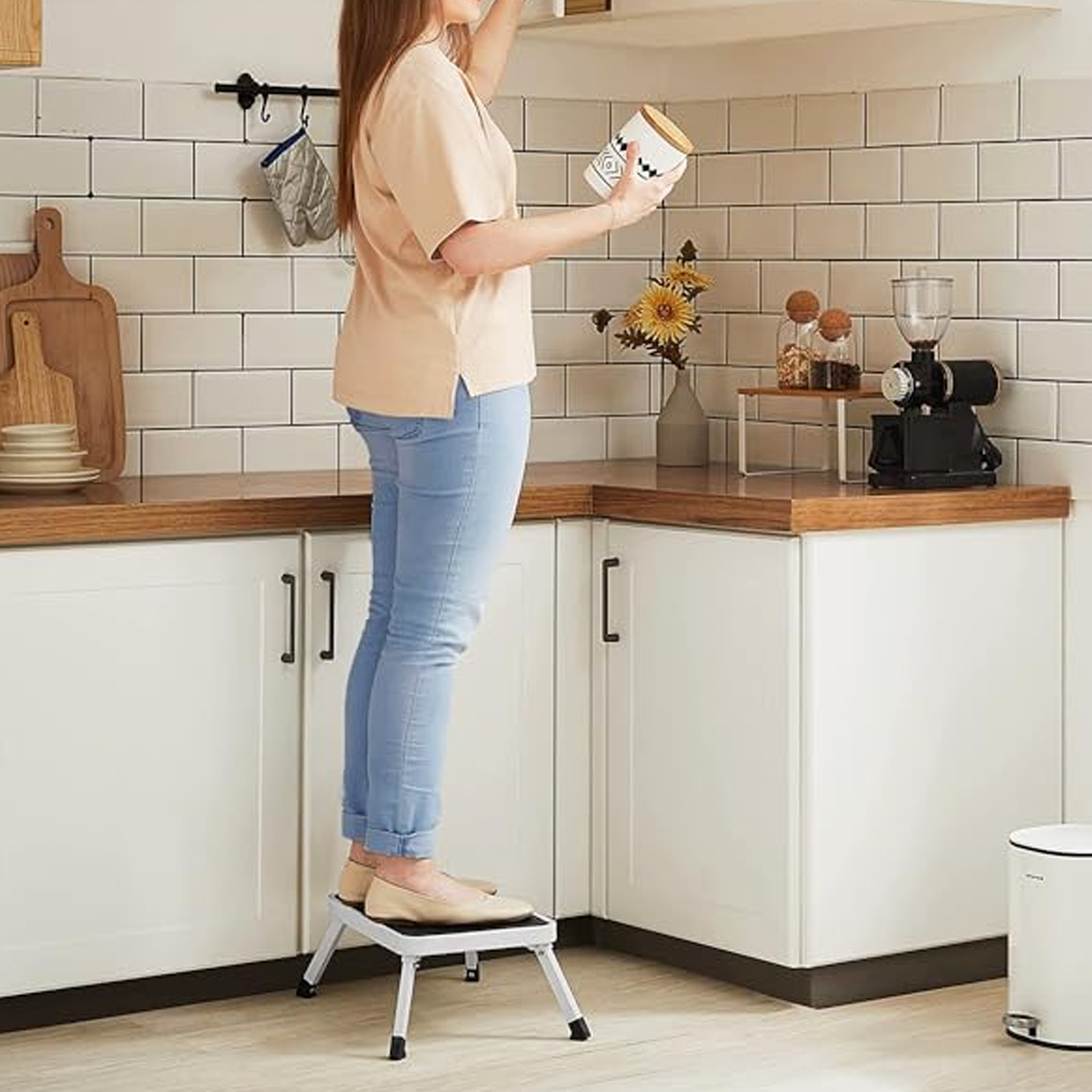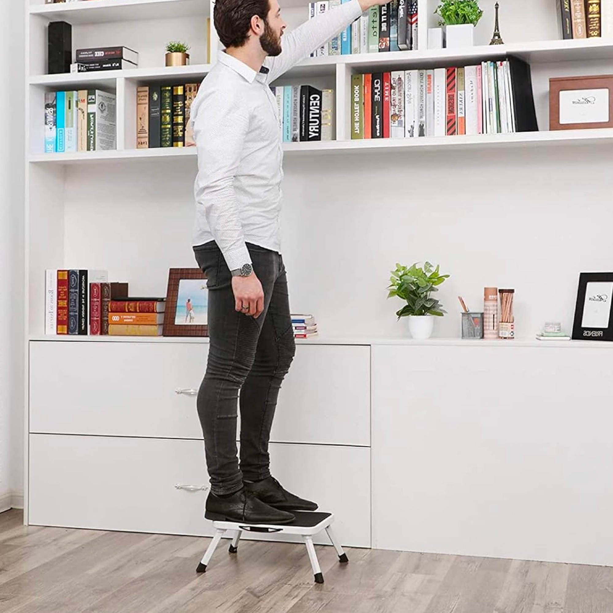 Le bon coup de pouce du quotidien ! Vous avez besoin d’atteindre un placard en hauteur ; votre premier réflexe sera sans doute de grimper sur une chaise. Et pourtant, vous savez pertinemment qu’elles ne sont pas prévues pour car vous risquez de tomber. Optez donc pour la sécurité avec ce marchepied ! Ce dernier comporte une marche, ferme, stable et antidérapante. Vous pouvez ainsi changer une ampoule ou épousseter le haut de vos armoires en toute sécurité. Transportez le marchepied à l’aide de sa poignée pratique et glissez-le à plat sous une armoire ou dans un tiroir en attendant la prochaine utilisation ! Caractéristiques: – Matières : Acier – Caoutchouc – Dimensions : 46 x 32 x 17 cm (ouvert) – 37,8 x 26 x 4 cm (plié) – Poids : 1kg – Certifié EN 14183