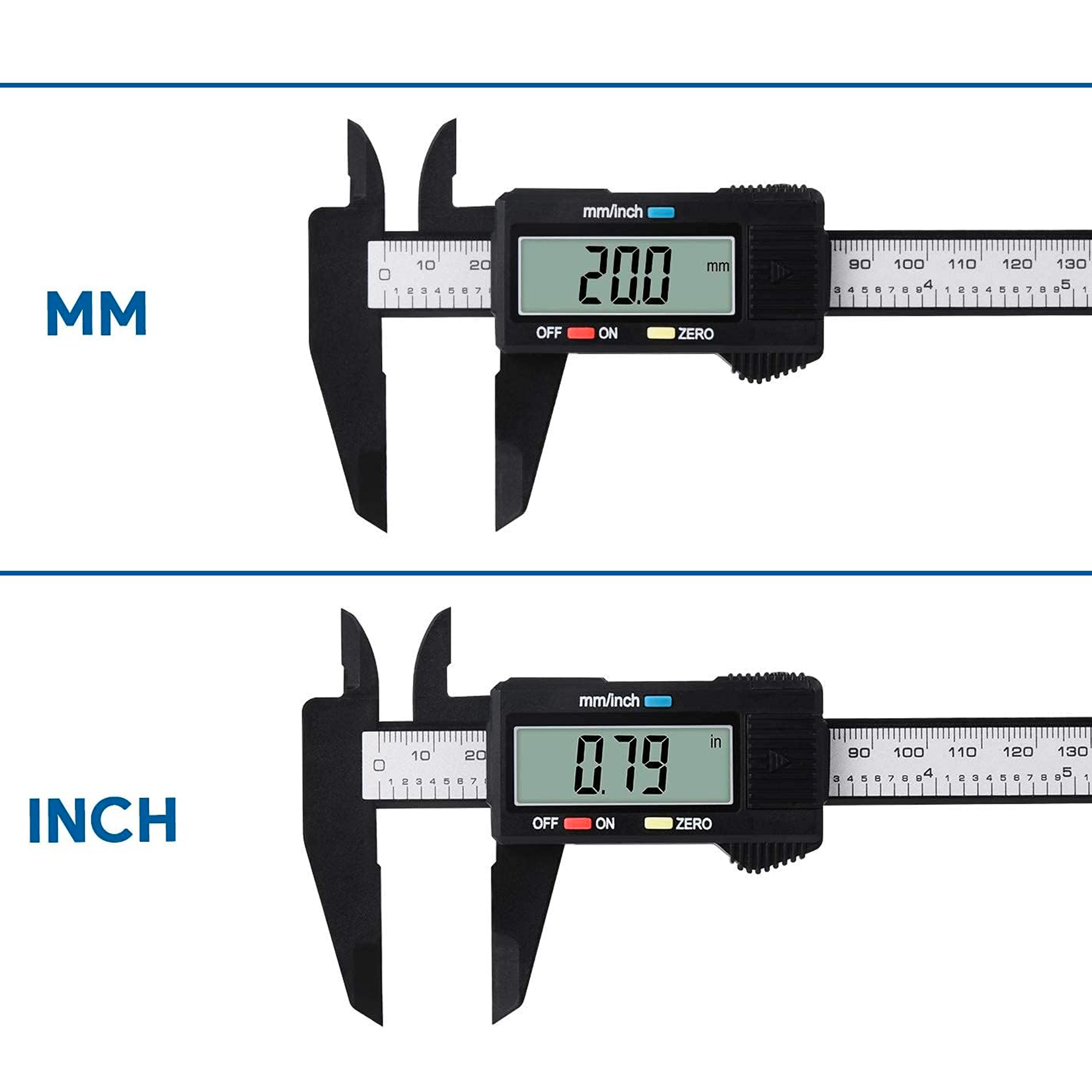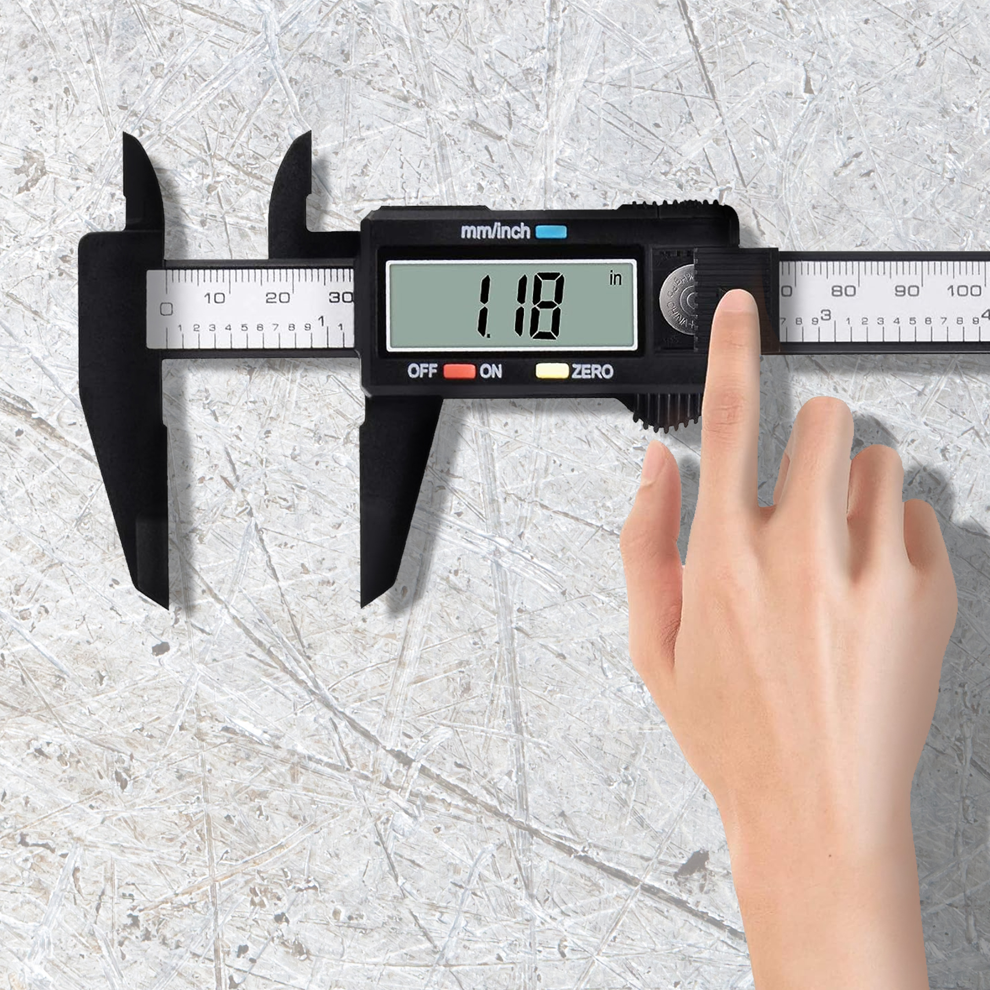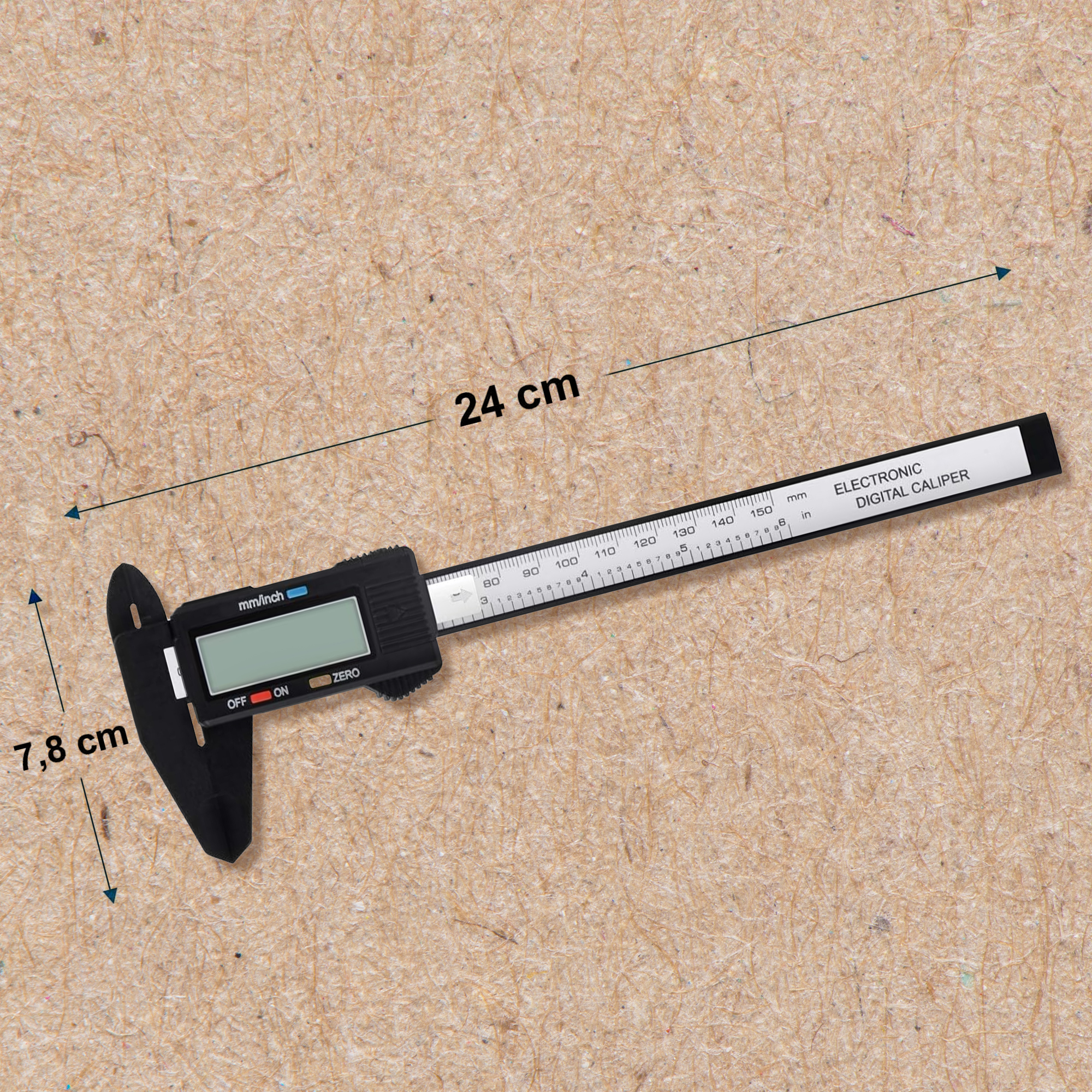 Ce pied à coulisse digital mesurera avec une précision au dixième de millimètre près toutes vos pièces de petite taille, de forme ronde ou cylindrique et autres objets qu’un simple mètre ne peut mesurer efficacement. Sa fonction de mise à zéro possible à n’importe quel niveau de la base graduée vous permet de mesurer aisément des objets de toute forme. Son double bec permet de prendre des mesures intérieures et extérieures, et son grand écran LCD permet un confort de lecture optimal. Sa composition en fibre de carbone en fait un outil résistant et léger! Caractéristiques: – Matières: Fibre de carbone – Plage de mesure: 0-150 mm – Précision: +/- 0,1mm – Résolution: 0,1 – Pile LR44 (1.5V) fournie