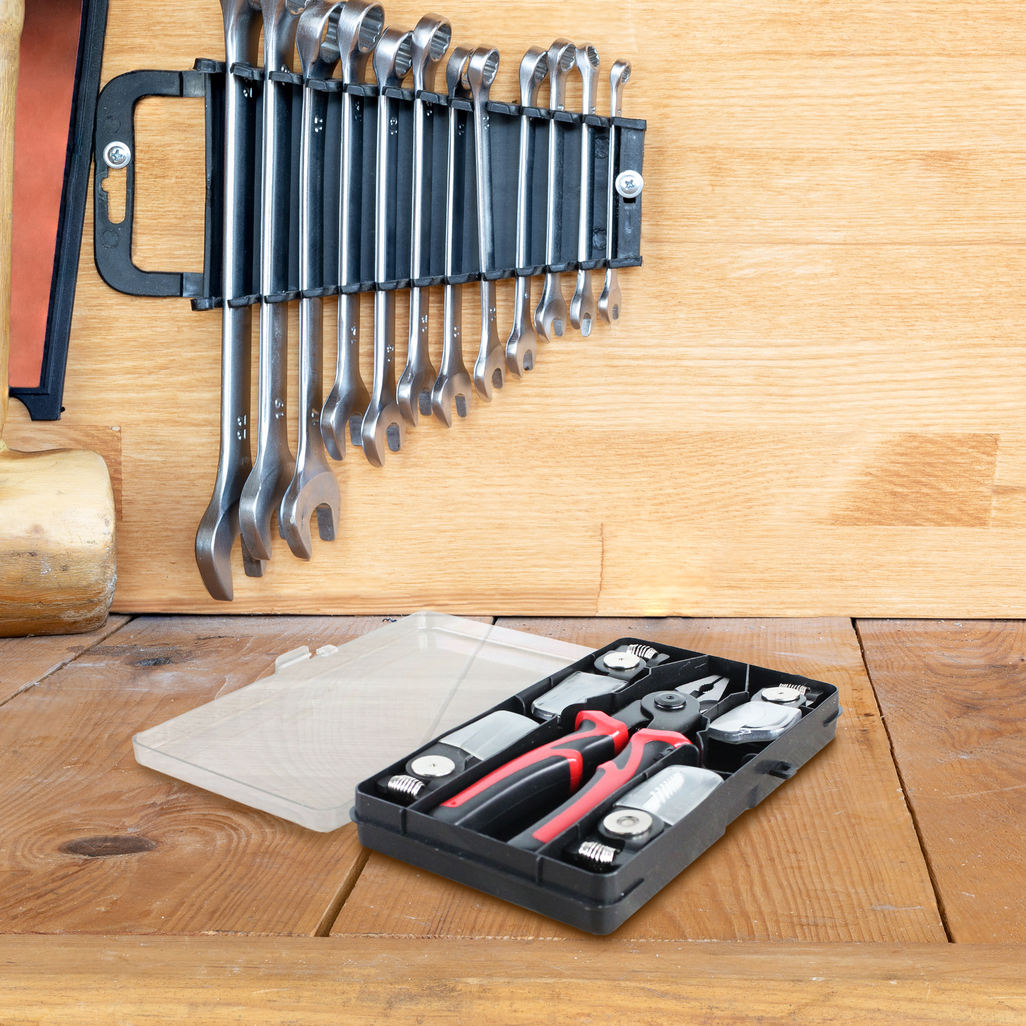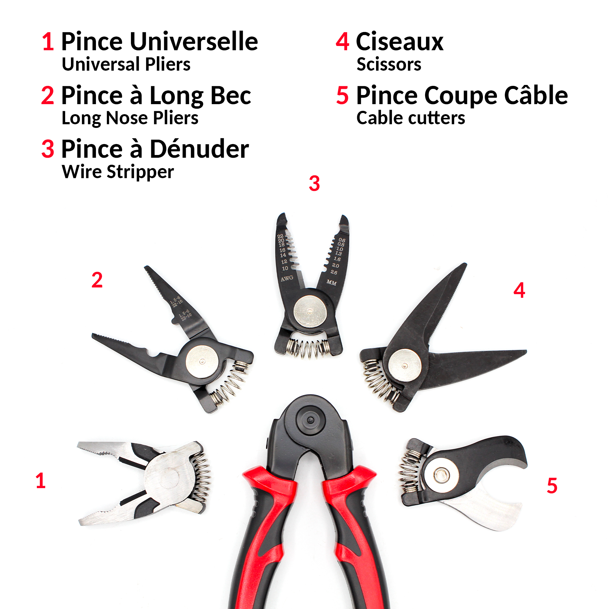 Votre boîte à outils en une seule pince ! Plus besoin de vous encombrer de plusieurs outils au moment de commencer votre bricolage. Cette pince polyvalente vous permet de réaliser la majeure partie de vos petits travaux du quotidien : pincer, plier,couper, dénuder etc… Le secret : une base sur laquelle vous venez très simplement installer la tête dont vous avez besoin. Vous disposez ainsi d’une pince universelle, une pince à dénuder, une pince à long bec, un coupe câble et des ciseaux. Ultra simple d’utilisation, il suffit de serrer les mâchoires de la tête et de l’insérer dans la base pour qu’elle soit fixée en toute sécurité En fonction de leur utilisations les têtes sont fabriquées dans les matériaux les mieux appropriés pour garantir à la fois efficacité et longévité. Pratique, une boîte de rangement permet d’avoir toutes les pièces en un seul endroit Caractéristiques: – Matières: CRV60 (alliage chrome-vanadium/acier), Acier inoxydable (4Cr13), Acier au carbone, TPR (manche), ABS (boîte) – 5 têtes : Ciseaux – pince coupe câble – pince long bec – pince universelle – pince à dénuder. – Poids: 300g