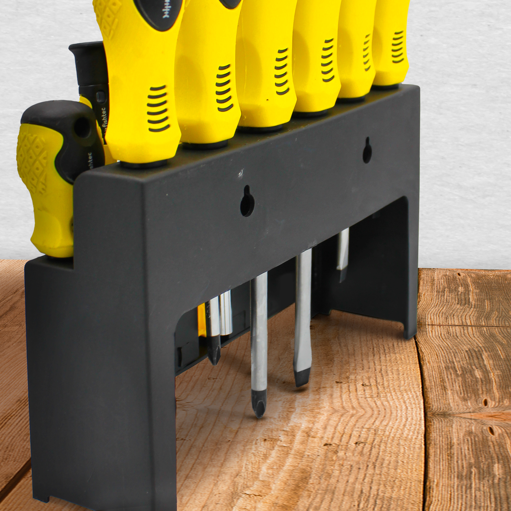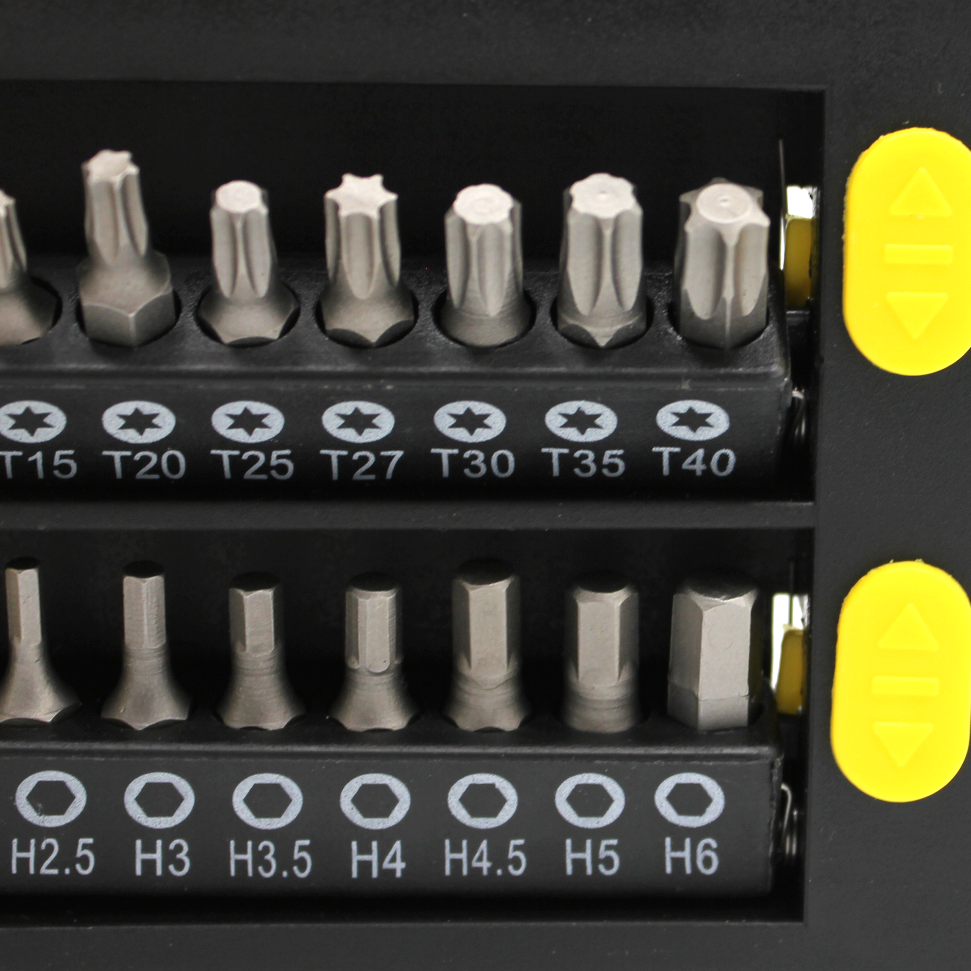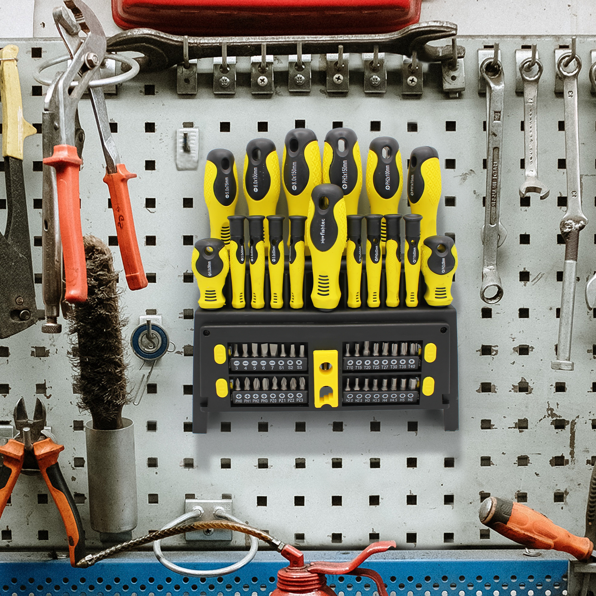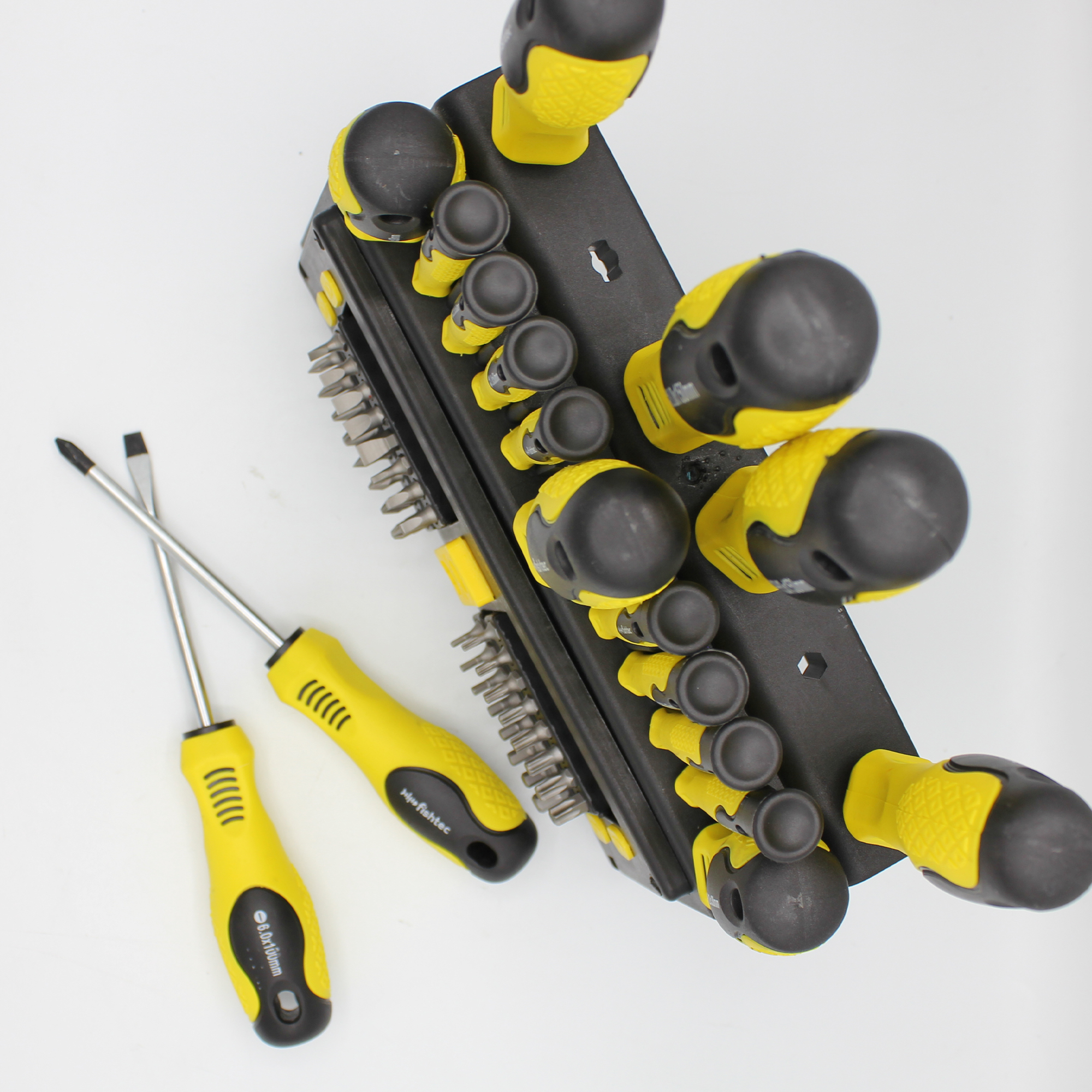 Le kit de tournevis pour tous vos travaux, Ce nouveau kit de tournevis sera l’allié de vos travaux et réparation, composé de 50 pcs, il répondra à tous vos besoins, petits et grands. Le kit est composé de 8 tournevis de bricolage pour les fixations et le gros bricolage, 8 tournevis de précision pour le montage de meuble et vos loisirs, et d’un porte-embout avec 36 embouts pour répondre aux vis les plus particulières. Pratique, le haut des poignées des tournevis de précision sont en rotation libre, pour une utilisation et prise en main facile. Confortables et robustes : les poignées en plastique et caoutchouc de qualité rendent les poignées agréables à utiliser et faciles à tourner Sa boite de rangement vous permet de ranger tous vos tournevis et embouts au même endroit pour ne plus rien perdre. La boîte se pose ou s’accroche au mur pour un gain de place dans votre atelier. Son magnétiseur/ démagnétiseur vous permet de choisir si vous souhaitez que la pointe soit aimantée ou non pour plus de confort lors de votre bricolage. Caractéristiques : – Dimensions 25 x 25 x 7 cm – Poids : 1.4 Kg – Matières : Acier Carbone, TPR, PP – 8 tournevis : Plat : 5×75/ 6,0×100/ 8×150/ 6x38mm, cruciforme: 3×150 / 2×120/ 1×75/ 2x38mm / 8 tournevis de précision : Torx : 6×50/ 8×50/ 10×50, cruciforme : 00×50/ 0x50/ 2×50/ 2,5×50/ 3×50 – Embouts : PH: 0, 1, 2, 3/ PZ : 0, 1, 2, 3/ T: 10, 15, 20, 25, 27, 30, 35, 40/ plat : 3, 4, 5, 6, 7/ S : 1, 2, 3/ H : 2.0, 2.5, 3, 3.5, 4, 4.5, 5, 6.