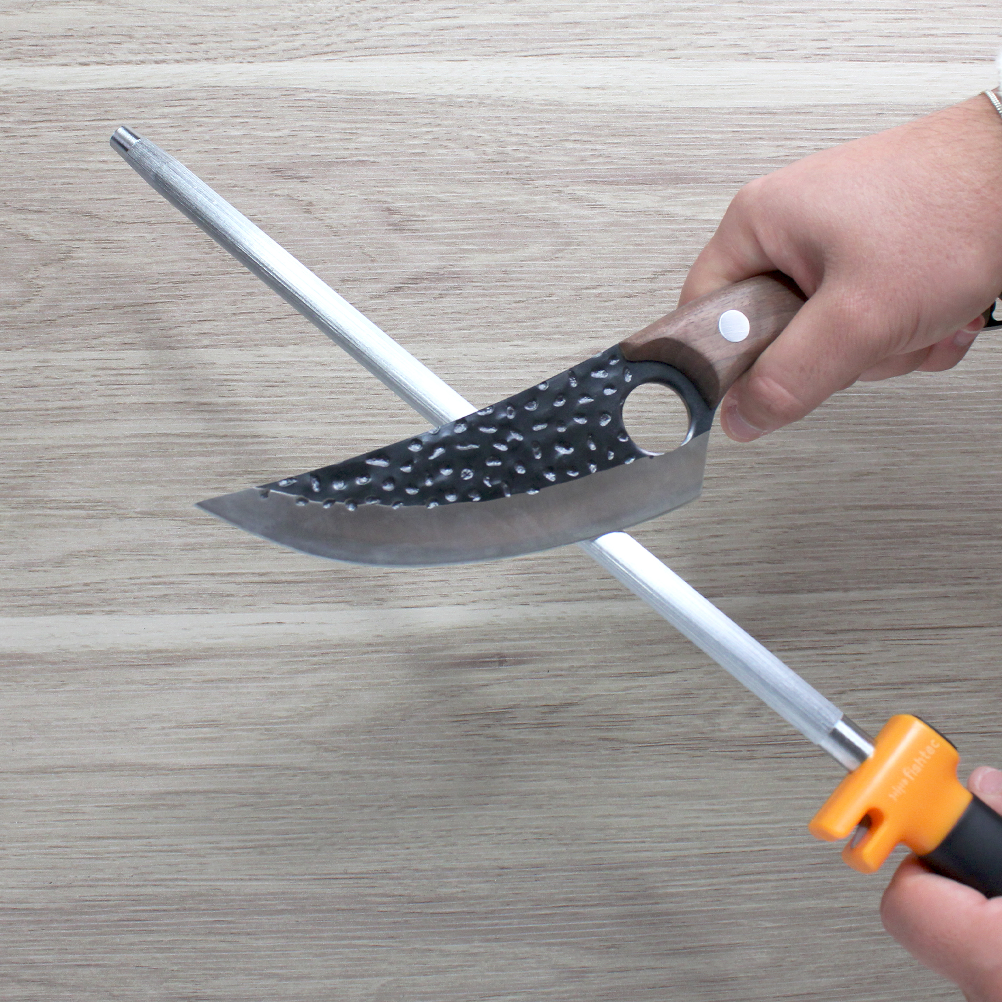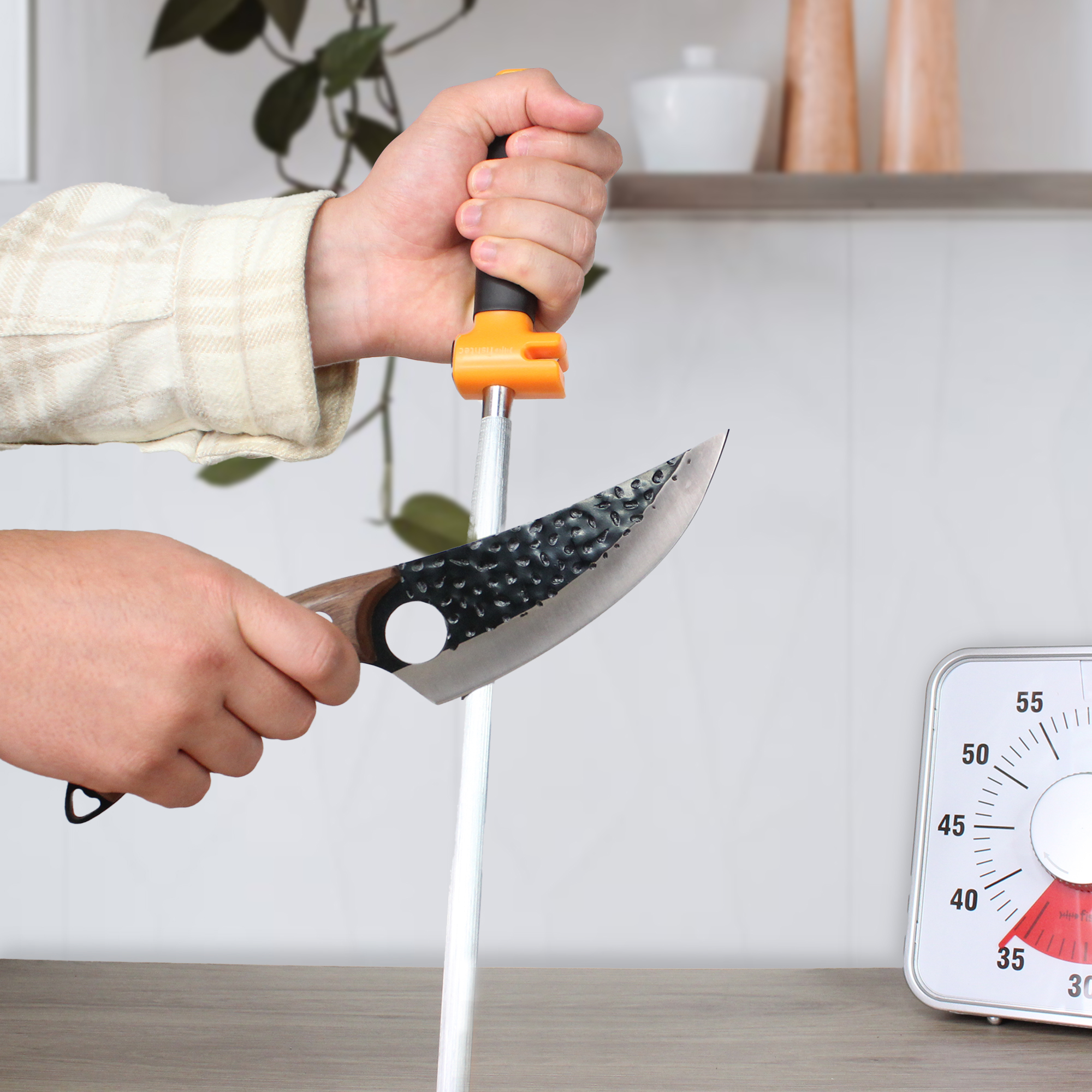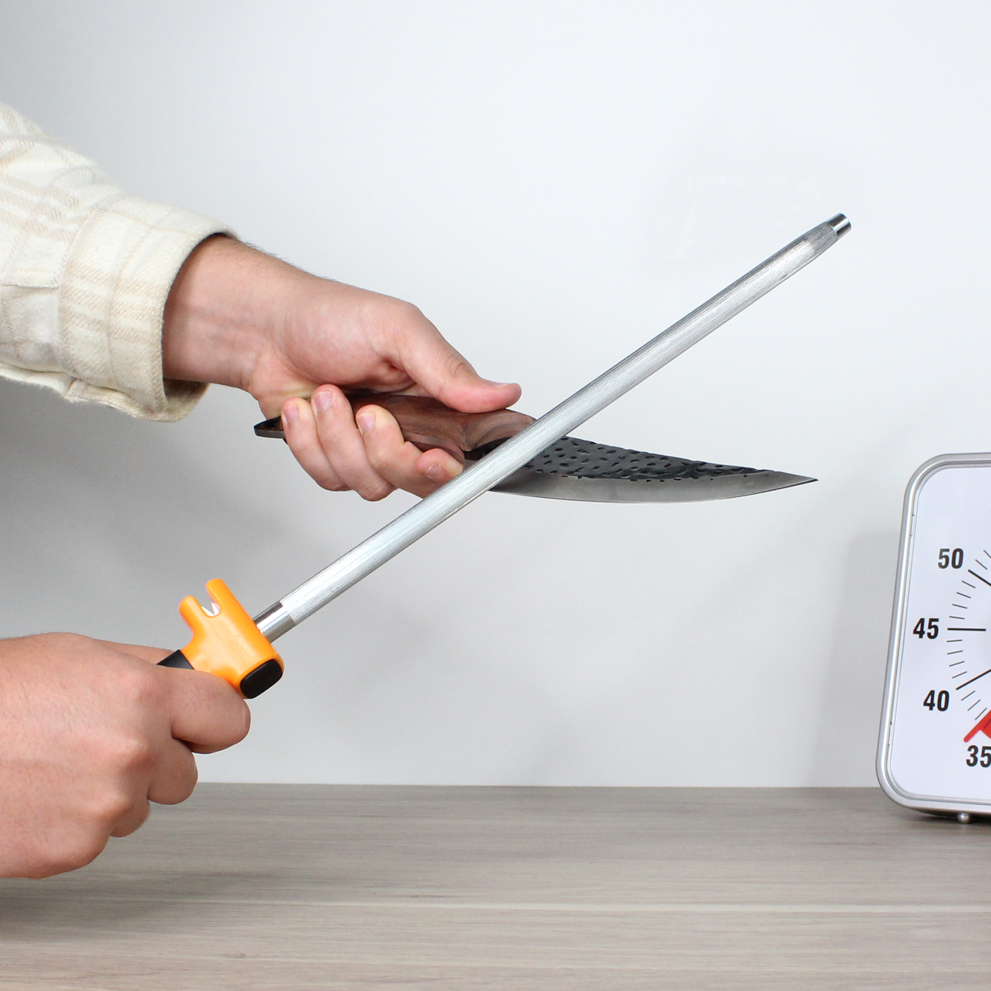 Aiguisez comme un chef ! Tels les bouchers traditionnels ou les grands chefs, aiguisez à la perfection tous vos couteaux grâce à ce fusil à aiguiser. Couteaux de cuisine ou de chasse en métal, aucune lame ne lui résistera. Innovant, ce fusil dispose d’un aiguiseur intégré situé à la base de la mèche. Vous pourrez ainsi y aiguiser vos lames plus courtes sans changer de matériel. Pour votre sécurité, le manche est recouvert d’un revêtement antidérapant. Lors de l’utilisation de l’aiguiseur intégré, l’ensemble est bien stable grâce au tampon antidérapant situé sur le dessous. Fin et léger, il est conçu aussi bien pour les pro que pour les débutants et se range facilement grâce à son crochet. Caractéristiques : – Matières : Acier au carbone (mèche),carbure de tungstène (aiguiseur), ABS,TPE, silicone. – Dimensions : 45.5 x 4.5 x 3.3 cm – Poids : 250 grammes – Certifié LFGB