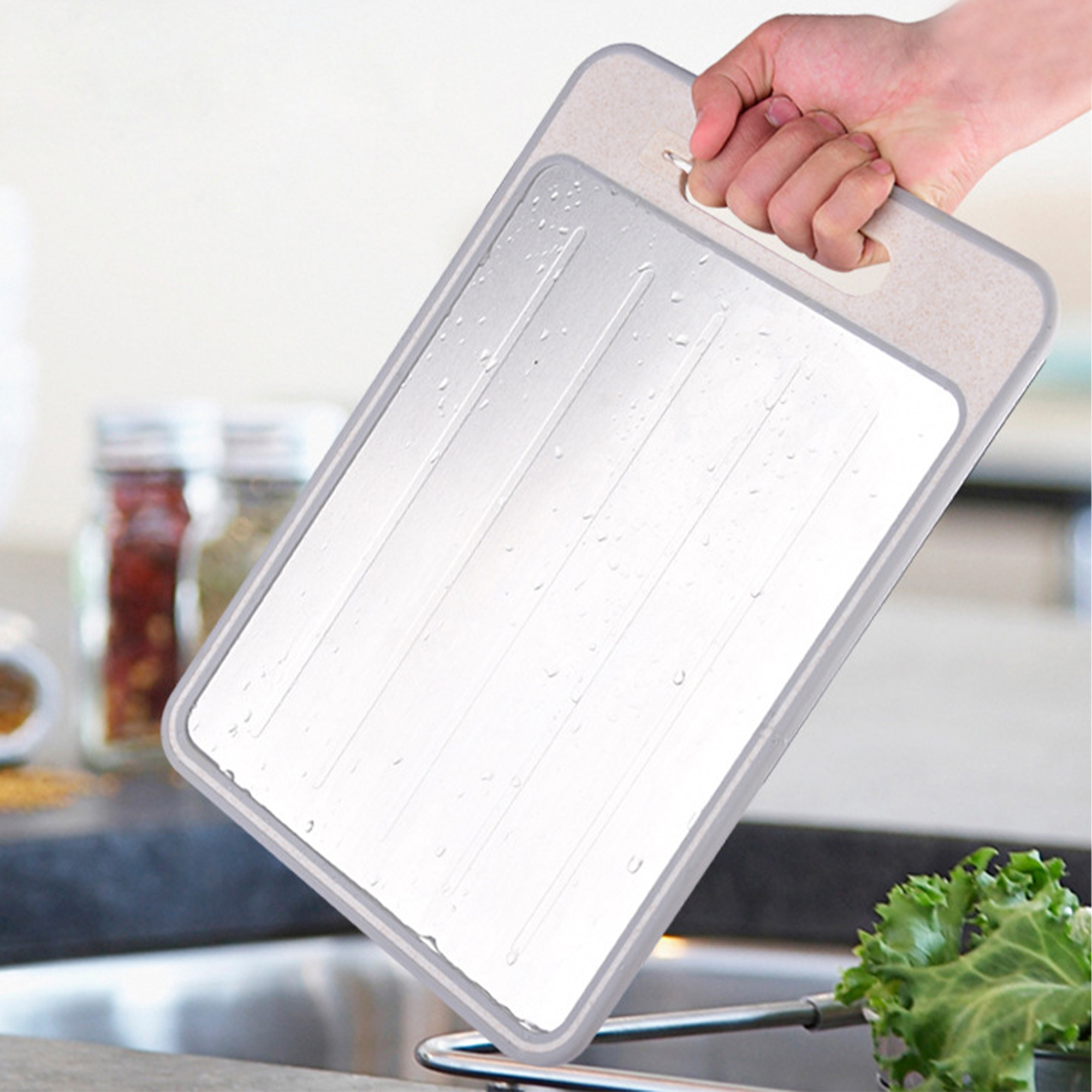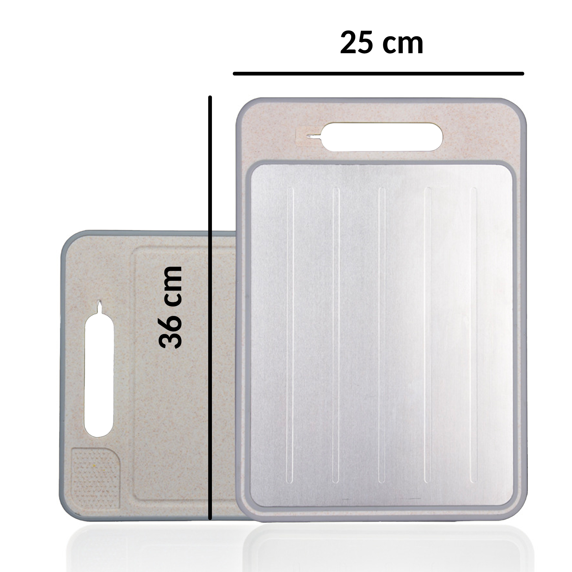 La planche indispensable dans votre cuisine ! Cette planche sera votre plus précieux allié dans la cuisine. Grâce à elle, vous pourrez décongeler, couper, aiguiser et râper ! Une face de la planche est réservée à la décongélation. Elle est recouverte d’une plaque en aluminium qui permet de décongeler vos aliments en un temps record tout en en préservant les saveurs. L’autre face est dédiée à la préparation de vos aliments. Elle est constituée d’une grande planche à découper en plastique résistant mais respectueux de vos lames. Dans un angle se trouve un espace pour gratter ail, le zest d’un citron ou encore du gingembre. Astuce supplémentaire, un aiguiseur se cache dans le creux de la poignée, vous permettant d’affûter votre lame avant de découper vos aliments. Pratique, la planche dispose d’une rigole d’écoulement et d’une poignée pour une utilisation et un rangement facile. Caractéristiques: – Matières : Aluminium, Plastique TPR, – Dimension : 25.1 X 36.5 X 1 cm – Poids 0.700 Kg – Certifiée LFGB sur les deux surfaces – Livrée sous polybag