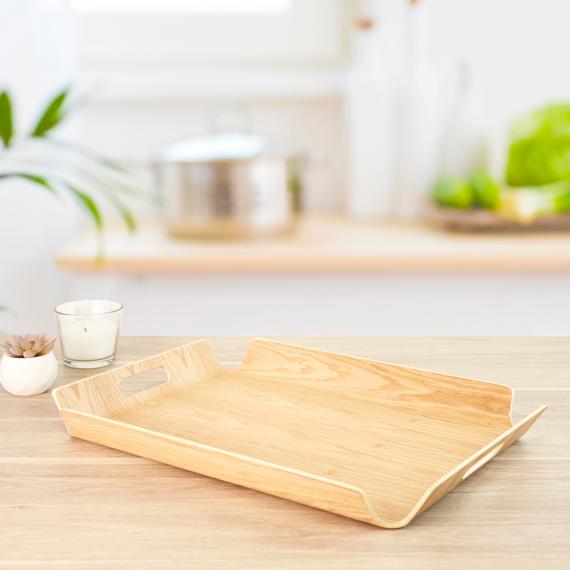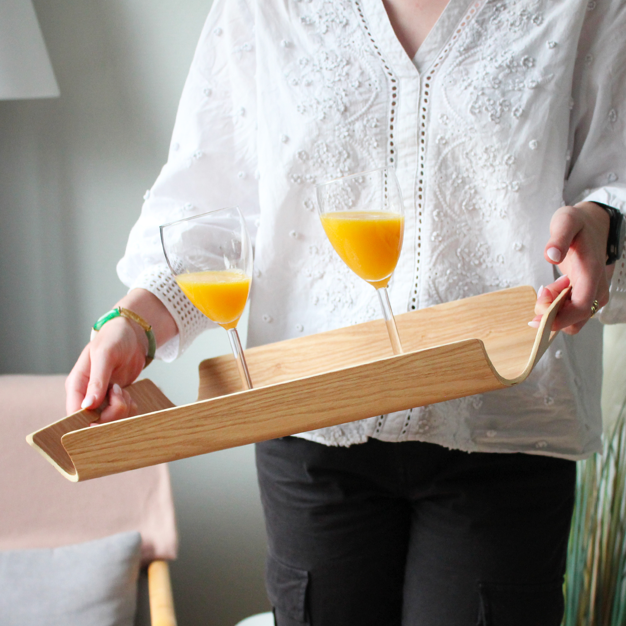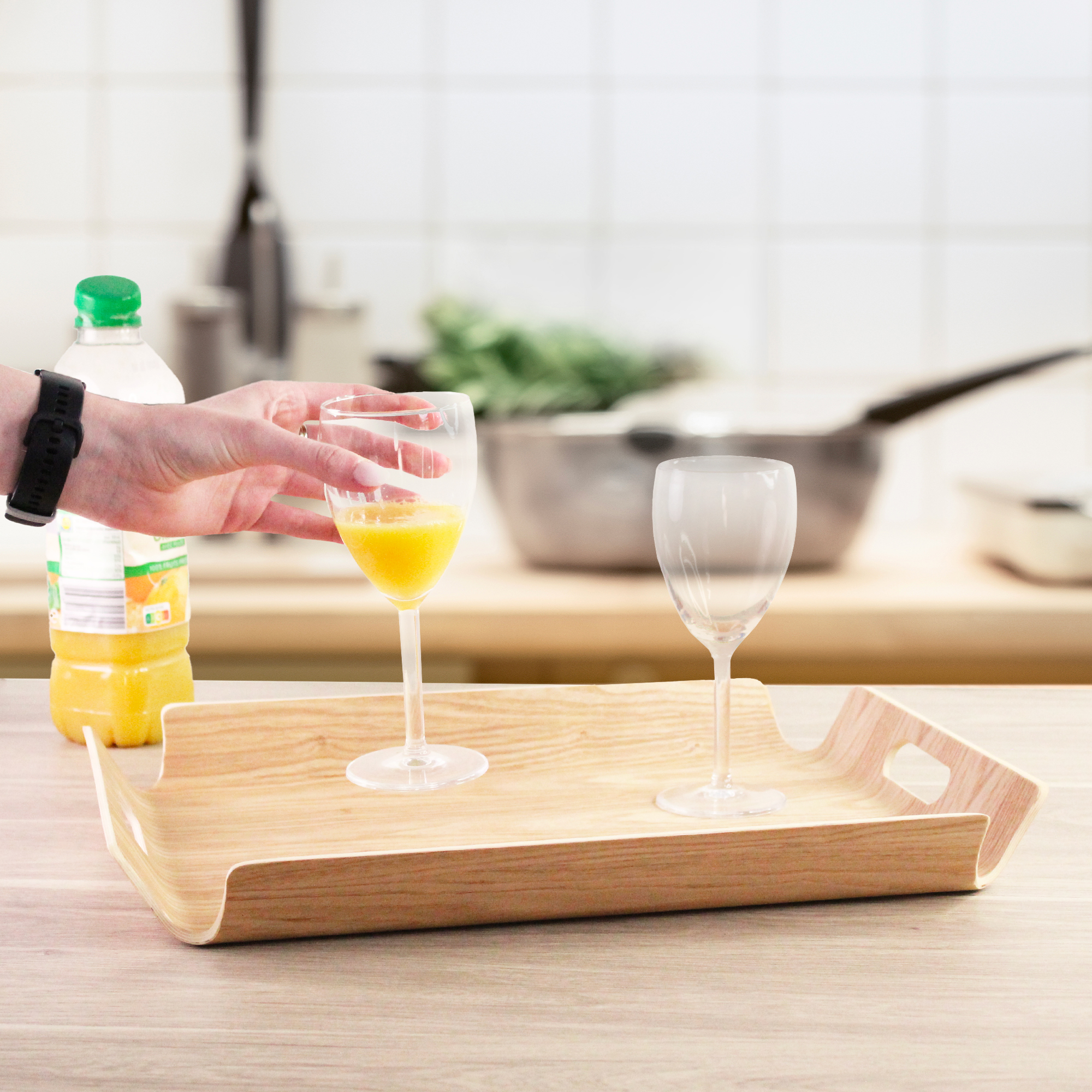 Terminés les verres ou les assiettes qui valsent d’un côté à l’autre du plateau ! Ce plateau vous permettra de servir et desservir vos tables en toute sécurité et avec élégance. Fabriqué en bois massif, ce plateau aux courbes délicates est à la fois esthétique et pratique. Le revêtement antidérapant transparent qui recouvre entièrement le dessus du plateau permet de maintenir parfaitement en place ce qui s’y trouve. Les objets qui y sont posés restent stables jusqu’à 30° d’inclinaison et les 2 poignées évidées permettent une prise en main optimale. Caractéristiques : – Matières : Frêne de Mandchourie, revêtement PU – Dimensions : 44 x 33 x 5 cm – Poids : 600 g