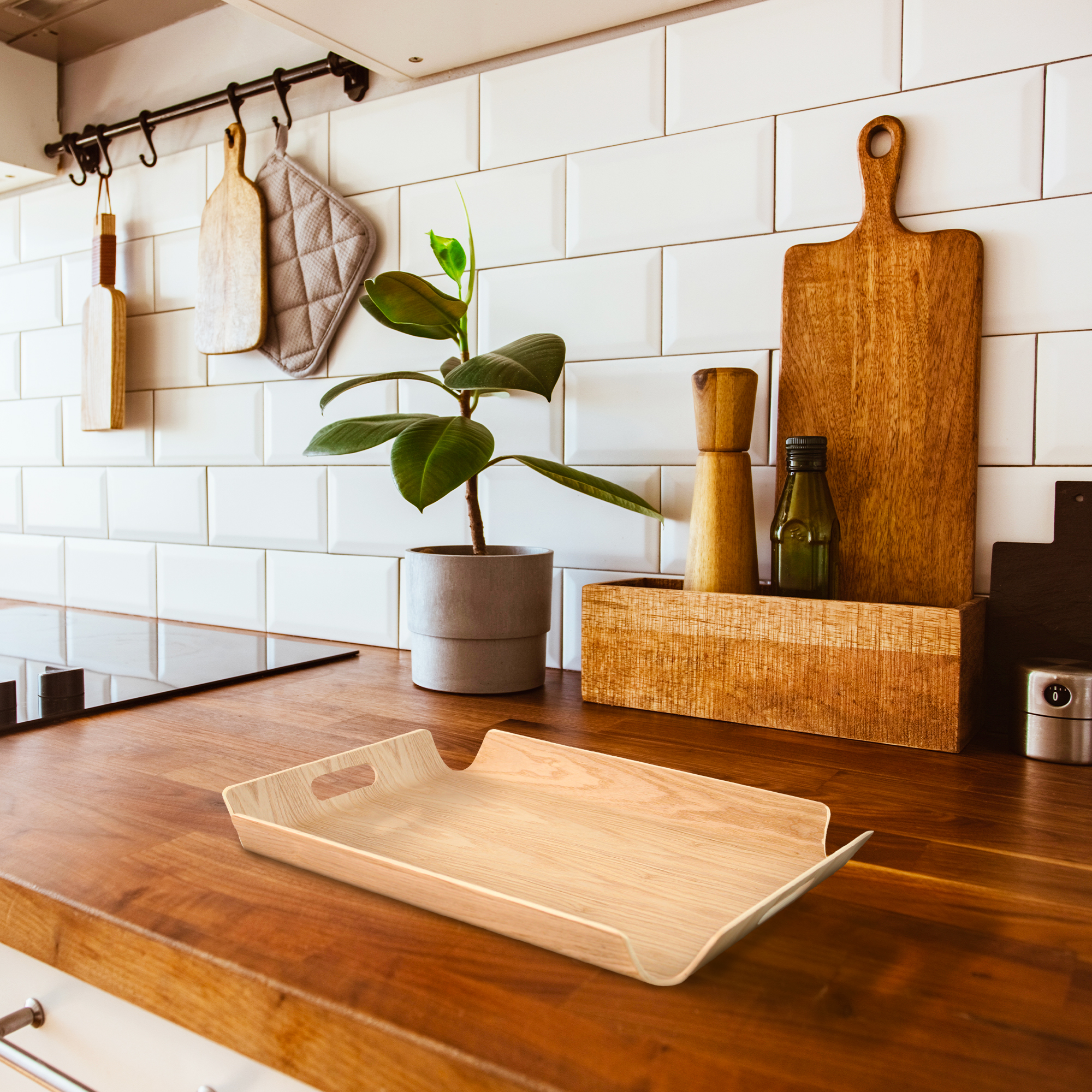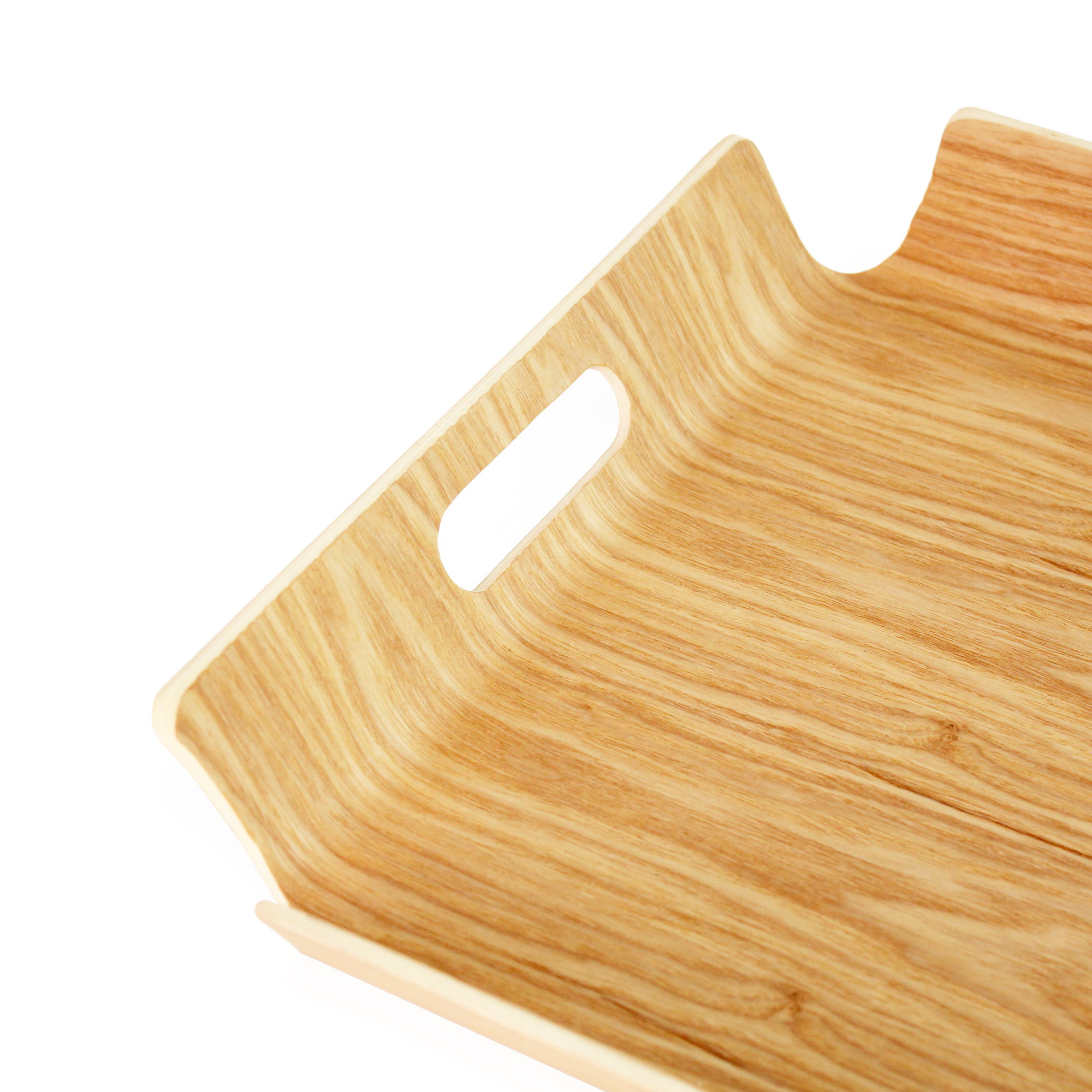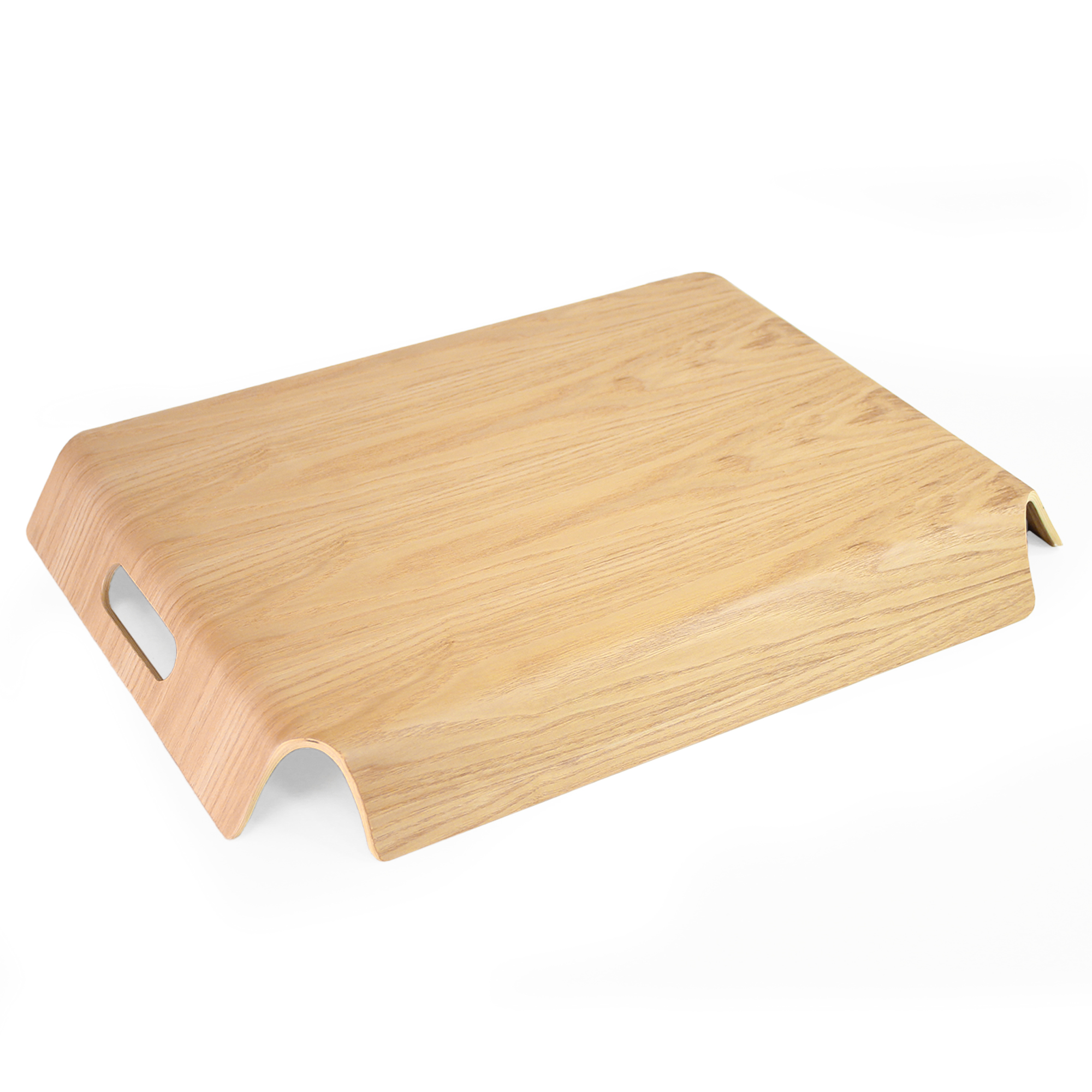 Terminés les verres ou les assiettes qui valsent d’un côté à l’autre du plateau ! Ce plateau vous permettra de servir et desservir vos tables en toute sécurité et avec élégance. Fabriqué en bois massif, ce plateau aux courbes délicates est à la fois esthétique et pratique. Le revêtement antidérapant transparent qui recouvre entièrement le dessus du plateau permet de maintenir parfaitement en place ce qui s’y trouve. Les objets qui y sont posés restent stables jusqu’à 30° d’inclinaison et les 2 poignées évidées permettent une prise en main optimale. Caractéristiques : – Matières : Frêne de Mandchourie, revêtement PU – Dimensions : 44 x 33 x 5 cm – Poids : 600 g