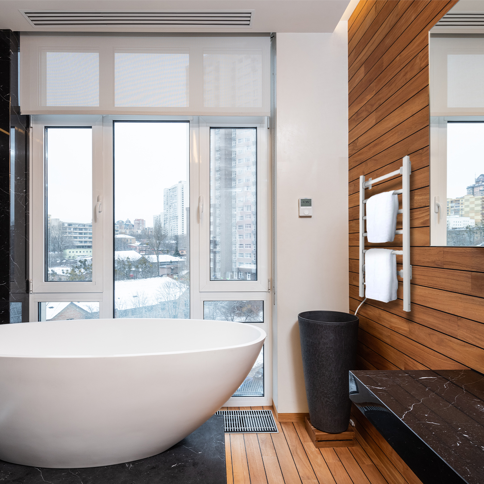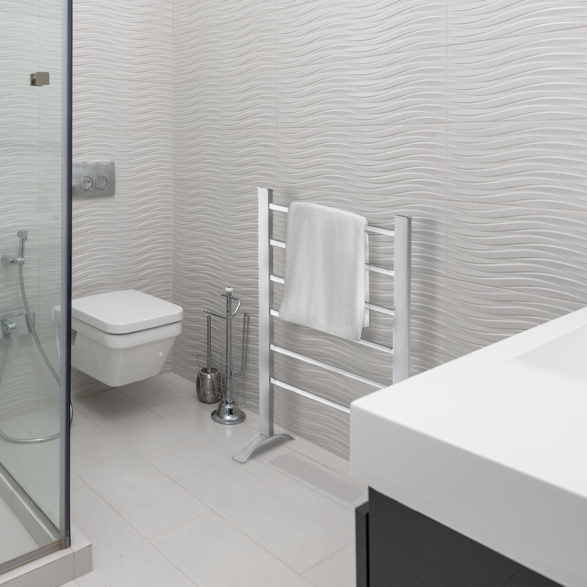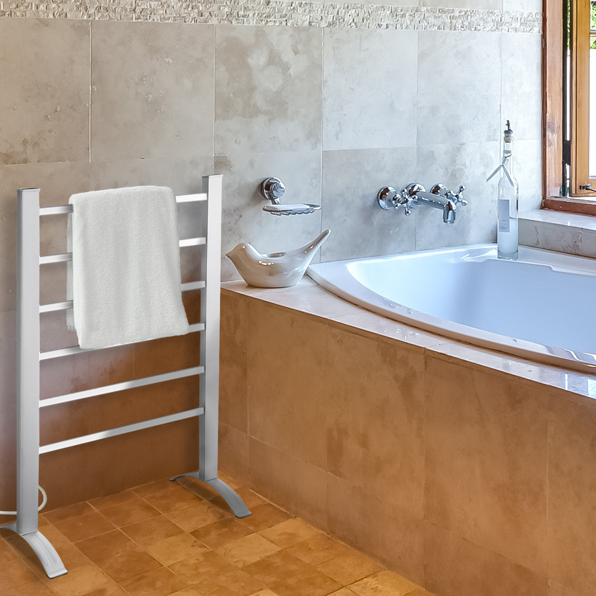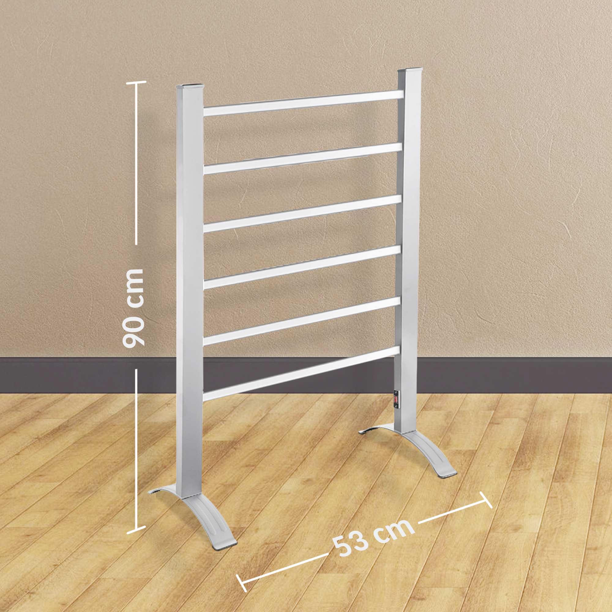 Rien de tel qu’une serviette bien chaude à la sortie du bain Ce porte serviettes est ultra léger (moins de 2 kg !) et compact. Il est facile à installer dans votre salle de bains ou votre chambre. Élégant, ce porte serviettes 100% aluminium très pratique séchera vos serviettes ou vos vêtements avec une efficacité redoutable grâce à sa puissance de 100W. Il est sécurisé grâce à son thermostat interne et son témoin lumineux marche/arrêt. Caractéristiques : – Matière : Aluminium – Dimensions white box : 54 x 4x 87 cm – Alimentation : câble de 1.2m avec prise AC/DC – 220-240V – 50 Hz – Certifié CE, RoHS, GS, Reach