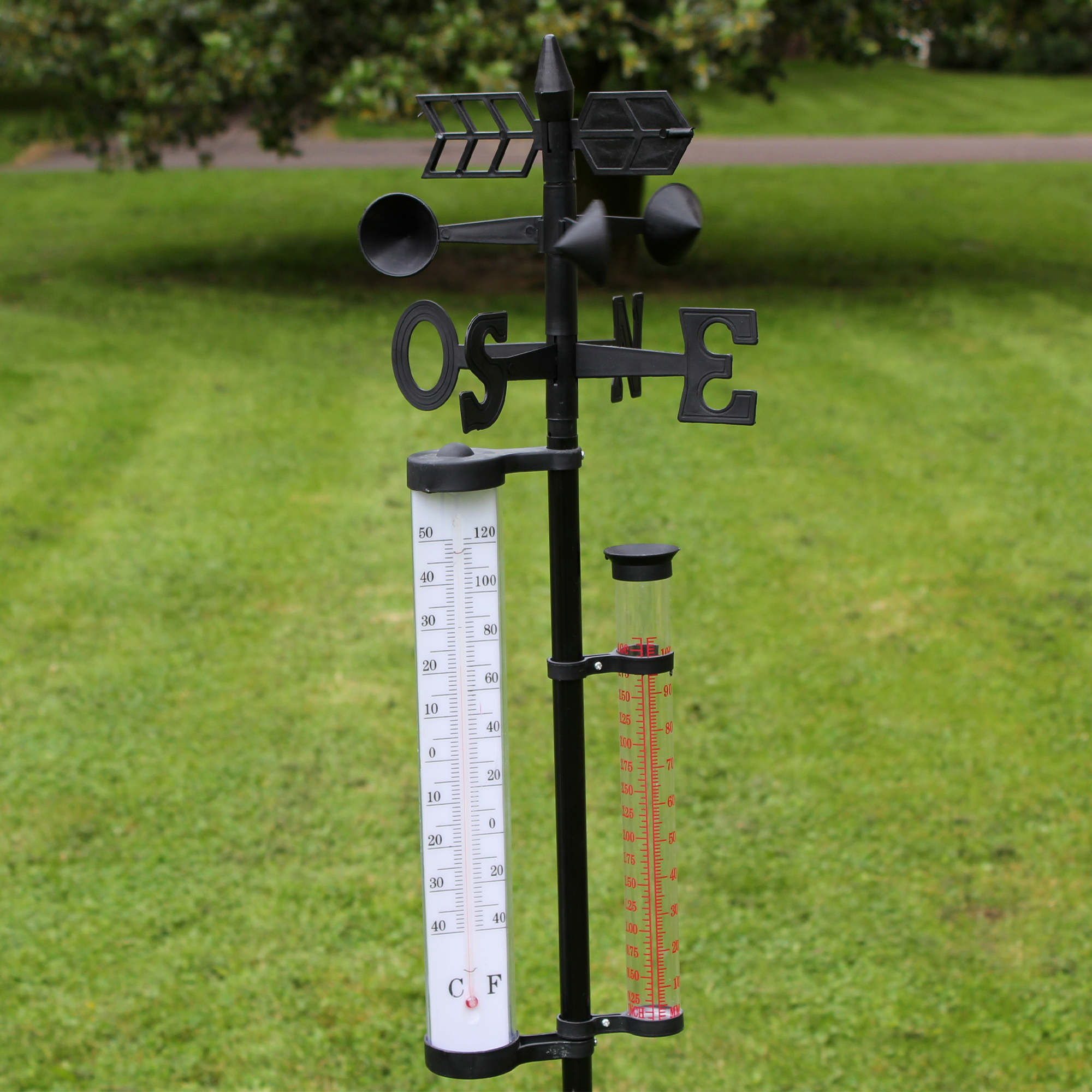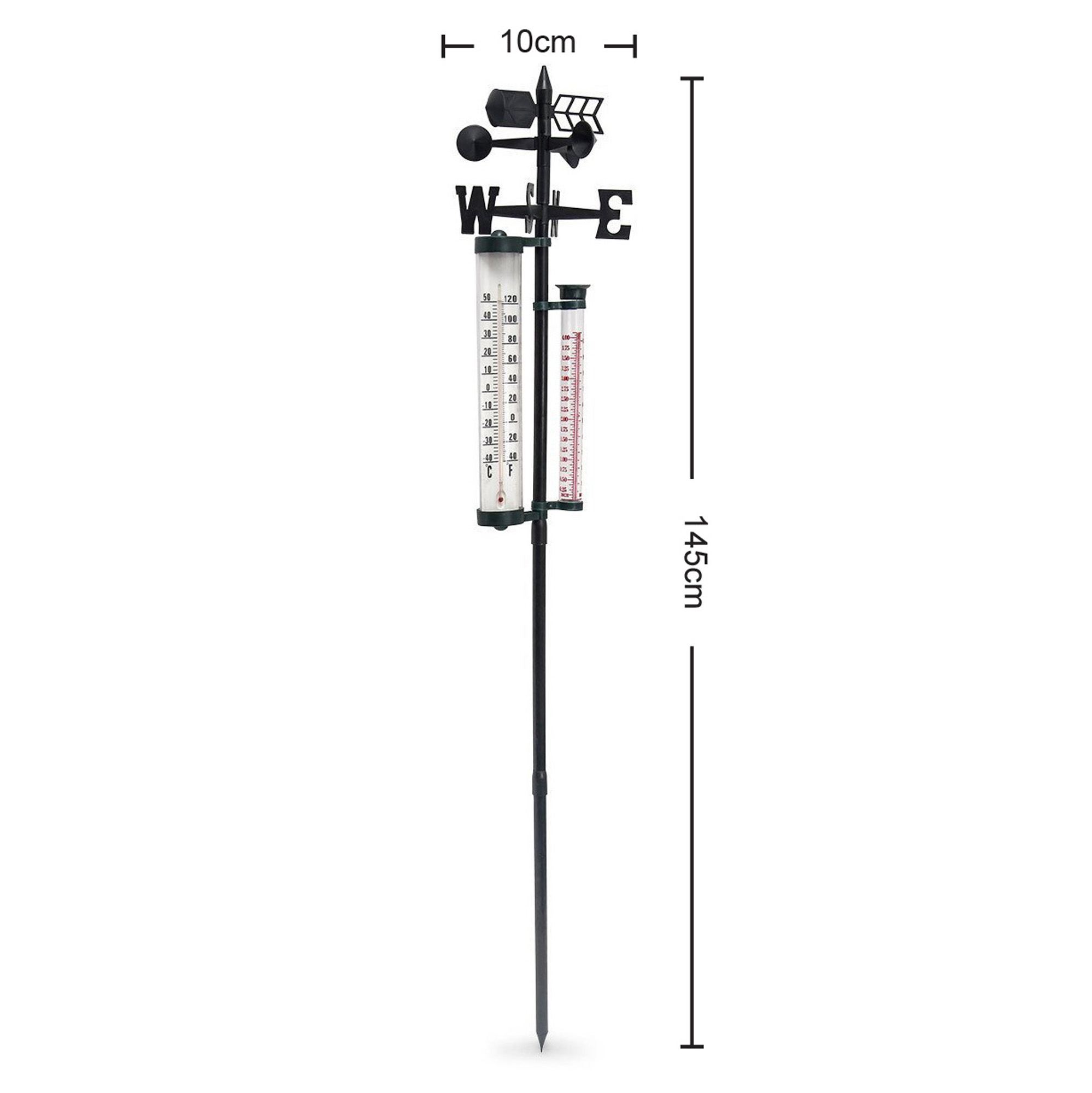 Cette station météo de jardin se pique dans le sol. Le thermomètre se lit facilement de loin. Le pluviomètre vous indiquera la quantité d’eau tombée dans la nuit ou bien dans la semaine. La girouette vous indique la direction du vent. Le capteur rotatif vous permet d’évaluer visuellement la force du vent. Pied en plastique. Les tubes où sont disposés les éléments sont en plastique.