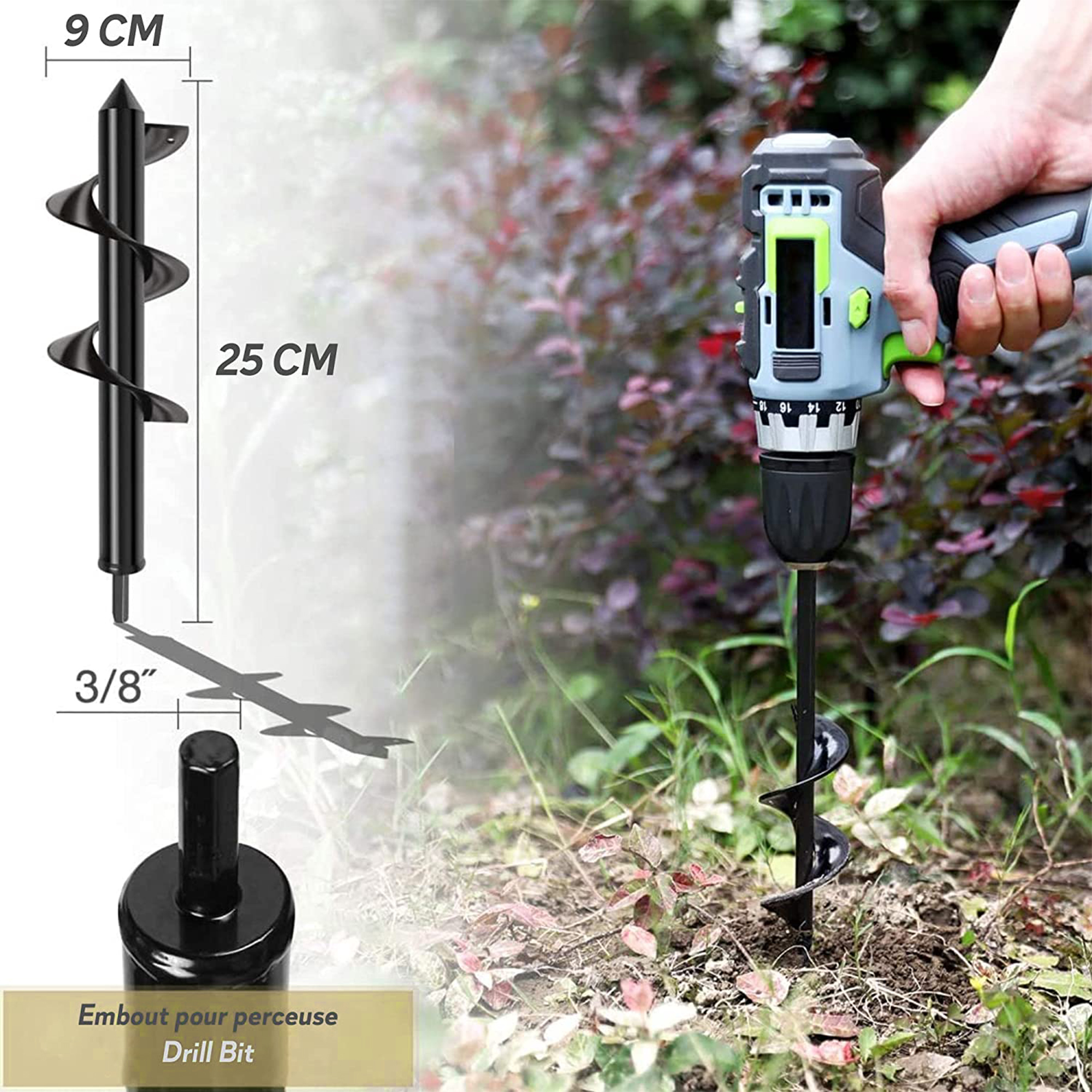 Savourer les fruits et légumes de votre potager ou admirer les massifs de votre jardin sont des moments de plaisir intense. Mais pour en arriver là, il vous aura fallu des heures de travail. Certains travaux sont longs et fatigants. Simplifiez-vous la tâche avec ce foret de tarière qui creusera à votre place les trous dans votre sol. Vous pourrez ainsi planter facilement vos bulbes de fleurs, de petits arbustes, des semis ou encore préparer les lignes de votre potager ou planter des piquets. Simple d’utilisation, il suffit d’installer le foret sur une perceuse sans fil et le tour est joué ! Caractéristiques : – Matière : Acier – Dimensions : – Longueur 25 cm – Ø de forage : 9 cm – Ø du tube : 2.5 cm – Épaisseur des lames : 2.2 mm – Mèche pour mandrin : 8 mm – Poids : 470 g