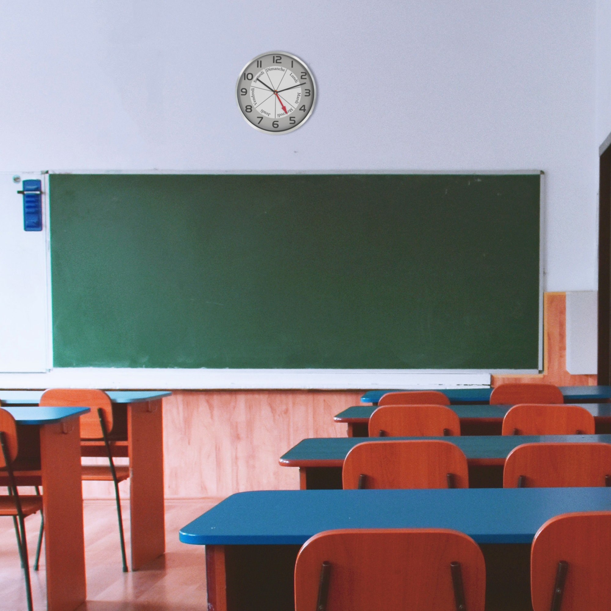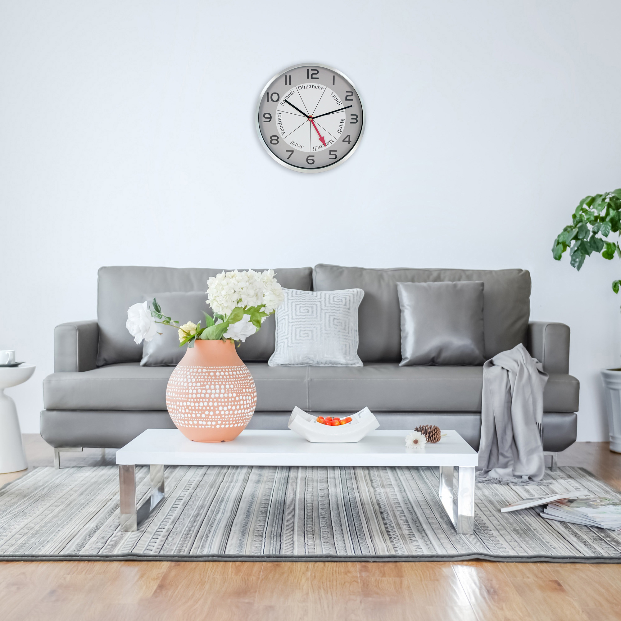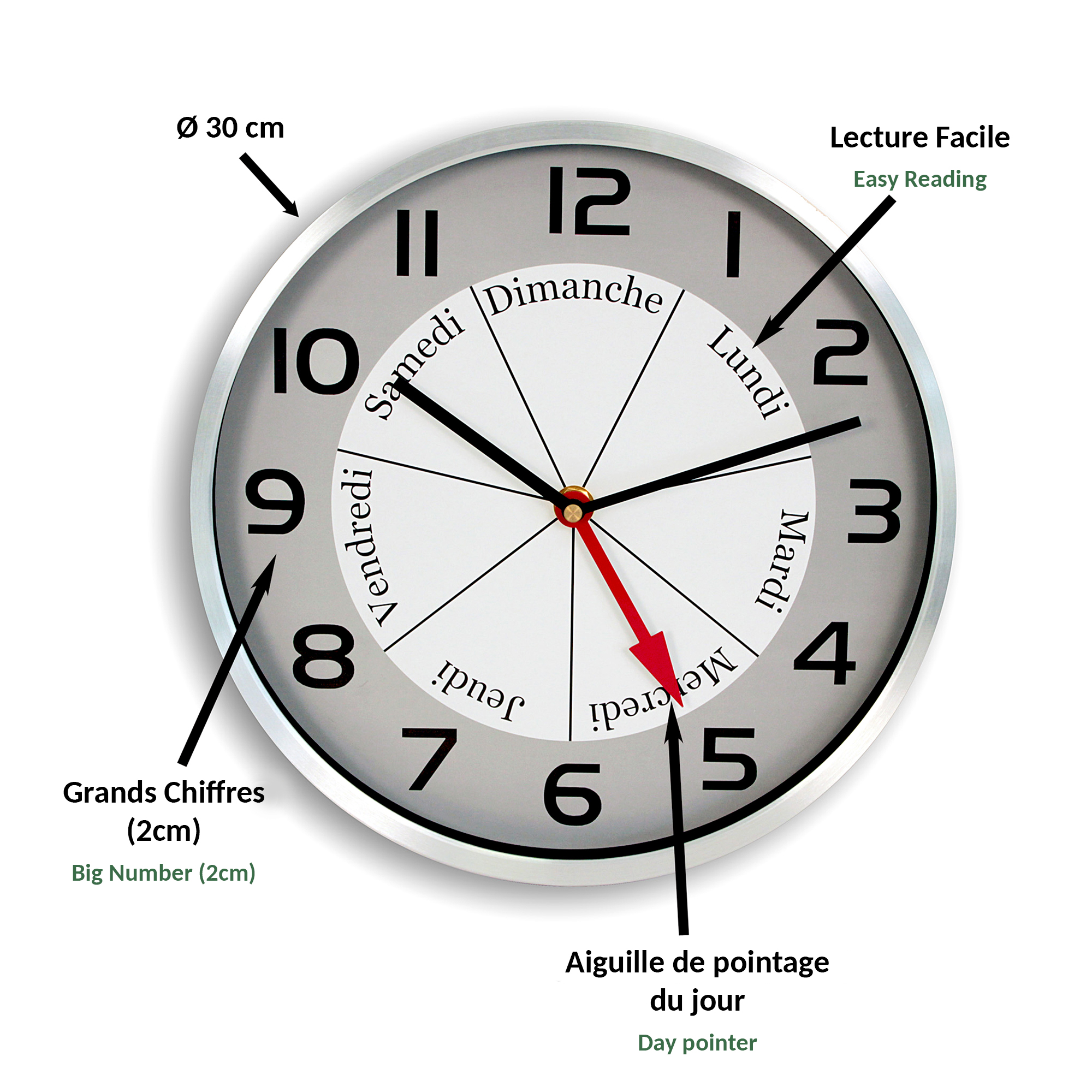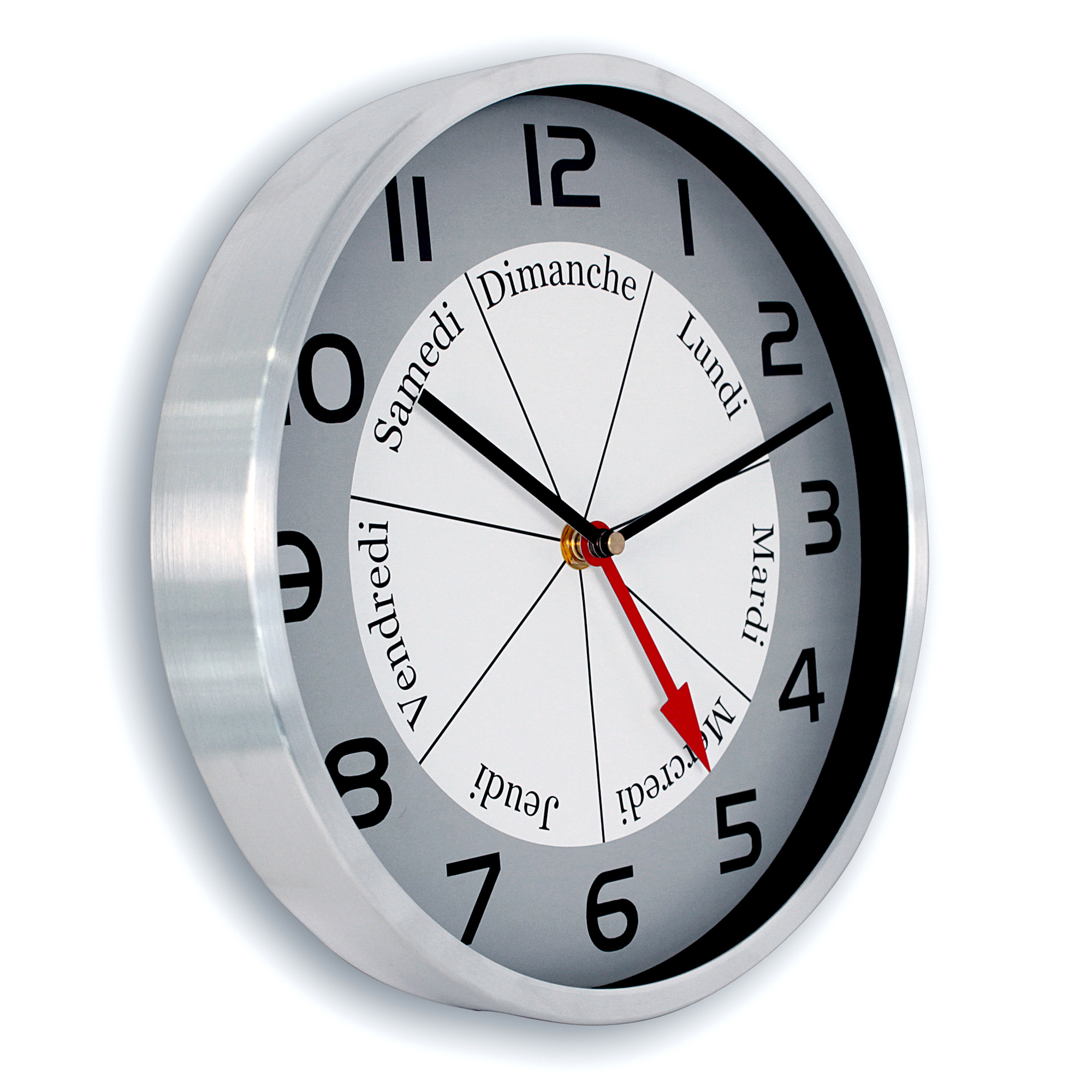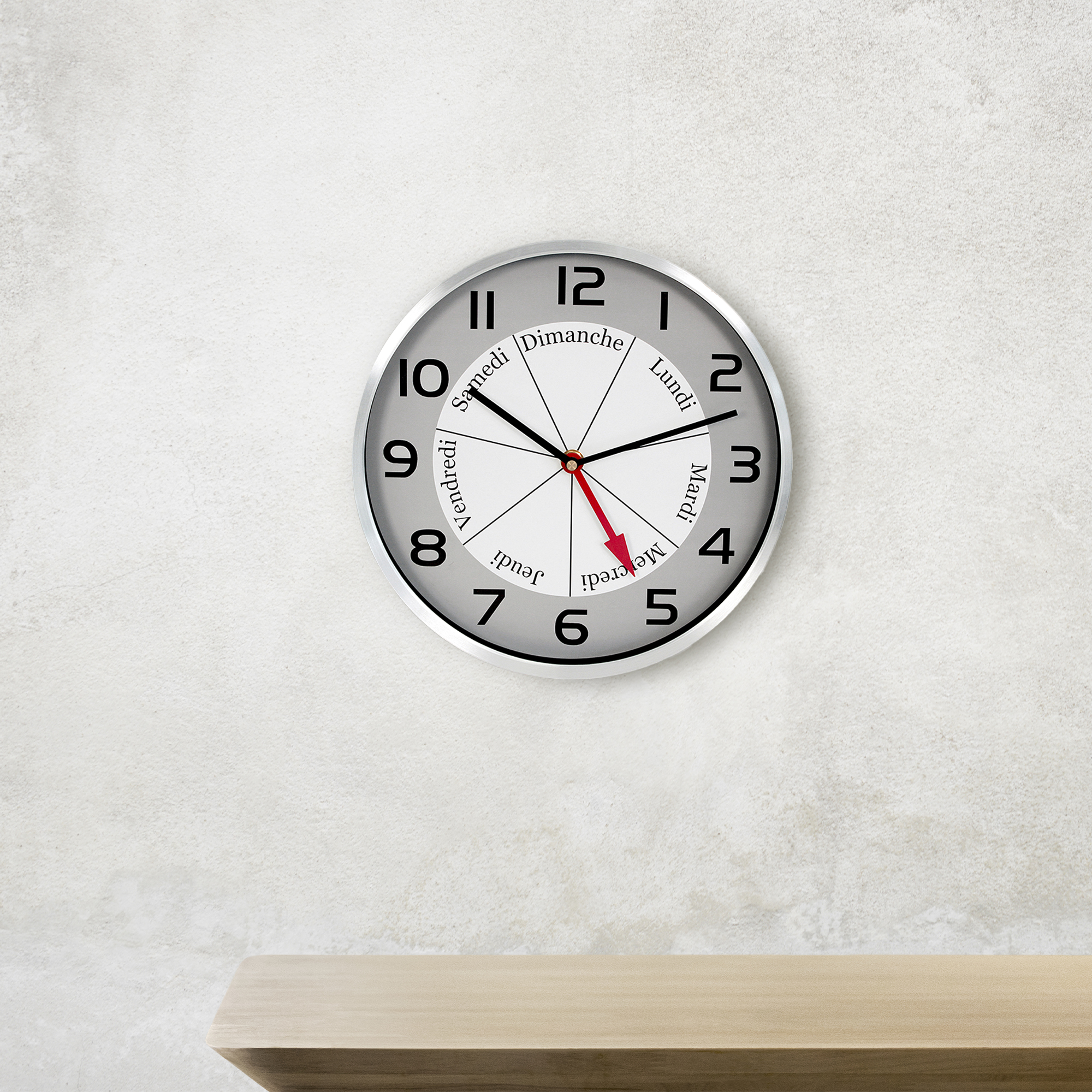 Marché le mardi, petits-enfants le mercredi et bridge le samedi ? Ne ratez plus vos rendez-vous quotidiens grâce à cette horloge qui vous indique le jour de la semaine. Bien lisibles, les jours sont inscrits autour du cadran et une aiguille rouge pointe directement sur le bon jour. Le cadre aluminium donne une touche de modernité à cette horloge qui s’intégrera parfaitement à votre intérieur. Caractéristiques : – Matières : Cadre aluminium, plastique – Dimensions : Ø 30 cm x 4 cm – Alimentation : 1 pile AA (non incluse) – Certifié CE, RoHS