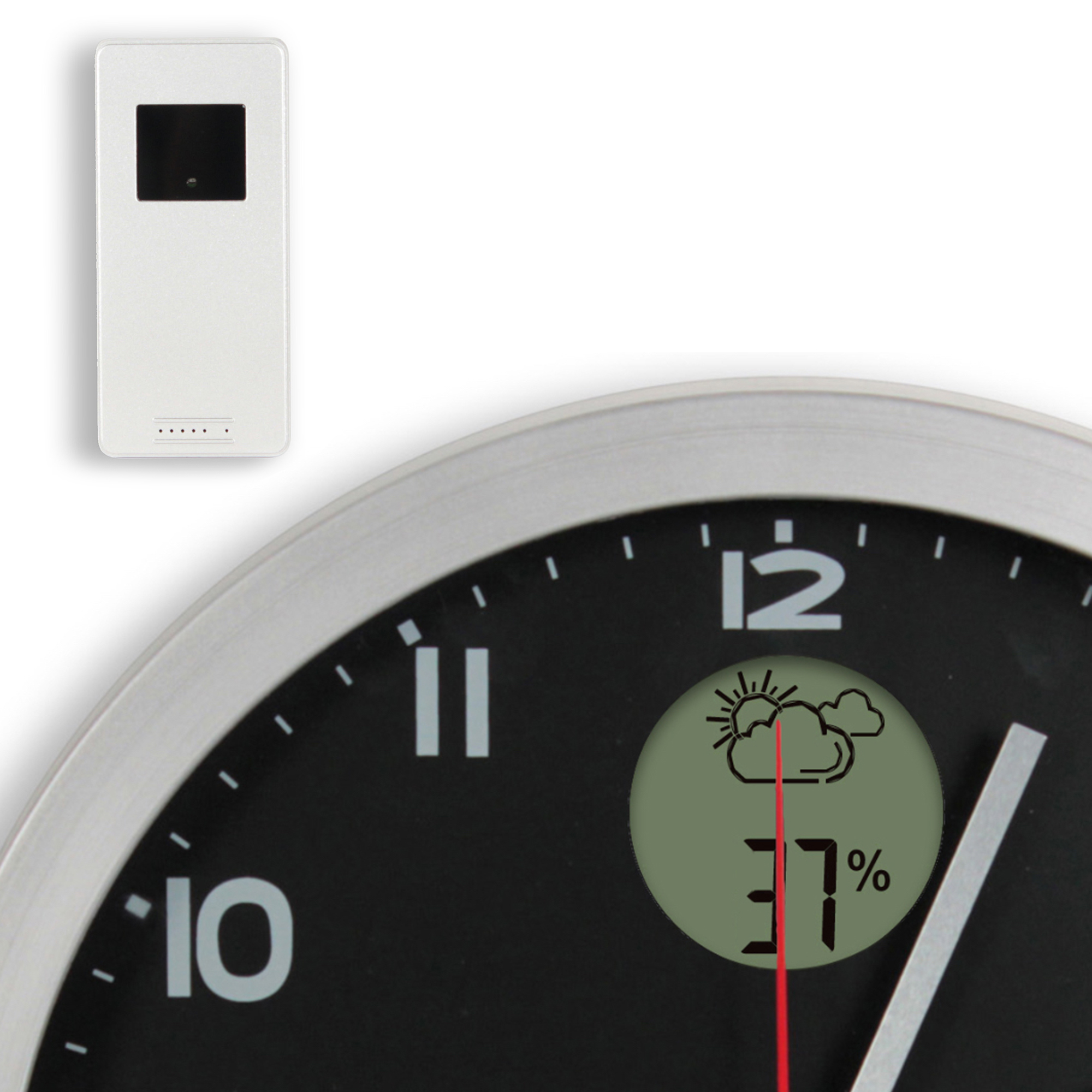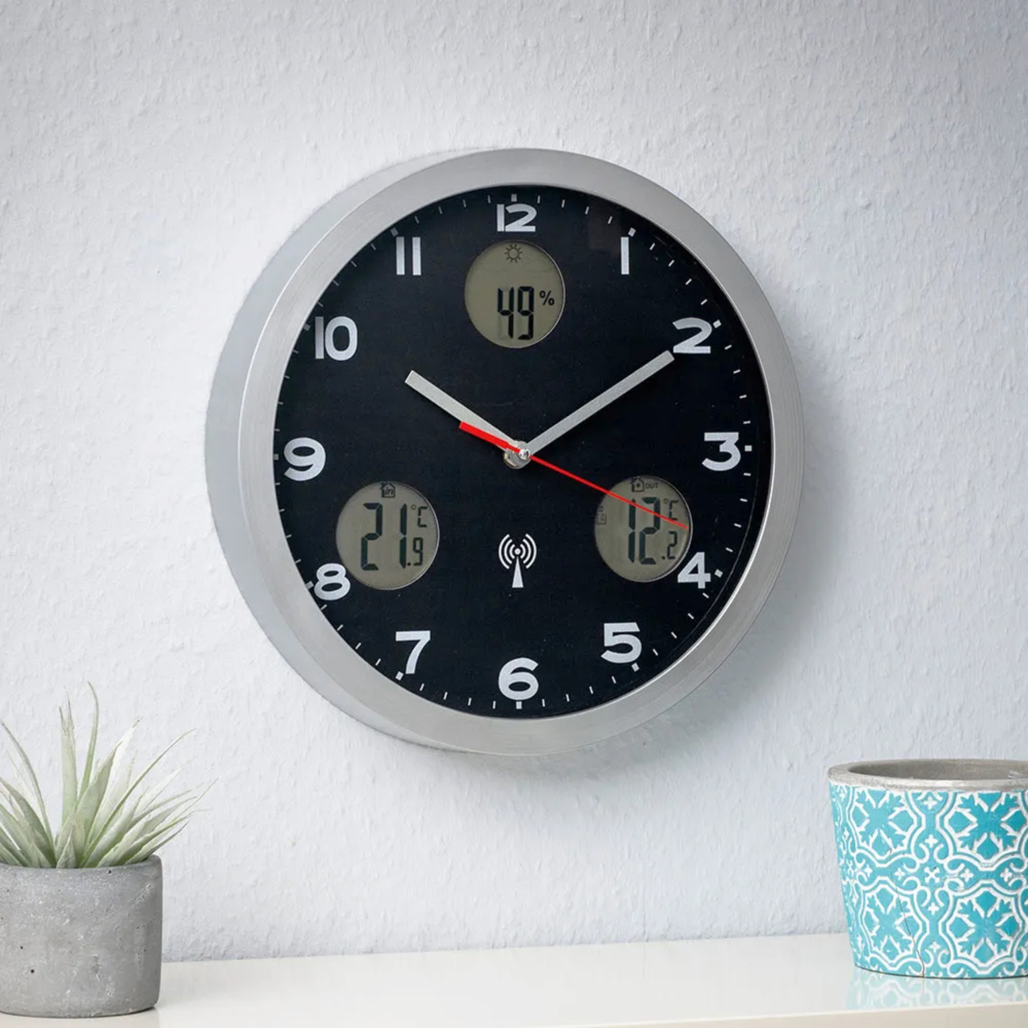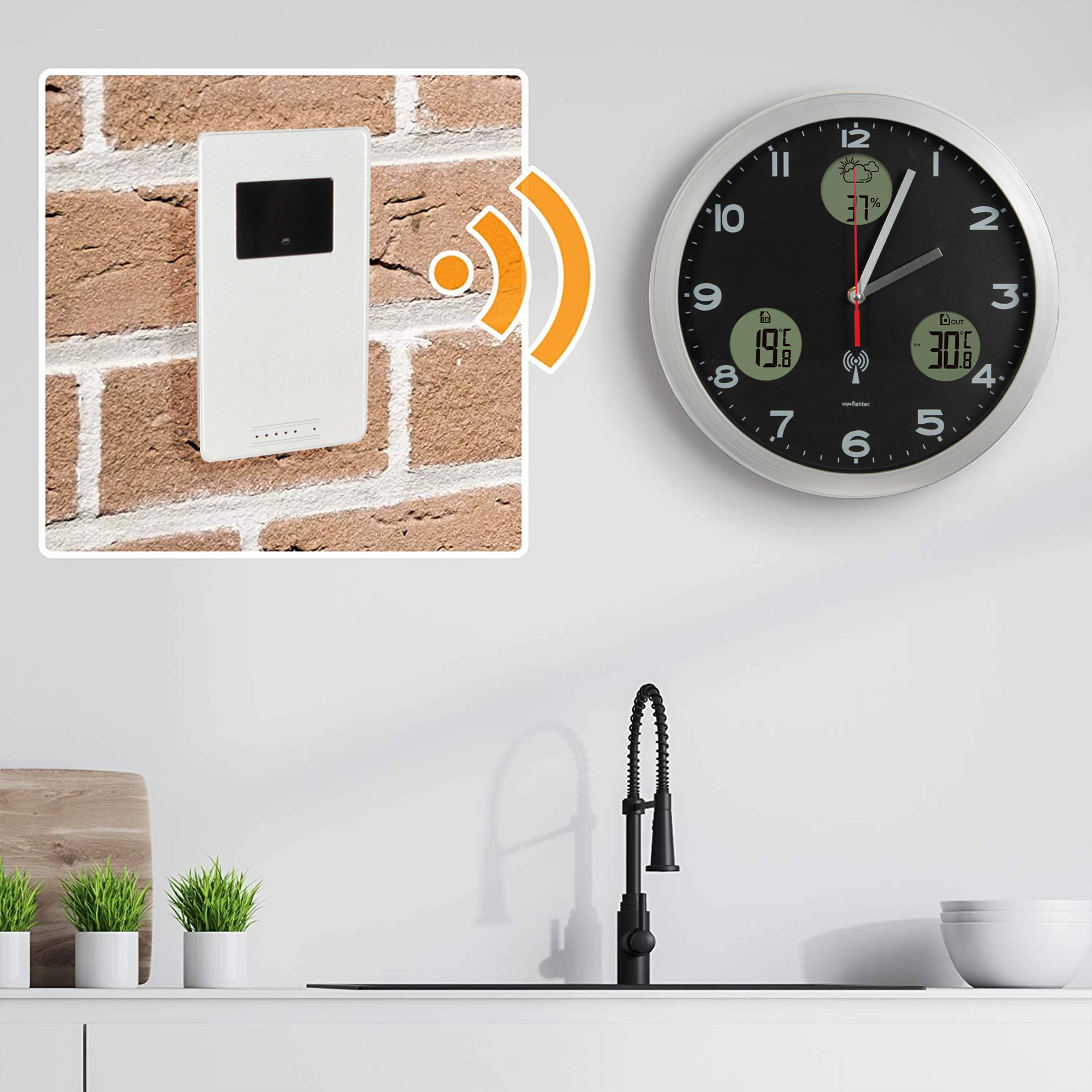 Toutes les informations essentielles en un coup d’œil ! Cette magnifique horloge vous offre un large éventail d’informations. Bien évidemment elle vous indique l’heure et comme elle est radiopilotée, elle vous assure une précision optimale, se met à l’heure seule et passe les heures d’hiver et d’été automatiquement. 3 écrans LCD vous donnent des informations précieuses sur la météo. Le premier écran indique la prévision météo sous forme de pictogramme ainsi que le taux d’humidité intérieur, le deuxième écran indique la température intérieure et le troisième vous donne la température extérieur grâce au capteur inclus. Ainsi en un coup d’œil vous lisez l’essentiel des informations météo locales dont vous avez besoin. Cadre, aiguilles et chiffres sont en coloris métal pour une élégance parfaite. Les grands chiffres assurent une lecture aisée de l’heure. Caractéristiques : – Matières : plastique (cadre), verre (vitre) – Dimensions : Ø 30 cm x 4 cm – Alimentation : 3 pile AA (horloge) + 2 piles AAA (capteur) non incluses – Certifiée CE, RoHS, RED
