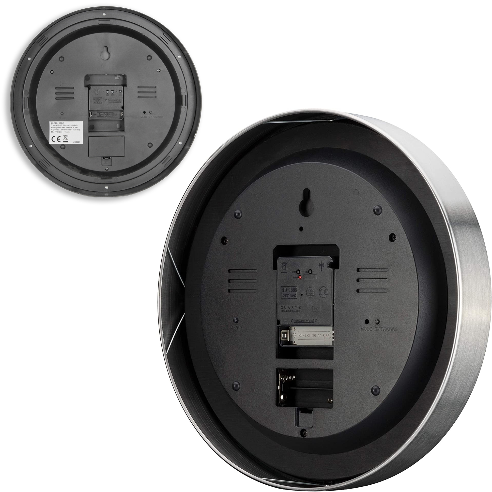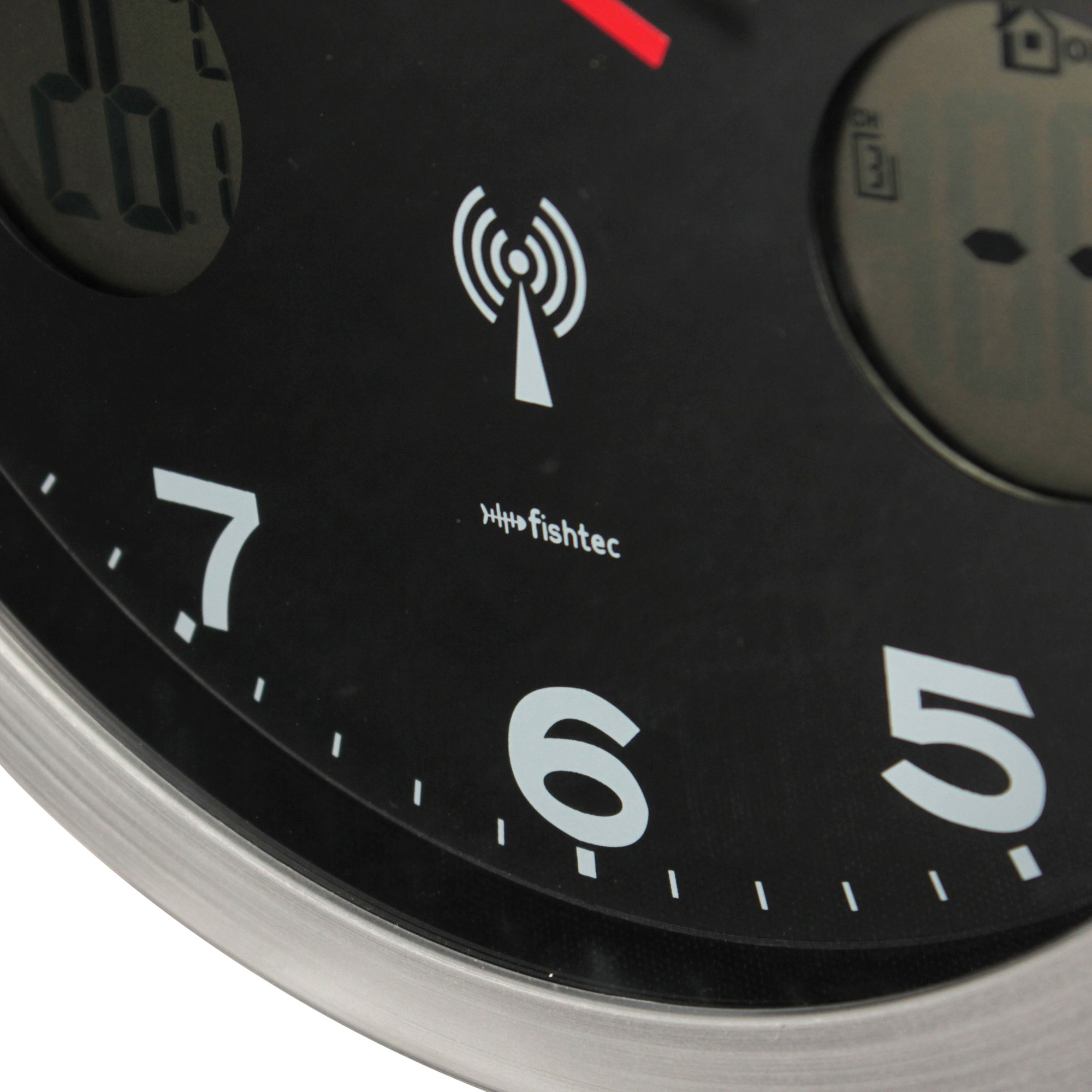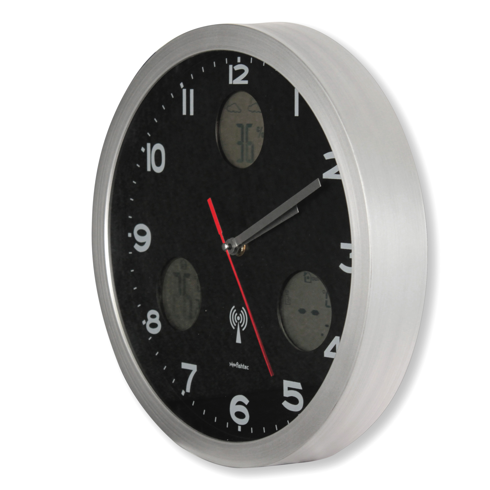 Toutes les informations essentielles en un coup d’œil ! Cette magnifique horloge vous offre un large éventail d’informations. Bien évidemment elle vous indique l’heure et comme elle est radiopilotée, elle vous assure une précision optimale, se met à l’heure seule et passe les heures d’hiver et d’été automatiquement. 3 écrans LCD vous donnent des informations précieuses sur la météo. Le premier écran indique la prévision météo sous forme de pictogramme ainsi que le taux d’humidité intérieur, le deuxième écran indique la température intérieure et le troisième vous donne la température extérieur grâce au capteur inclus. Ainsi en un coup d’œil vous lisez l’essentiel des informations météo locales dont vous avez besoin. Cadre, aiguilles et chiffres sont en coloris métal pour une élégance parfaite. Les grands chiffres assurent une lecture aisée de l’heure. Caractéristiques : – Matières : plastique (cadre), verre (vitre) – Dimensions : Ø 30 cm x 4 cm – Alimentation : 3 pile AA (horloge) + 2 piles AAA (capteur) non incluses – Certifiée CE, RoHS, RED