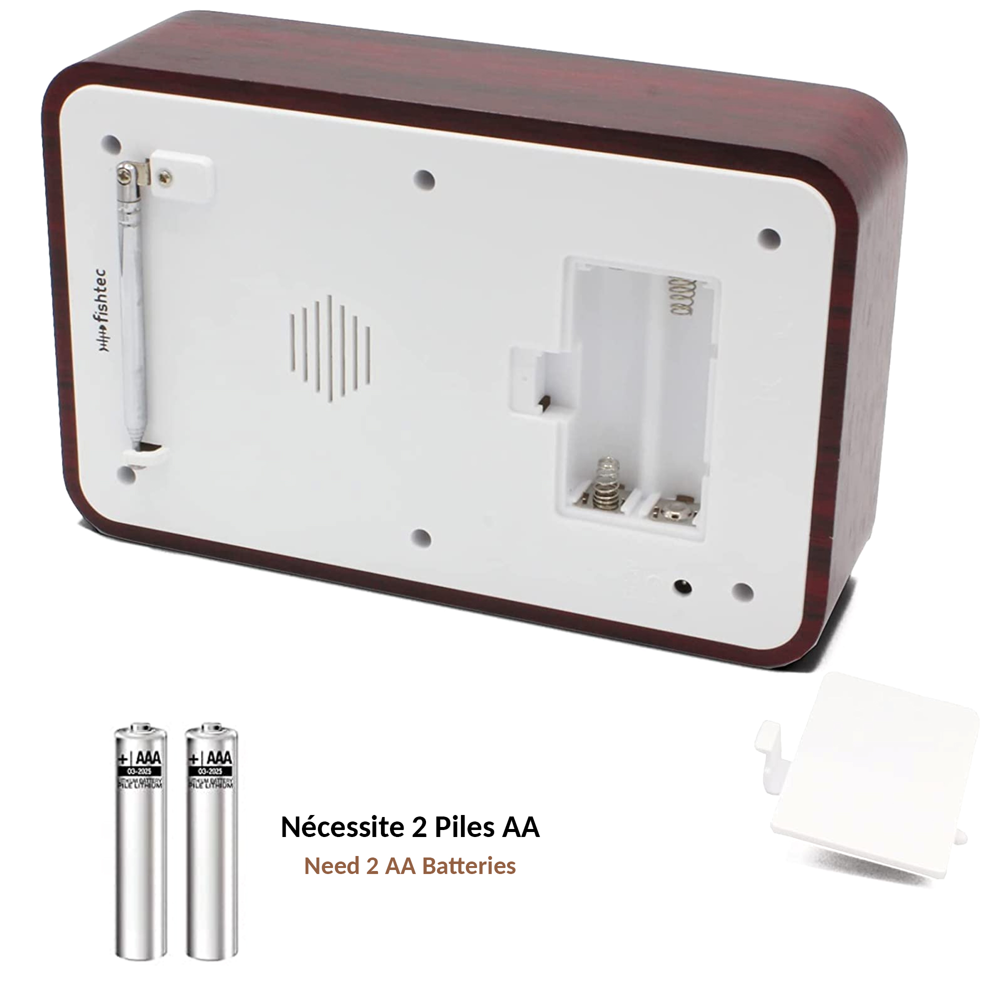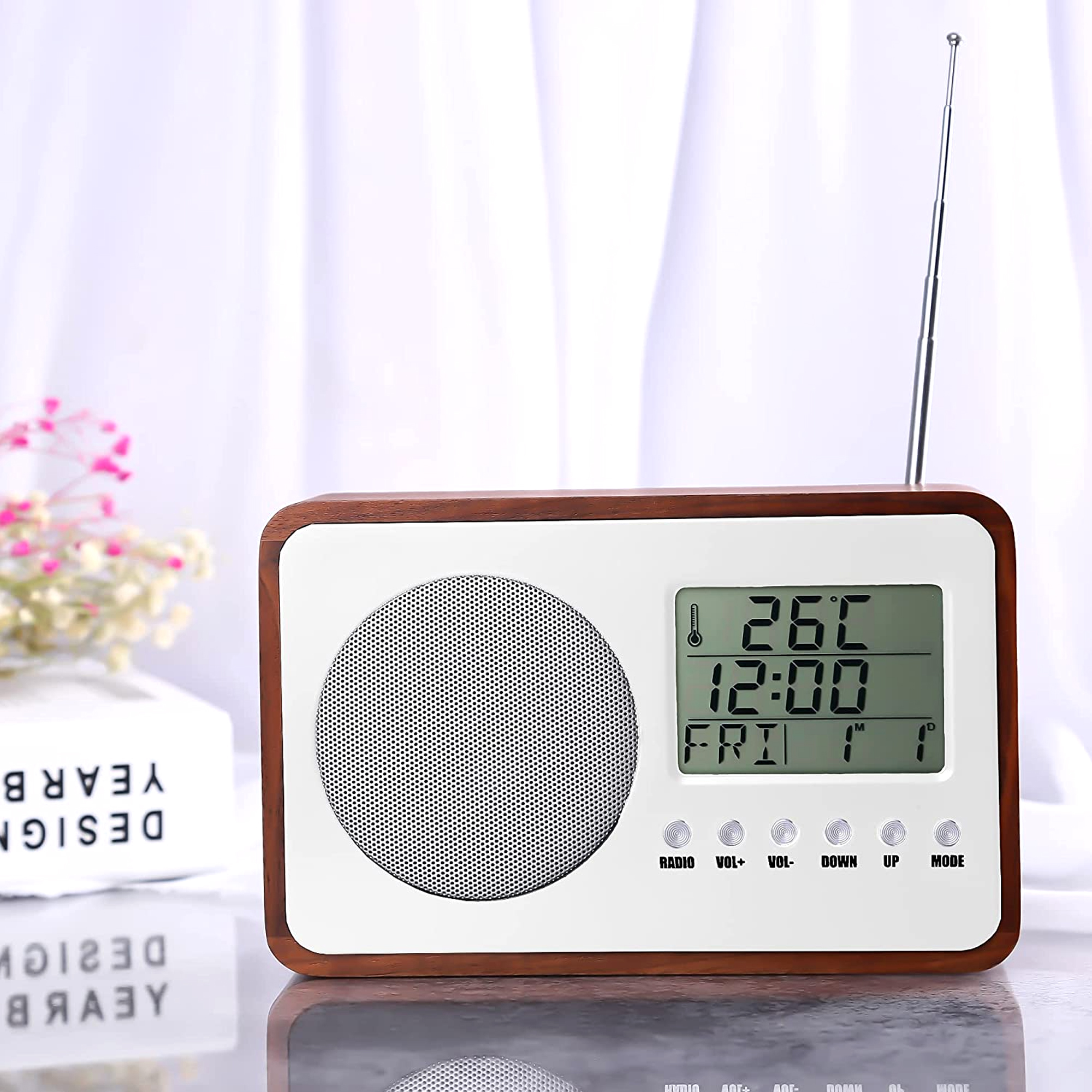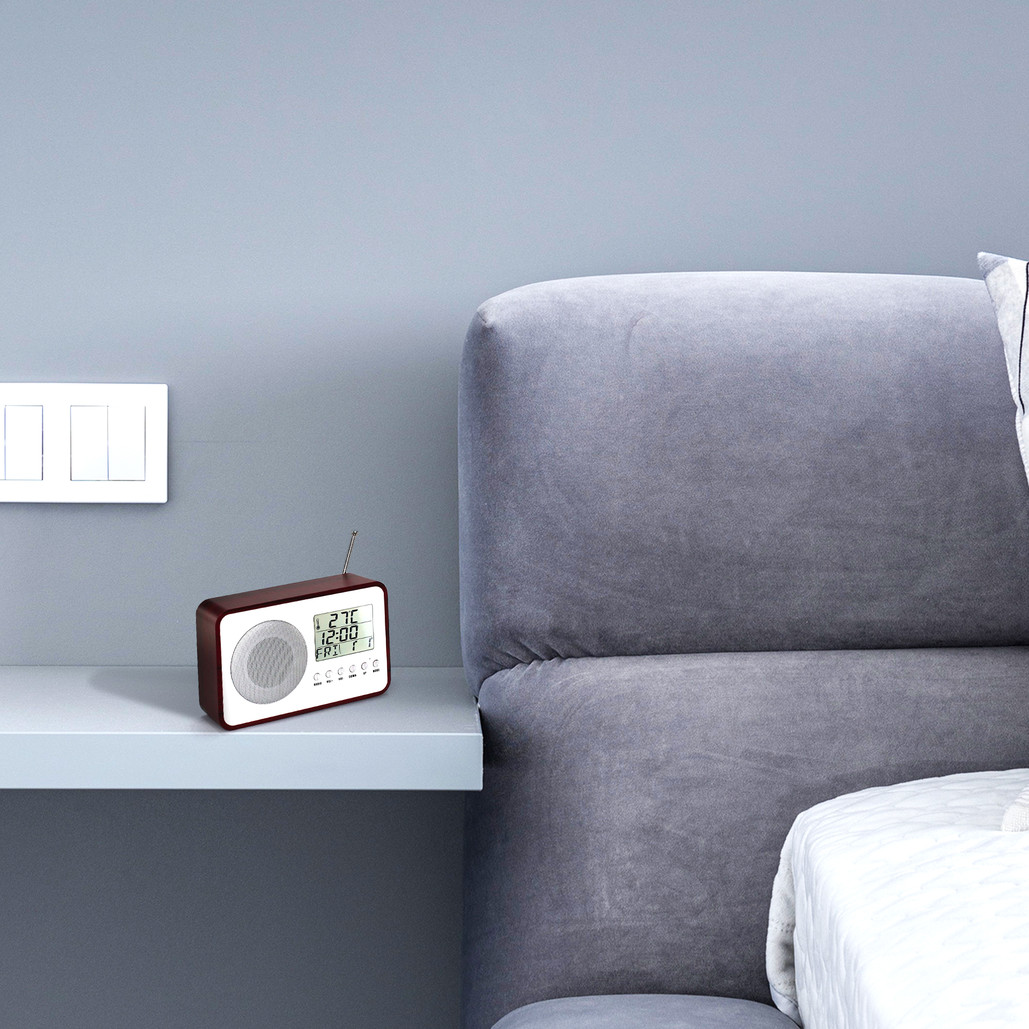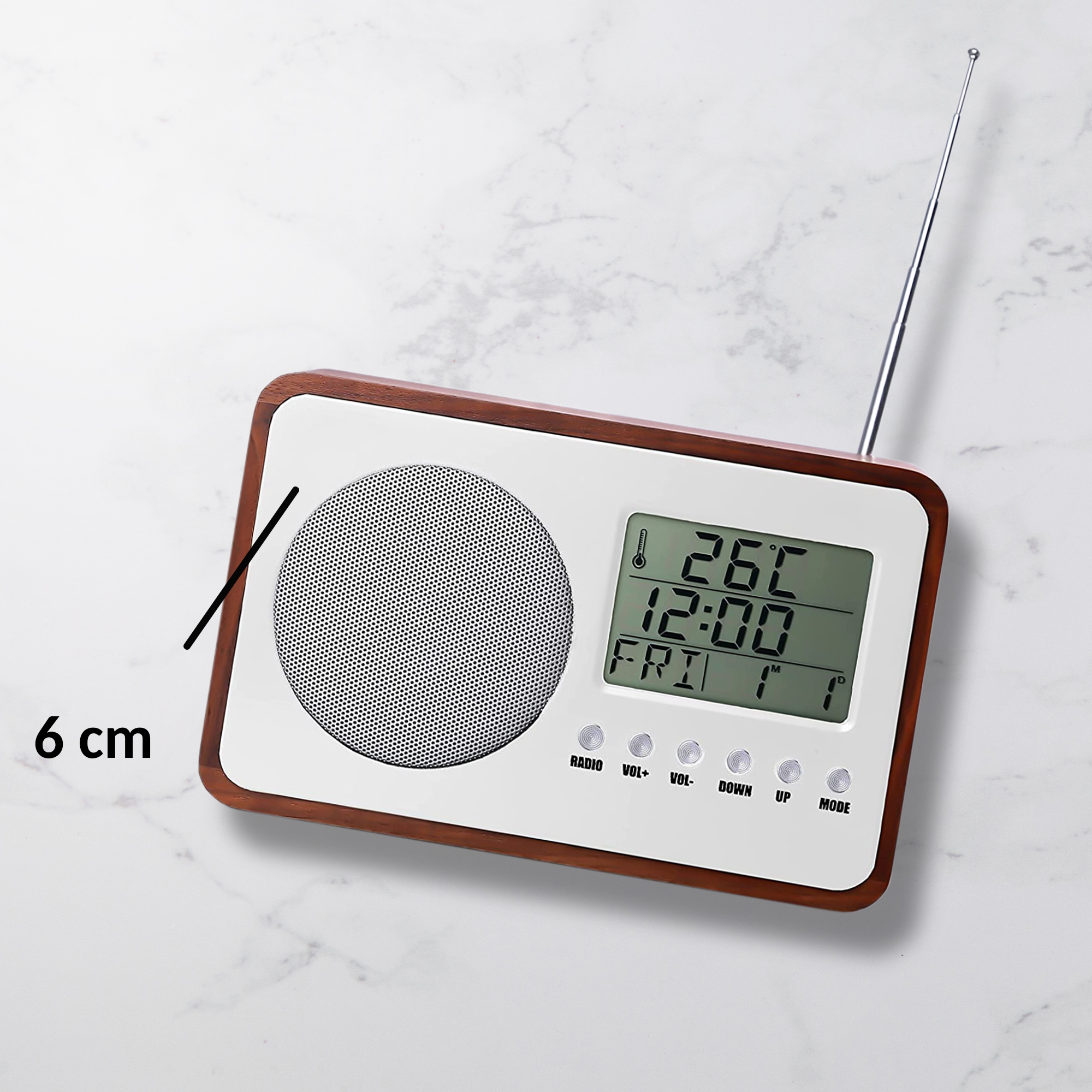 Ce radio/réveil est un véritable condensé de technologie au look rétro. Ses finitions chromé et bois lui donne un air vintage-branché qui lui permettra de trouver sa place aussi bien dans les intérieurs modernes que classiques, à la maison ou même en vacances où vous pourrez l’emporter facilement. Il est muni d’un seul haut-parleur puissant et comporte un écran LCD monochrome permettant de naviguer parmi les stations FM disponibles, d’afficher l’heure et la date mais aussi la température de votre pièce (°C / °F). Caractéristiques: – Matières: polywood, ABS et écran LCD – Alimentation : 2 piles AA (non fournies) – Degrés Celsius ou Fahrenheit. – Alarme, fonction snooze. – Certifié CE et RoHS