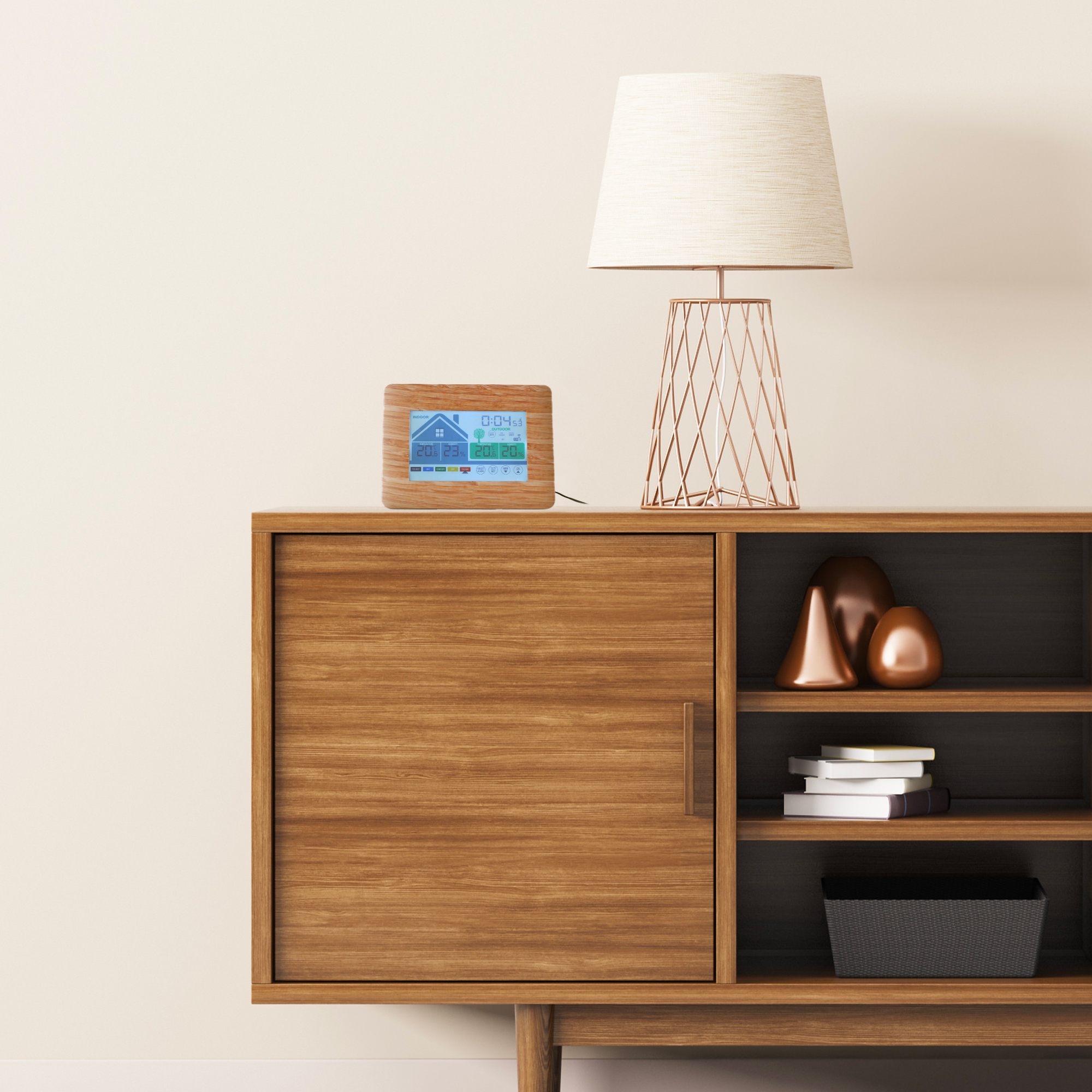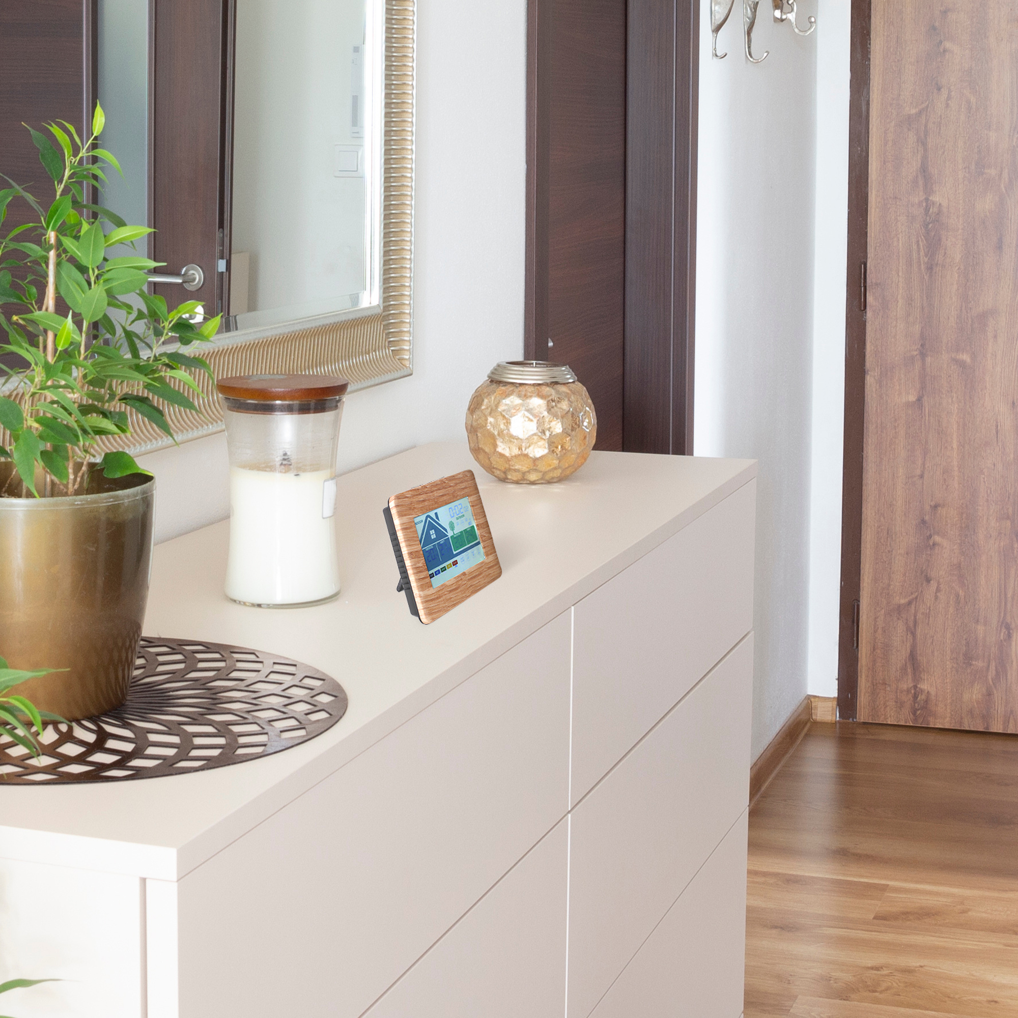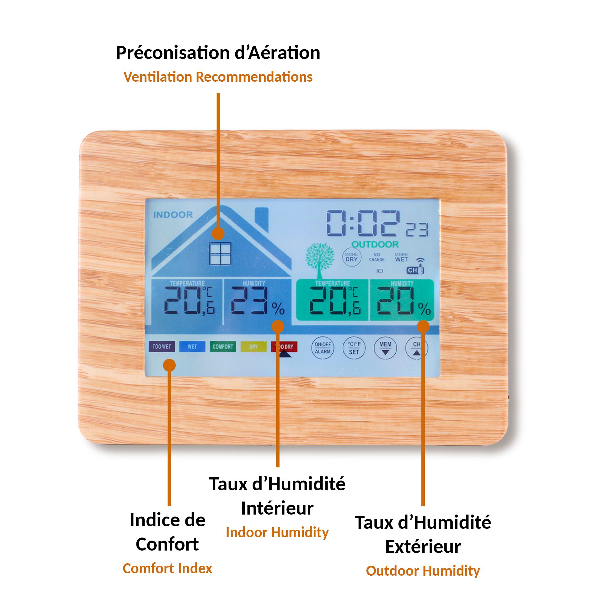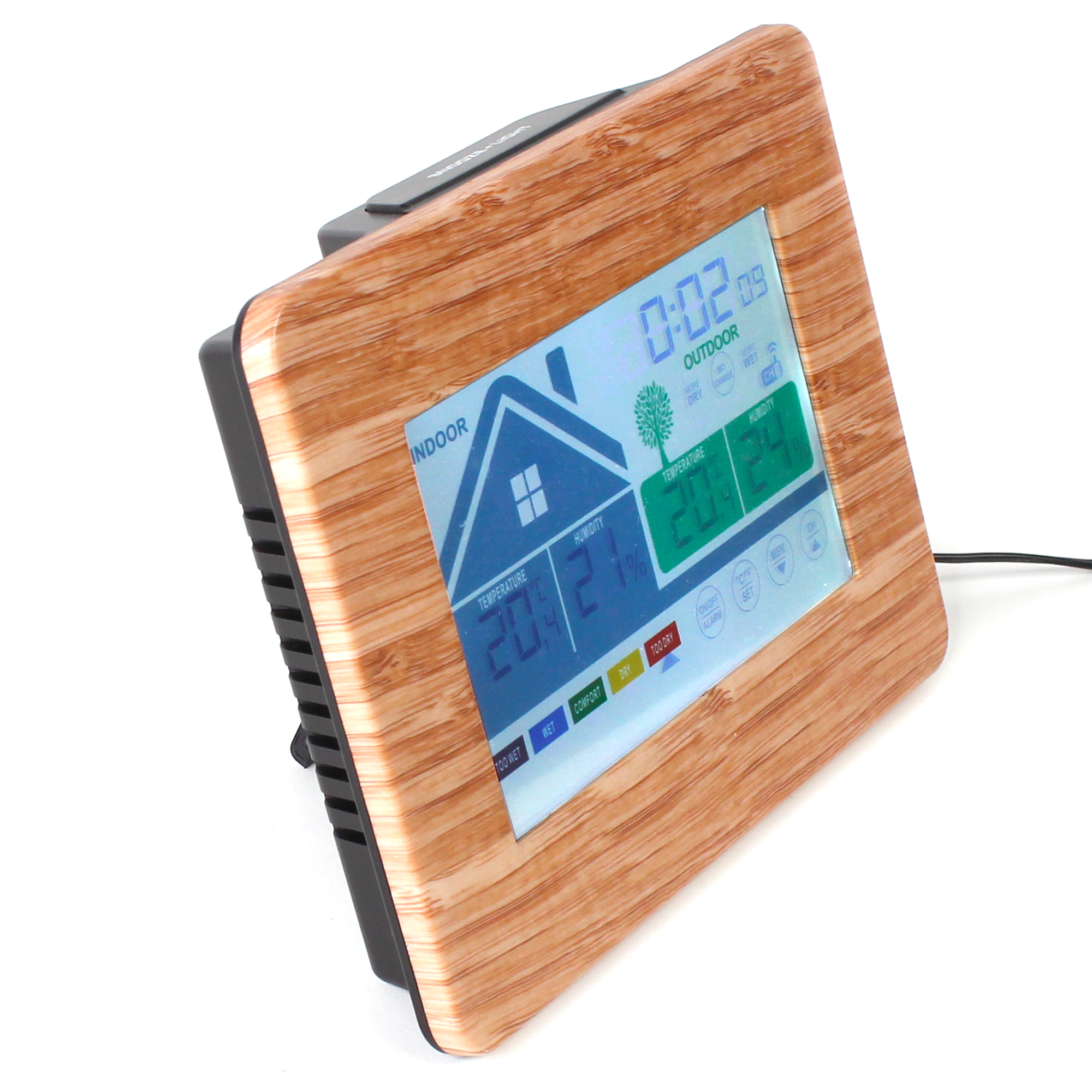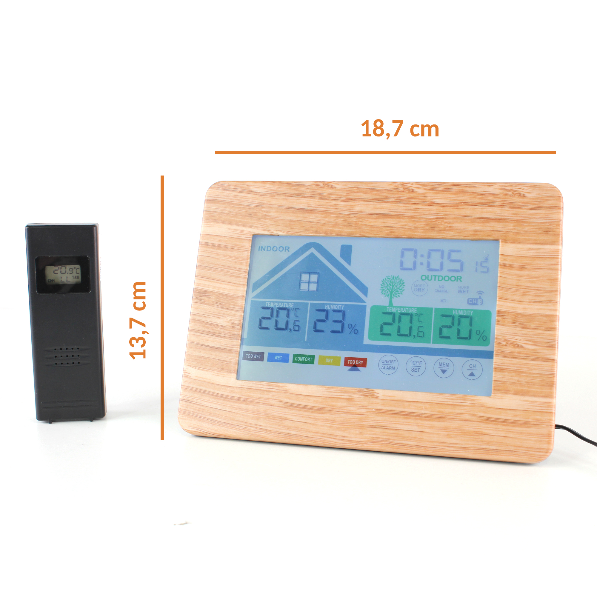 Cette station au style épuré avec écran tactile et aspect bois, vous donne une lecture claire du niveau de confort de l’air ambiant et extérieur. Pour que votre environnement soit sain et agréable, il faut un bon rapport température/ taux d’humidité. Cette station, vous indique ces deux données de façon très claire. Sur l’écran, vous lisez la température et le taux d’humidité ambiants dans l’espace représenté par une maison ainsi qu’un indice de confort allant de “trop humide” à “trop sec”. Sur la maison, le pictogramme de la fenêtre évolue et vous indique lorsqu’il est recommandé d’aérer. De l’autre côté de l’écran, près de l’arbre et grâce au capteur extérieur, vous lirez la température et le taux d’humidité extérieurs ainsi que l’évolution de l’humidité allant de “plus sec” à “plus humide” A tout moment vous accédez aux données mini/maxi par simple effleurement sur le bouton prévu à cet effet sur l’écran.. En plus de ces données, cette station vous indique l’heure. Radio-pilotée, elle se met à l’heure automatiquement et passe à l’heure d’hiver et d’été seule.Une fonction réveil et une fonction snooze viennent compléter cette station. Caractéristiques : – Dimensions : 18,7 x 13,7 cm x 3,3 cm (écran : 12,8 x 7,8 cm) – Matière : ABS – Alimentation : Adaptateur secteur DC 5V 0.15A inclus- 3 piles AA pour la station et 2 piles AA pour le capteur non incluses, Fréquences : 433 Mhz – Plage de température intérieure : 0°C à 50°C – Plage de pourcentage humidité : 20-95% – Plage de température extérieure: – 20°C à 60°C – Certifiée CE, RoHS, RED