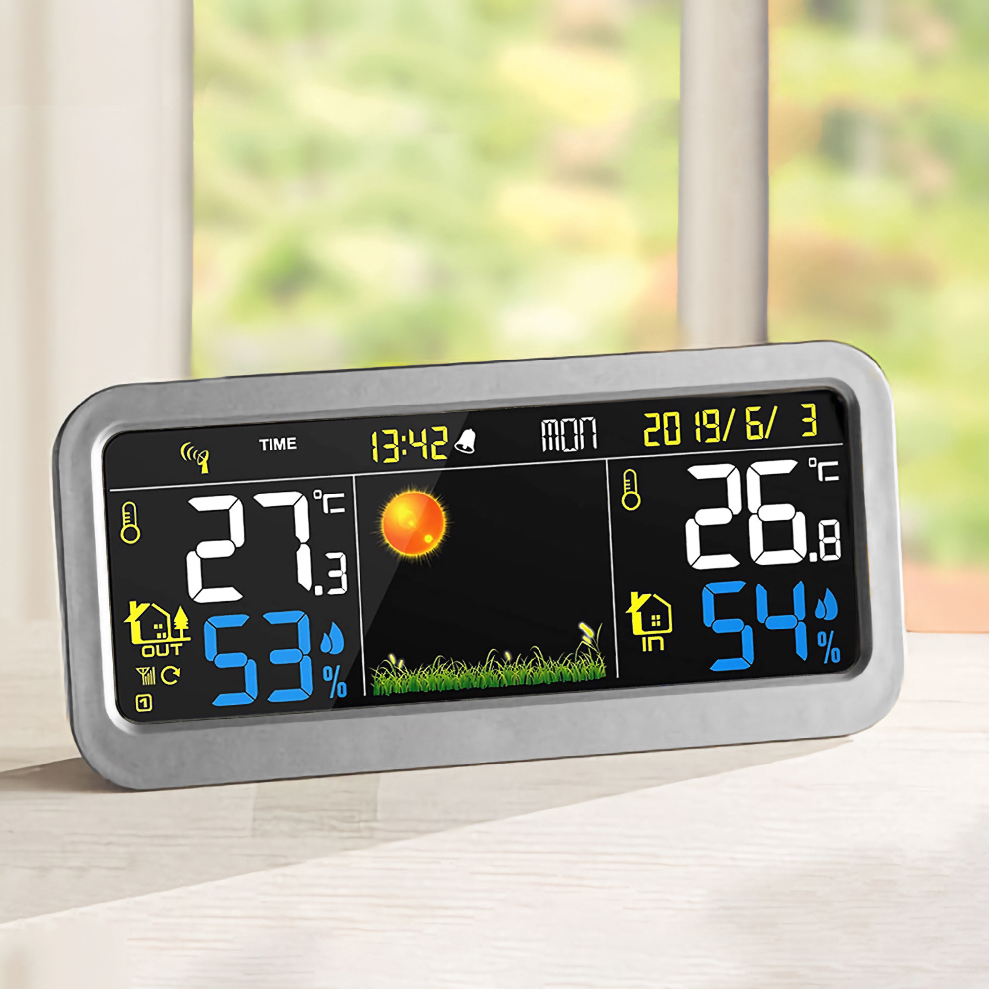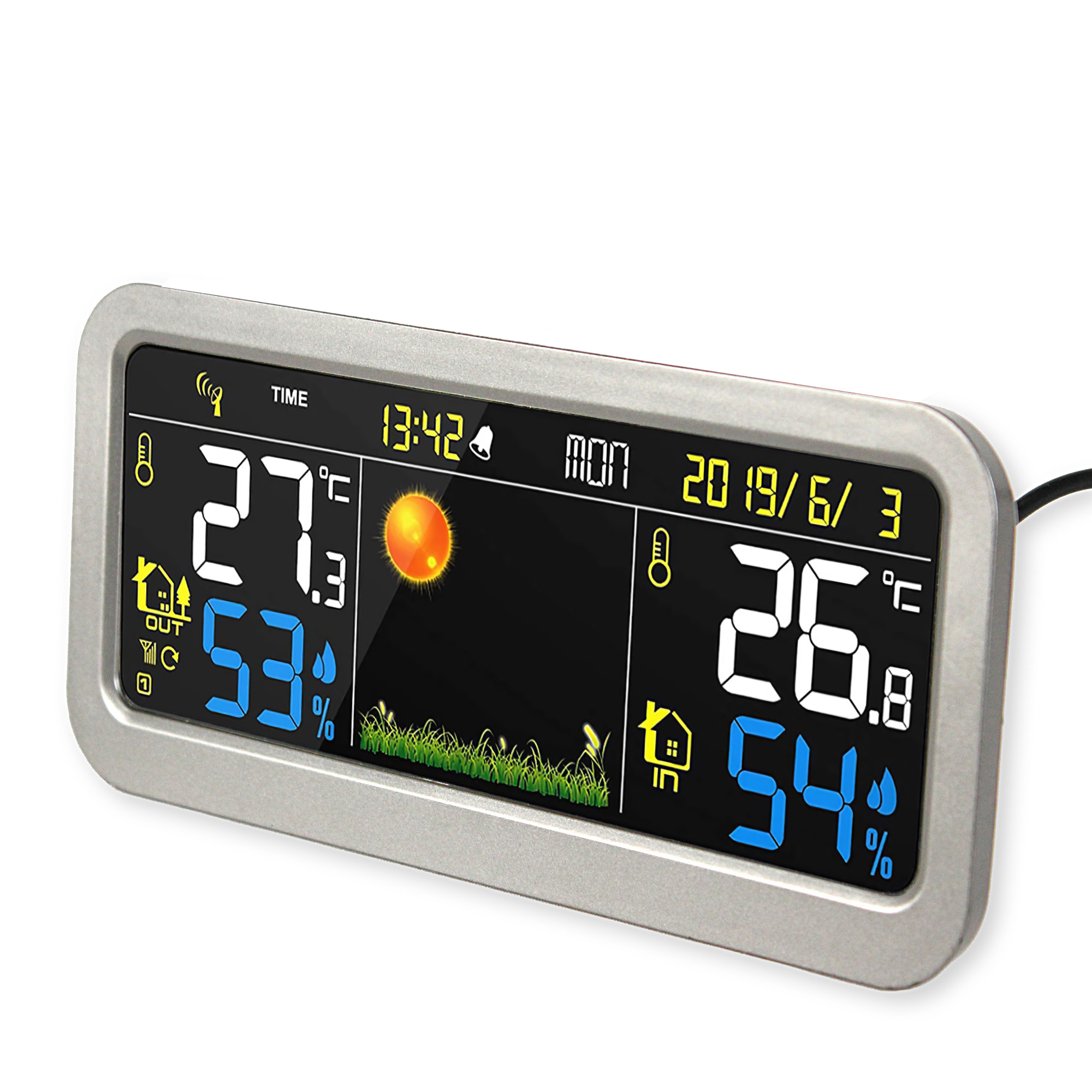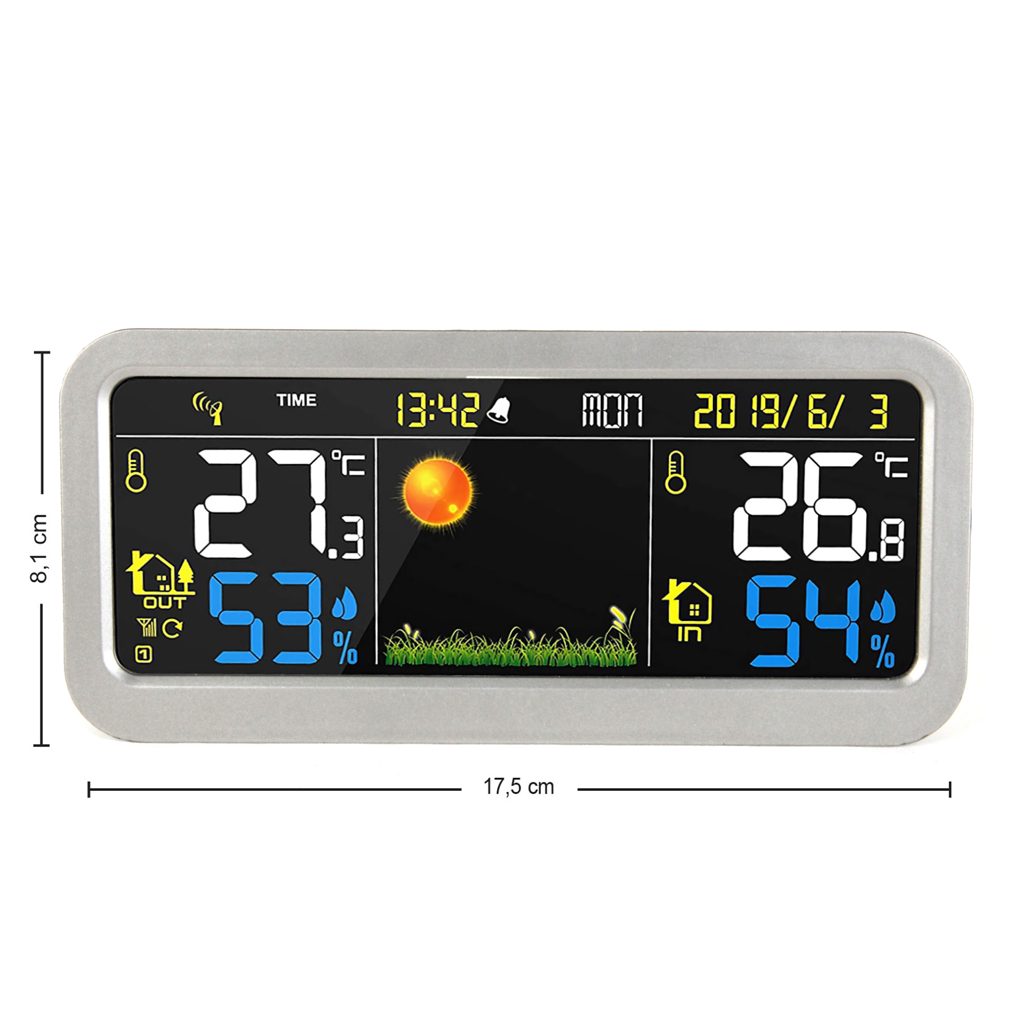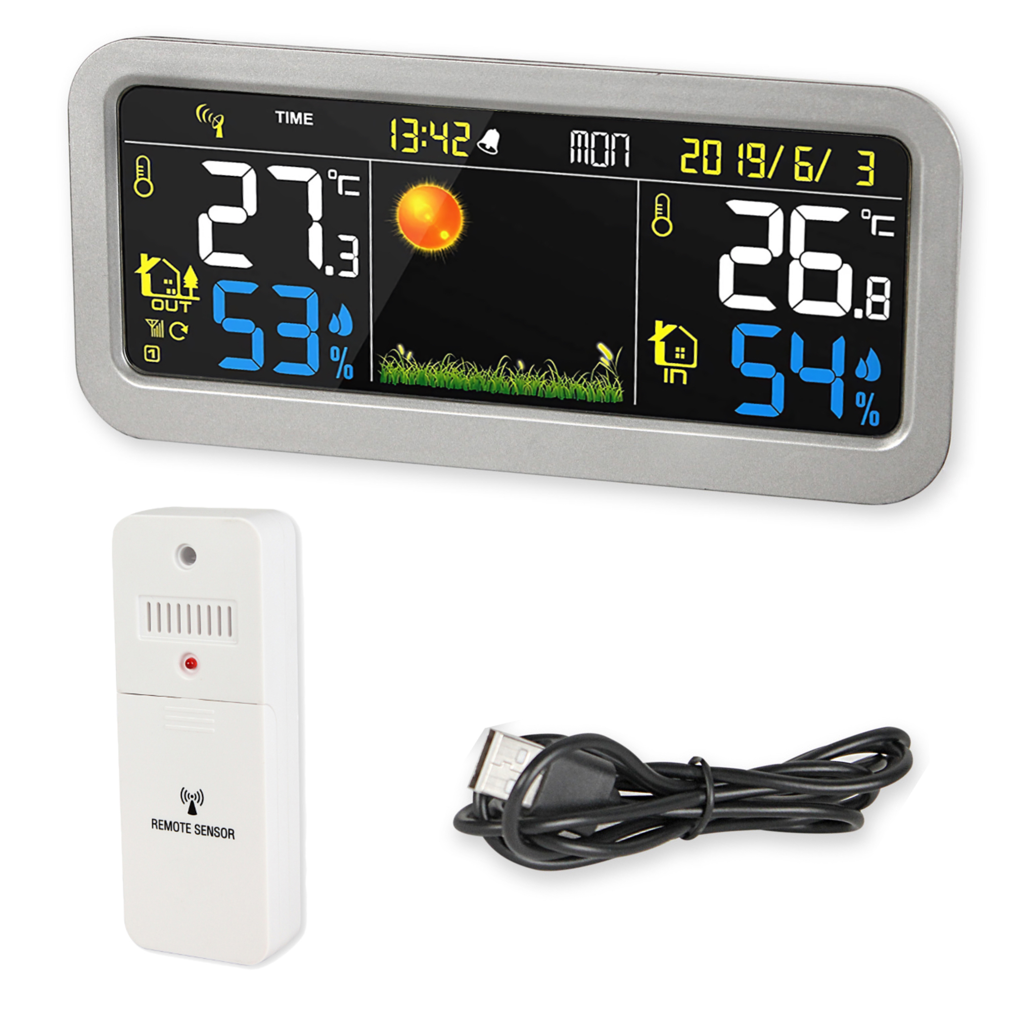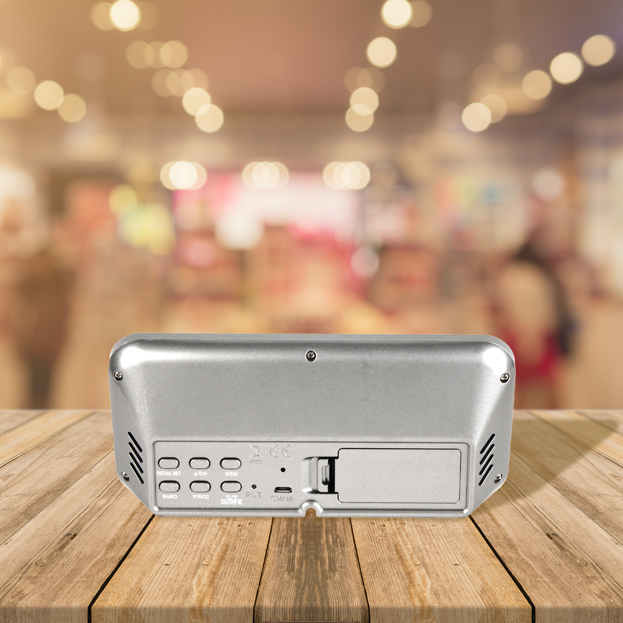 L’élégance de cette station météo avec ses lignes épurées et son coloris “graphite” va vous séduire. Grâce au capteur extérieur, elle vous donne des informations complètes sur la météo du jour. Température et taux d’humidité intérieur et extérieur, données mini/maxi, tendance météo par le biais de pictogrammes colorés, pression atmosphérique, heure, date et le jour de la semaine en 7 langues dont le français. Elle dispose également d’une fonction réveil. Radio-pilotée, cette station météo se met à l’heure automatiquement et passe seule à l’heure d’été ou d’hiver. Caractéristiques : – Matière : ABS – Alimentation : câble d’alimentation USB de 90cm (inclus), Capteur extérieur: 2 piles AAA (non incluses) Station : 2 piles AAA de sauvegarde (non incluses) – Capteur extérieur : Fréquences : 433 MZH portée 60m en champ libre – Plage de température intérieure : -10%C/+50°C – Plage de température extérieure : -40%C/+60°C – Certifiée CE, RoHS, et RED