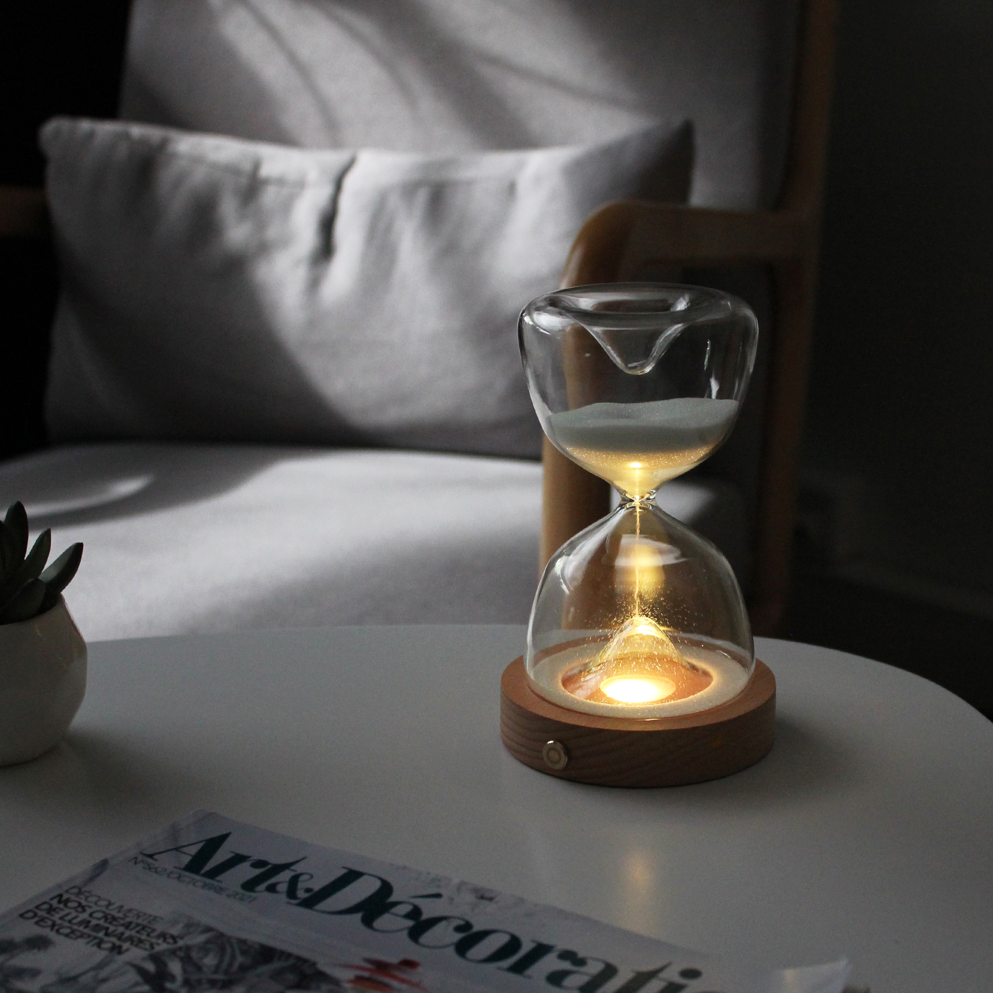 Les origines du sablier remontent à l’époque des pharaons. Au fil des temps, l’eau à fait place au sable et la taille a été réduite pour en rendre l’usage plus pratique. Au Moyen Âge, il servait notamment à limiter le temps des sermons et des leçons universitaires ! Dans la marine, il était utilisé à bord des bateaux pour en mesurer la vitesse, visualiser la durée des quarts, et même parfois pour mesurer la durée d’une expédition. Aujourd’hui, ce sablier d’une durée de 15 minutes permet de maîtriser la durée d’une partie de cartes, la cuisson d’un plat… Au-delà de l’objet utile, ce sablier est également une lumière d’ambiance. Il dispose d’une LED qui éclaire les perles de verres qui s’écoulent. D’un simple effleurement du doigt vous pourrez choisir parmi 7 couleurs ou sélectionner l’enchaînement des couleurs. Pratique, il est rechargeable, ce qui permet de l’installer sur une table de jeux, une table basse, un bureau, un chevet… La base en hêtre massif et le sablier en verre organique contribuent à son élégance. Caractéristiques : – Matières : Verre organique, perles de verres, hêtre massif – Durée : 15 minutes – Alimentation : Batterie lithium rechargeable 200 mah (câble de chargement USB inclus) – Dimensions : Ø 9,7 cm x 16 cm