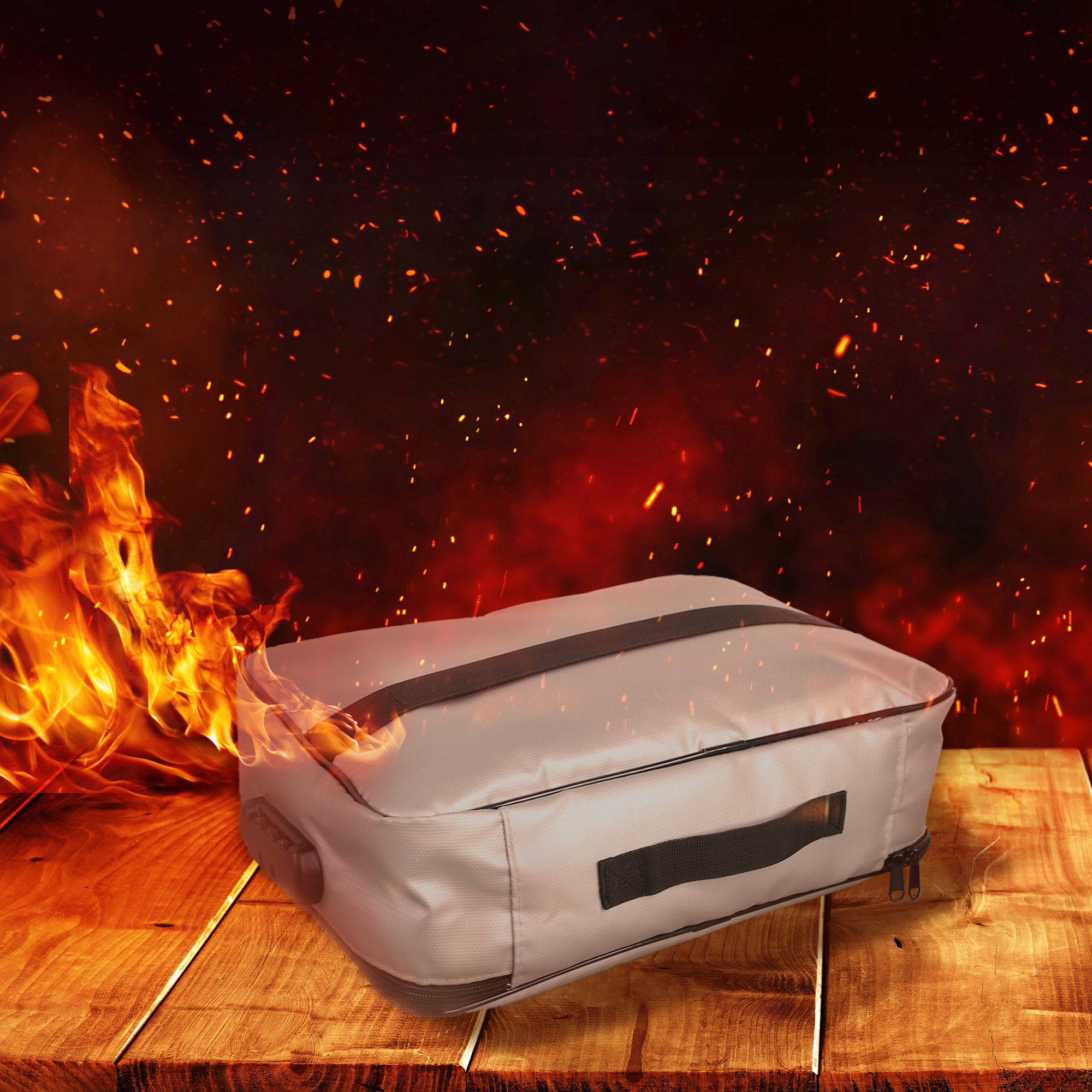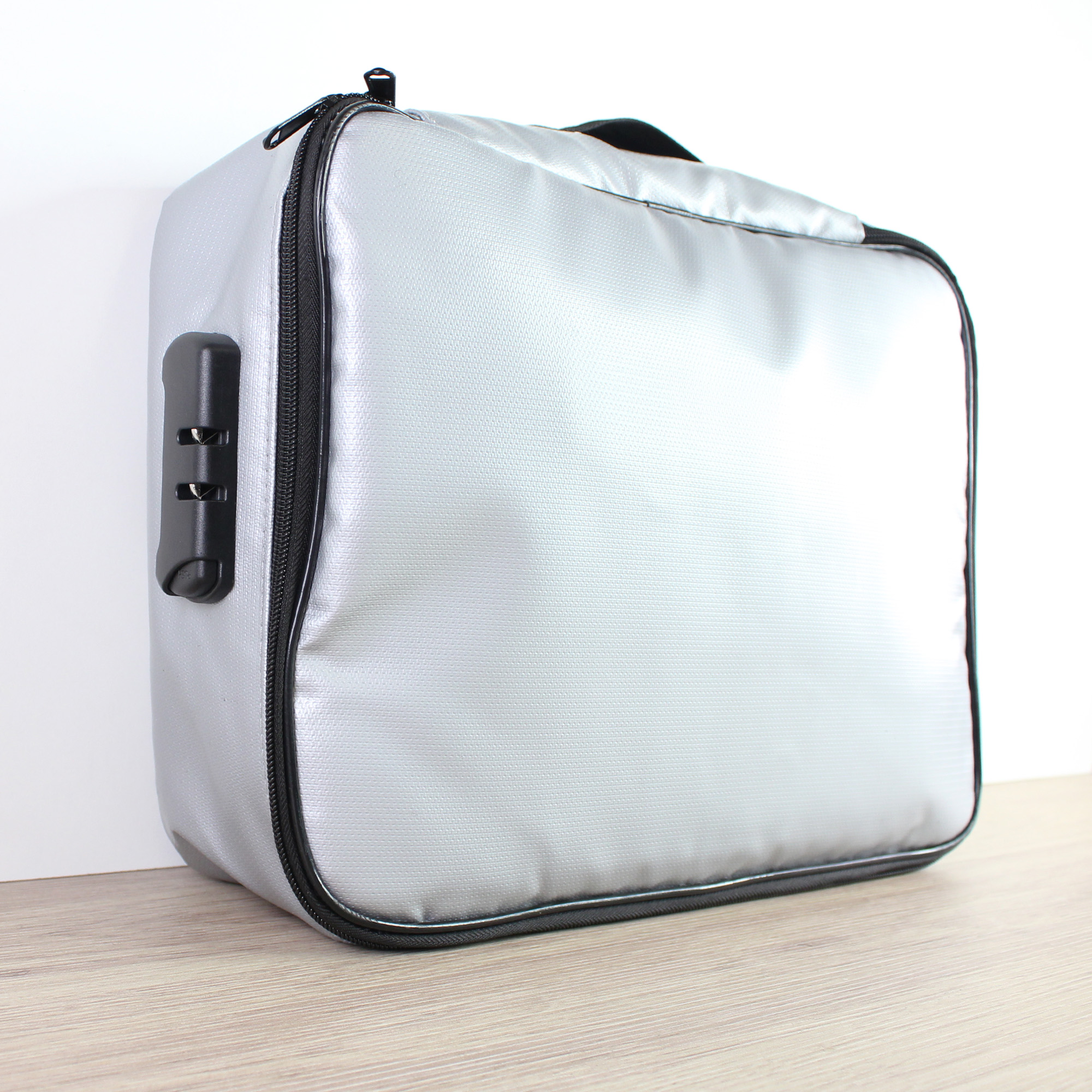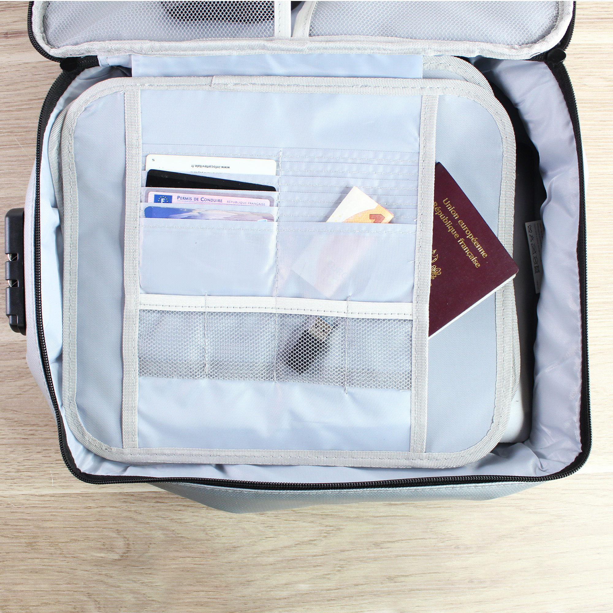 Mettez vos effets personnels en sécurité Cette valisette est conçue pour protéger au mieux vos documents et autres effets personnels. Elle est fabriquée dans un tissu souple composé de fibre de verre enduit au silicone. Testé en laboratoire, il résiste à la chaleur d’une flamme. Naturellement déperlant, il protège également vos effets de l’eau. Pour une sécurité renforcée, la valisette est équipée d’un cadenas à code de 3 chiffres. La valisette dispose d’un grand compartiment permettant de ranger facilement un ordinateur portable ou une tablette ainsi que de très nombreux rangements : 6 poches en filet de différentes tailles dont 1 fermée par zip, de nombreux emplacements pour cartes , de poches plates et fourreaux. Vous pourrez ainsi y ranger vos objets précieux, vos documents et dossiers confidentiels tels que des relevés de banques, passeport, dossier médical… Pour un transport facile, elle est équipée d’une poignée et d’une sangle au dos pour l’installer sur un bagage cabine à roulettes par exemple. Caractéristiques : – Matière : Fibre de verre enduit au silicone – Dimensions : 36 x 27 x 10 cm – Cadenas à roulettes (3 chiffres) – Nombreuses poches et rangements – Tissu certifé – Livré sous polybag