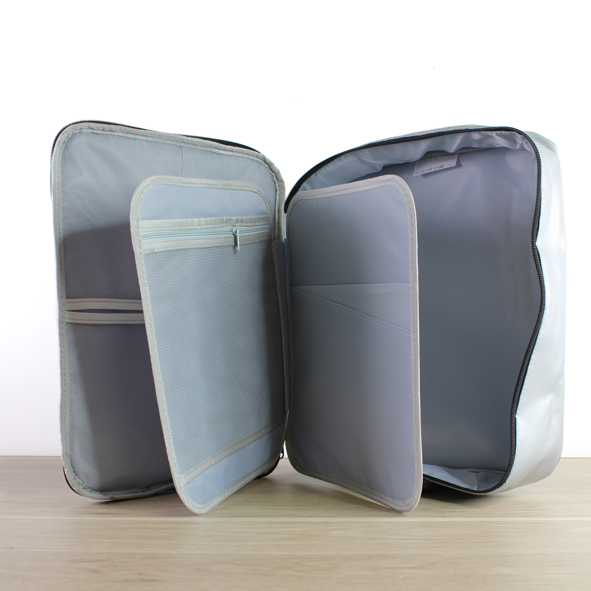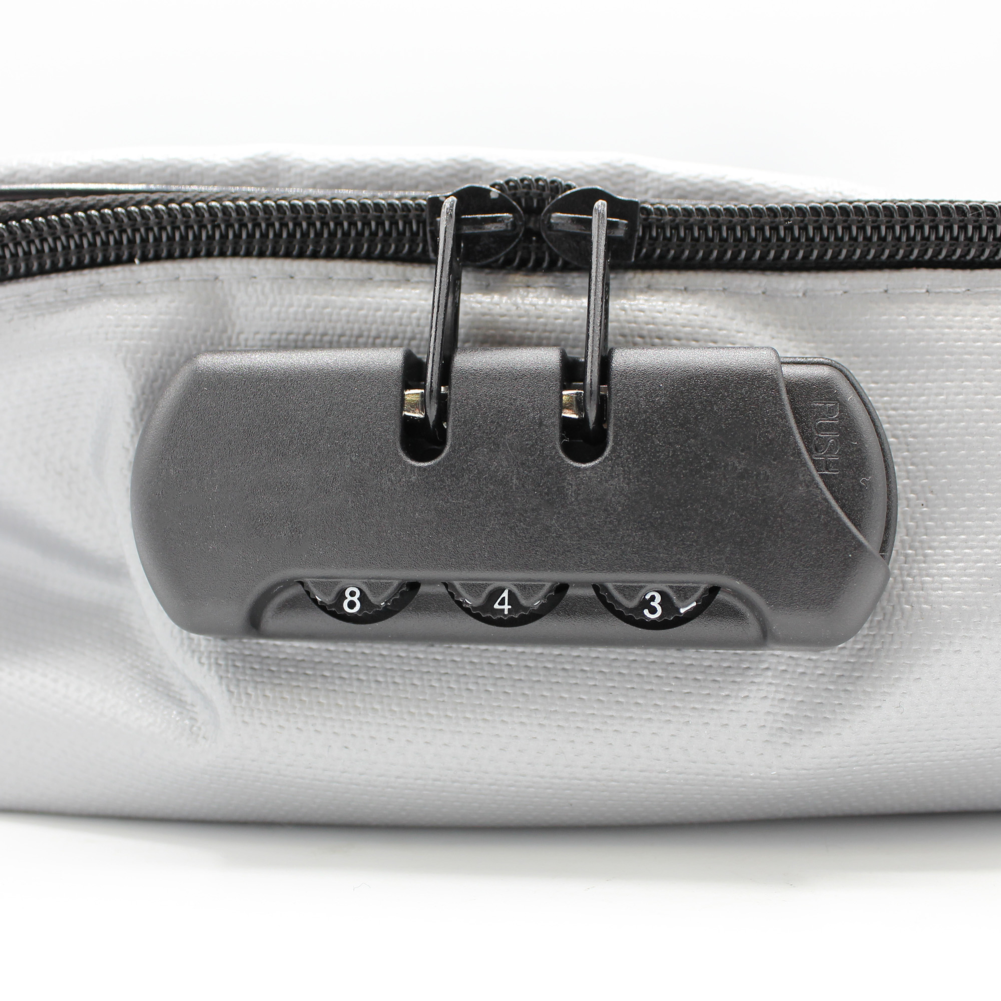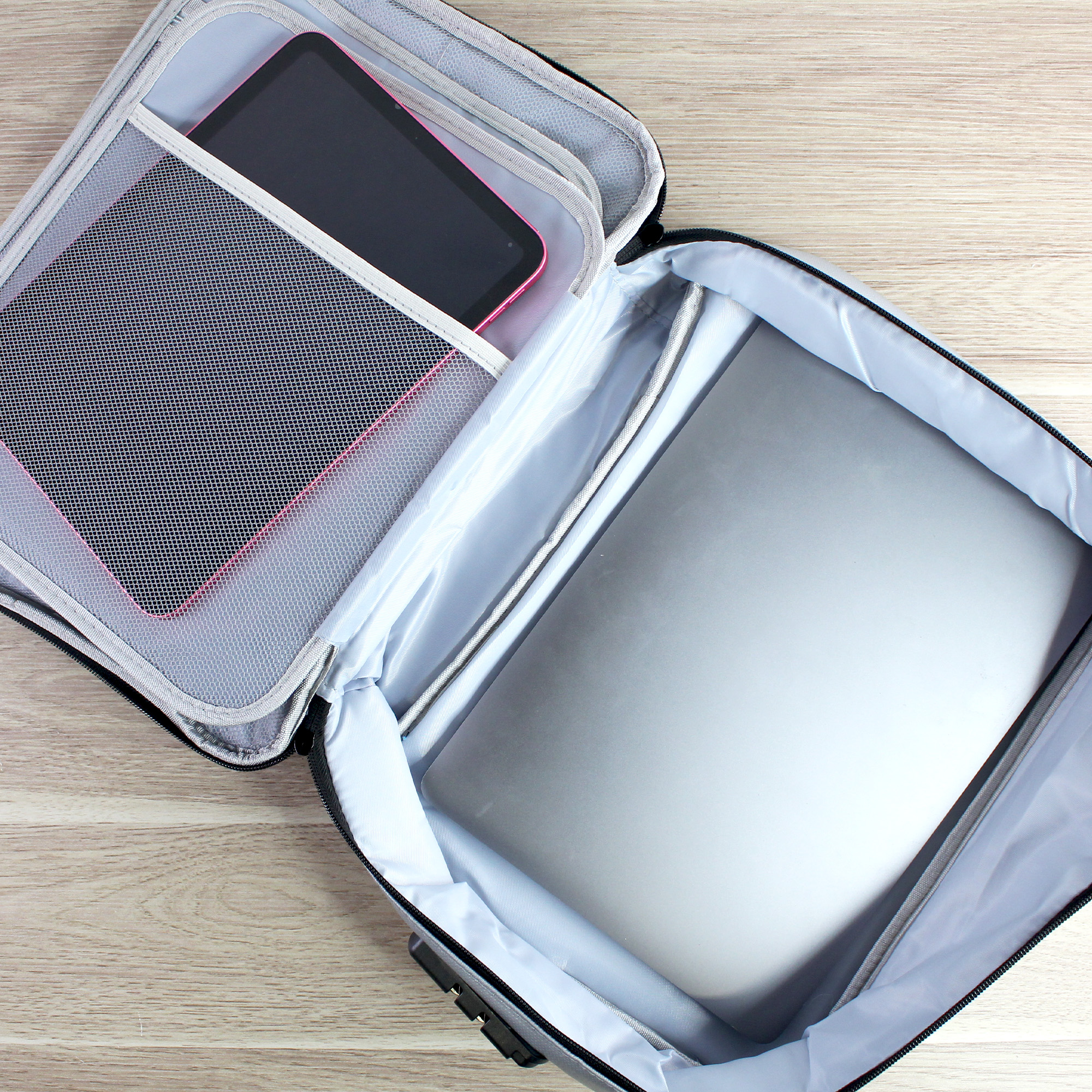Mettez vos effets personnels en sécurité Cette valisette est conçue pour protéger au mieux vos documents et autres effets personnels. Elle est fabriquée dans un tissu souple composé de fibre de verre enduit au silicone. Testé en laboratoire, il résiste à la chaleur d’une flamme. Naturellement déperlant, il protège également vos effets de l’eau. Pour une sécurité renforcée, la valisette est équipée d’un cadenas à code de 3 chiffres. La valisette dispose d’un grand compartiment permettant de ranger facilement un ordinateur portable ou une tablette ainsi que de très nombreux rangements : 6 poches en filet de différentes tailles dont 1 fermée par zip, de nombreux emplacements pour cartes , de poches plates et fourreaux. Vous pourrez ainsi y ranger vos objets précieux, vos documents et dossiers confidentiels tels que des relevés de banques, passeport, dossier médical… Pour un transport facile, elle est équipée d’une poignée et d’une sangle au dos pour l’installer sur un bagage cabine à roulettes par exemple. Caractéristiques : – Matière : Fibre de verre enduit au silicone – Dimensions : 36 x 27 x 10 cm – Cadenas à roulettes (3 chiffres) – Nombreuses poches et rangements – Tissu certifé – Livré sous polybag