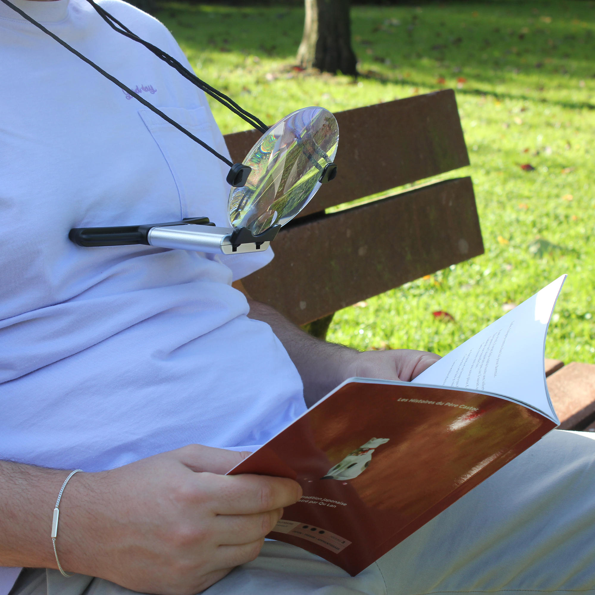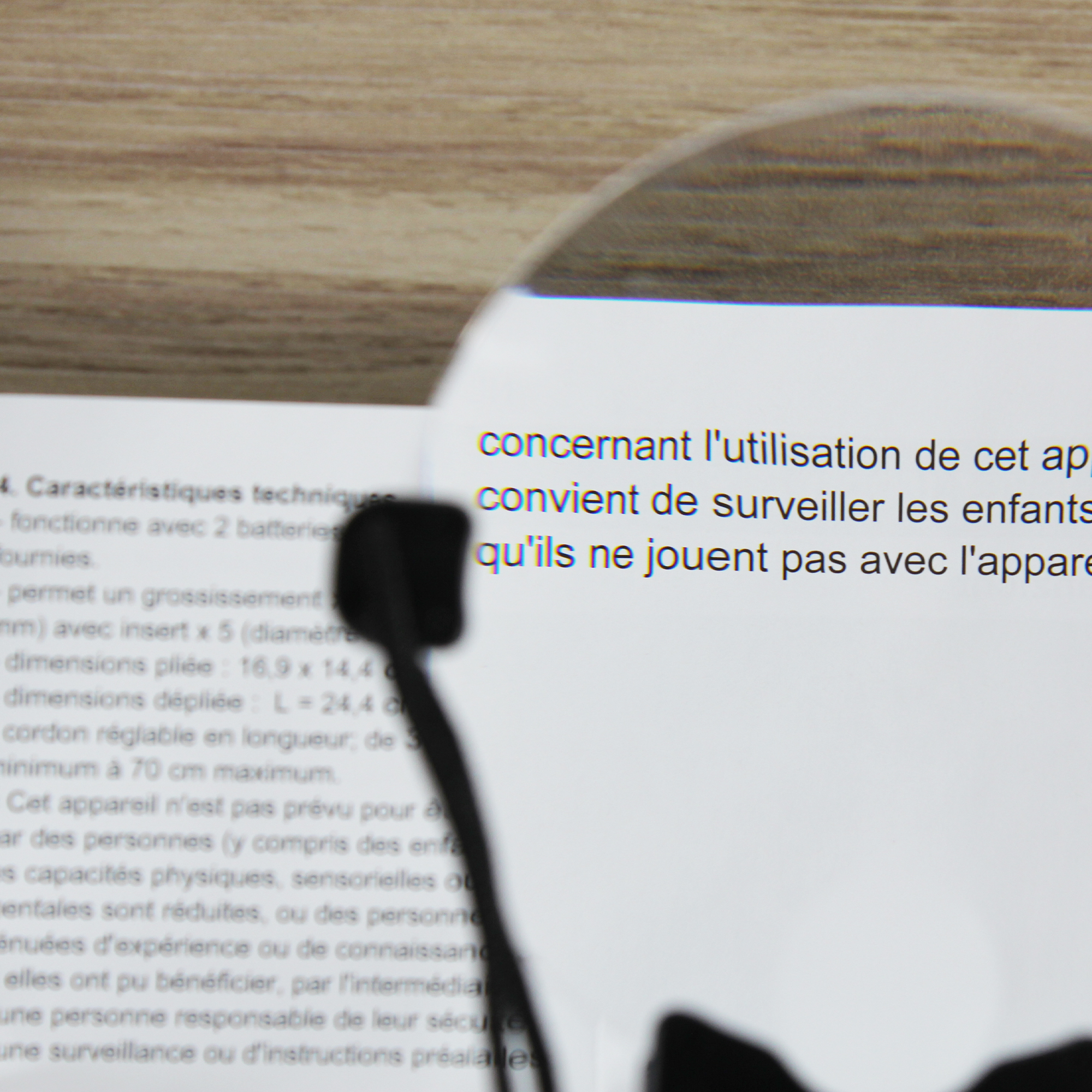 La loupe parfaite en toute circonstance ! Cette loupe est l’accessoire idéal pour des séances de lecture longue durée, des petits travaux, des mots-croisés, de la couture ou de la broderie Effectuer vos tâches avec beaucoup plus de rapidité en ayant les mains totalement libres et en maintenant une bonne posture. Avec ses deux grossissements x 2.5 et x 5, plus aucun détail ne vous échappera sans distorsion d’image et sans reflet grâce à la qualité des lentilles. Son cordon ajustable vous permet d’adapter la hauteur à votre convenance. La longueur est réglable de 33.5 cm minimum à 65 cm maximum. La loupe est également extensible de 23.5 à 29 cm pour suivre la morphologie de l’utilisateur et lui offrir un maximum de confort. Poursuivez vos activités même dans la pénombre avec ses deux LEDs lumineuses apportant une simulation de lumière naturelle Pliable et compact dans son étui de protection, vous pouvez la transporter partout sans risque. Caractéristiques: – Matière: Acrylique, ABS – Pochette de rangement: 17 x 13 x 4 cm – Fonctionne avec 2 batteries R3 (AAA) non fournies. – Poids: 156g – Certifiée CE & RoHS