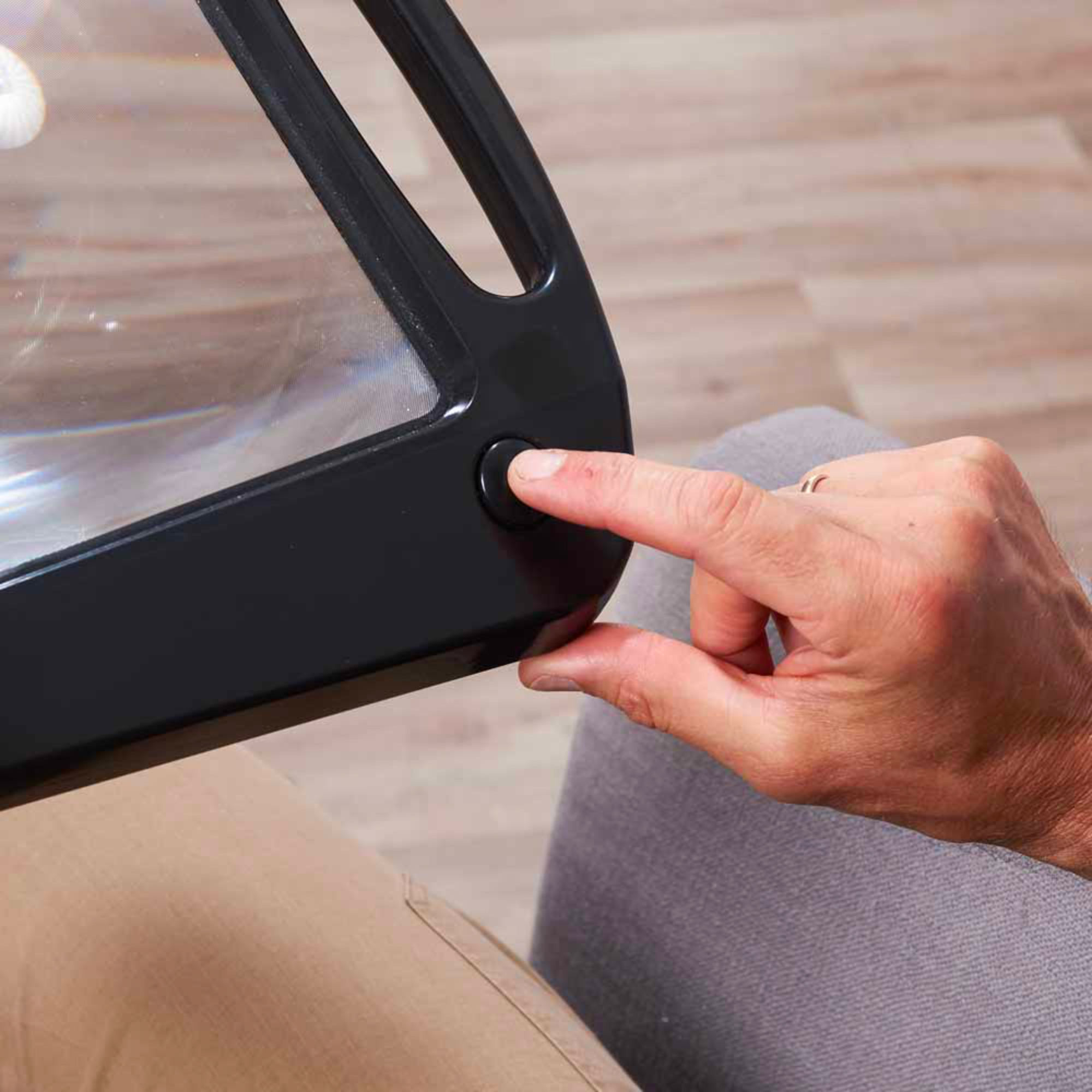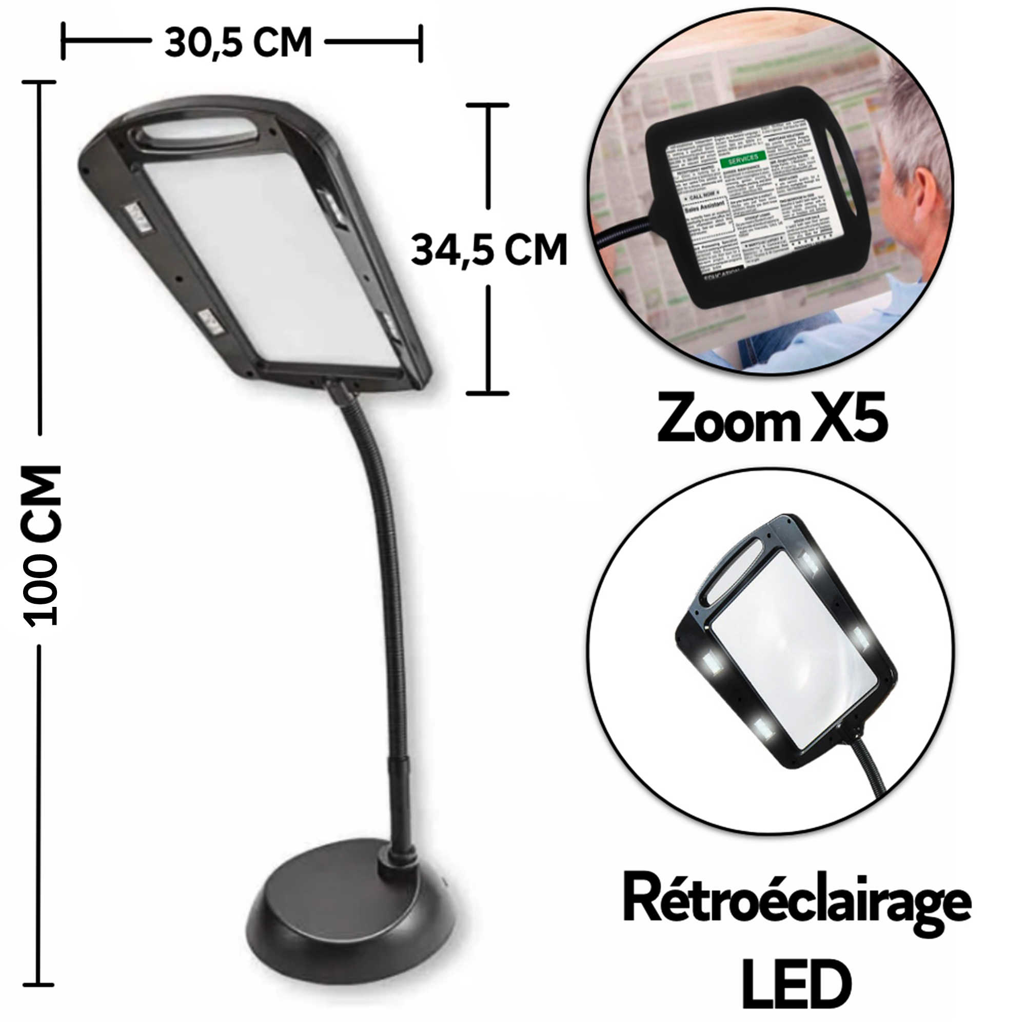 Avec un grossissement X 5, son support flexible et ses 12 LEDs, cette loupe deviendra votre meilleure alliée au quotidien. Elle vous servira aussi bien pour la lecture, les jeux de mots et chiffres, la couture, la broderie, le bricolage de précision, ou toutes autres activités minutieuses. Haut de 100 cm et dotée d’un flexible, elle s’oriente facilement et s’adapte au mieux à vos besoins. La grande surface de la loupe (25,5 x 19 cm) en homopolymère cristal (PPMMA) vous permettra d’avoir une vue beaucoup plus élargie qu’une loupe traditionnelle et une longévité assurée. Les 12 LEDs d’une puissance de 50 Lumens (6500K) vous offrent une lumière du jour agréable pour une visibilité parfaite. Caractéristiques: – Matières: ABS + PPMMA – Dimensions lentille: 25,5 x 19 cm – Dimensions totales : 2 – Poids: 3.5 KG – Alimentation: sur secteur 100-240 V – Certifiée RoHS et CE