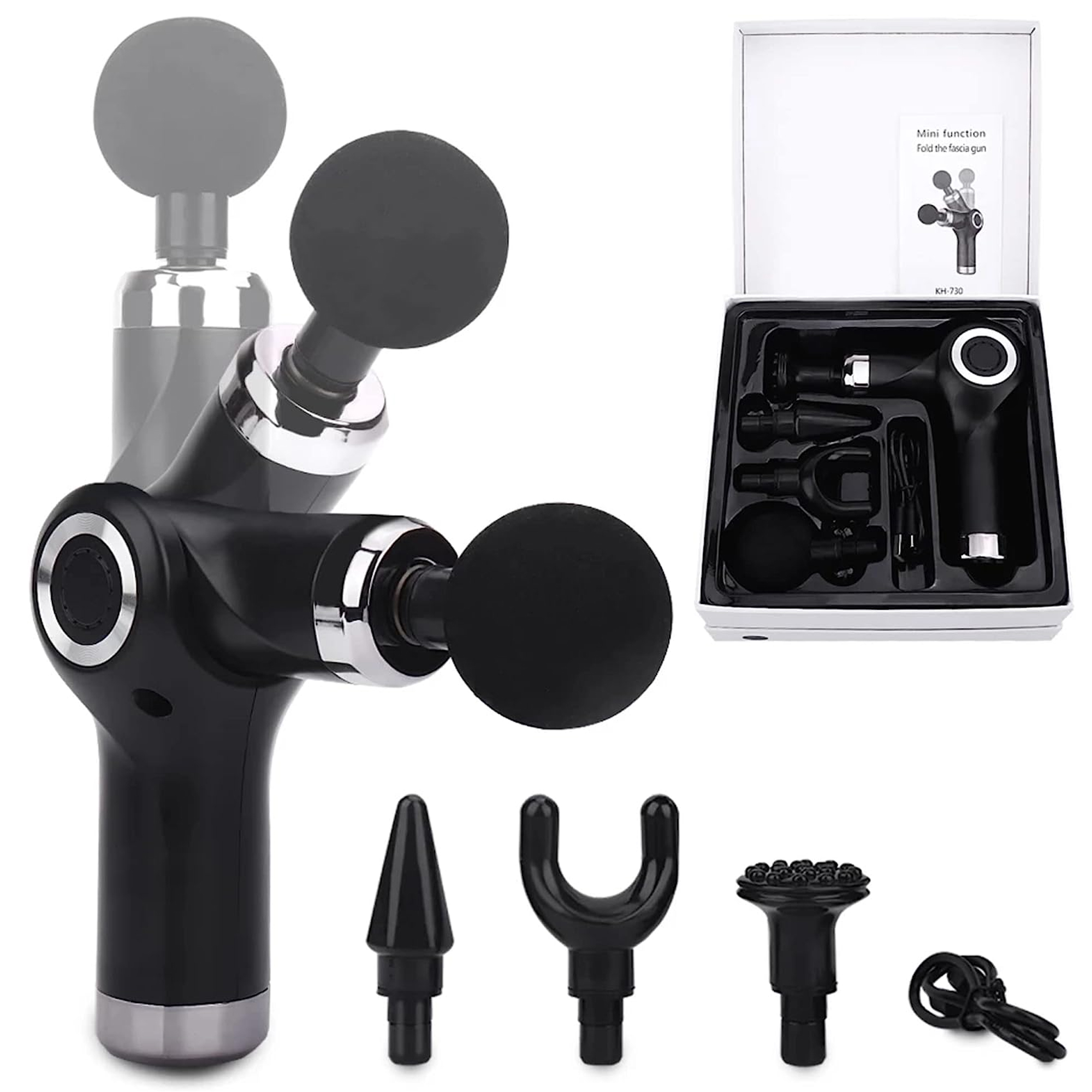 Équipez-vous d’un pistolet d’auto-massage et profitez de ses multiples bienfaits ! Efficace pour détendre les muscles, il vous aidera aussi à apaiser les douleurs et à vous procurer un bien-être absolu après une récupération musculaire rapide et optimale. Vous pourrez l’utiliser pour dénouer vos muscles, atténuer leurs douleurs, améliorer la circulation sanguine et optimiser les exercices d’échauffement Grâce aux 4 niveaux de vitesse, sa pression est plus puissante que celle des doigts d’un masseur et s’adapte à votre besoin. Compact et léger il offre une prise en main facile et confortable. La tête pivotante jusqu’à 90° permet d’atteindre précisément les zones à masser et son usage ne fatigue ni votre bras, ni votre poignet.. Le moteur à aimants (brushless) contribue à le rendre beaucoup plus silencieux que les autres appareils de massage à percussion. Les 4 têtes interchangeables , douces et respectueuses de la peau, sont conçues pour des massages bien ciblés. Sans fil, il est équipé d’une batterie lithium rechargeable à autonomie longue durée. Caractéristiques : – Matières : ABS – Poids : 420 g – Dim : Ø 4.3 x 20.5 cm (déplié) 15.5 x 10.8 x 4.3 (plié à 90°) – Alimentation : Batterie Lithium 1800mAh – DC5V/2A – Autonomie : 400 m – Temps de charge : 3.5 h – 4 vitesses : 1600 / 2100 / 2600 / 3200 tpm – Niveau sonore : 50 dB max – 4 embouts inclus : cylindrique, rond, plat, forme U – Certifié CE, RoHS