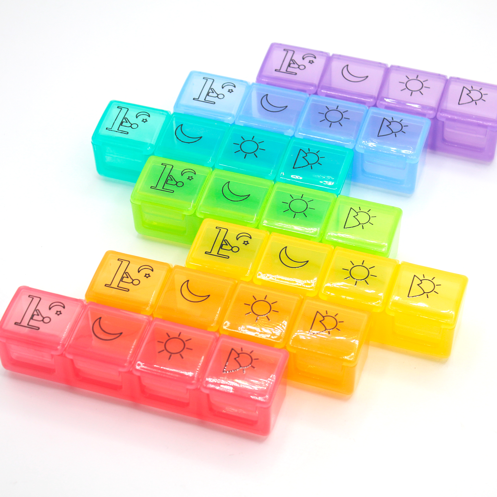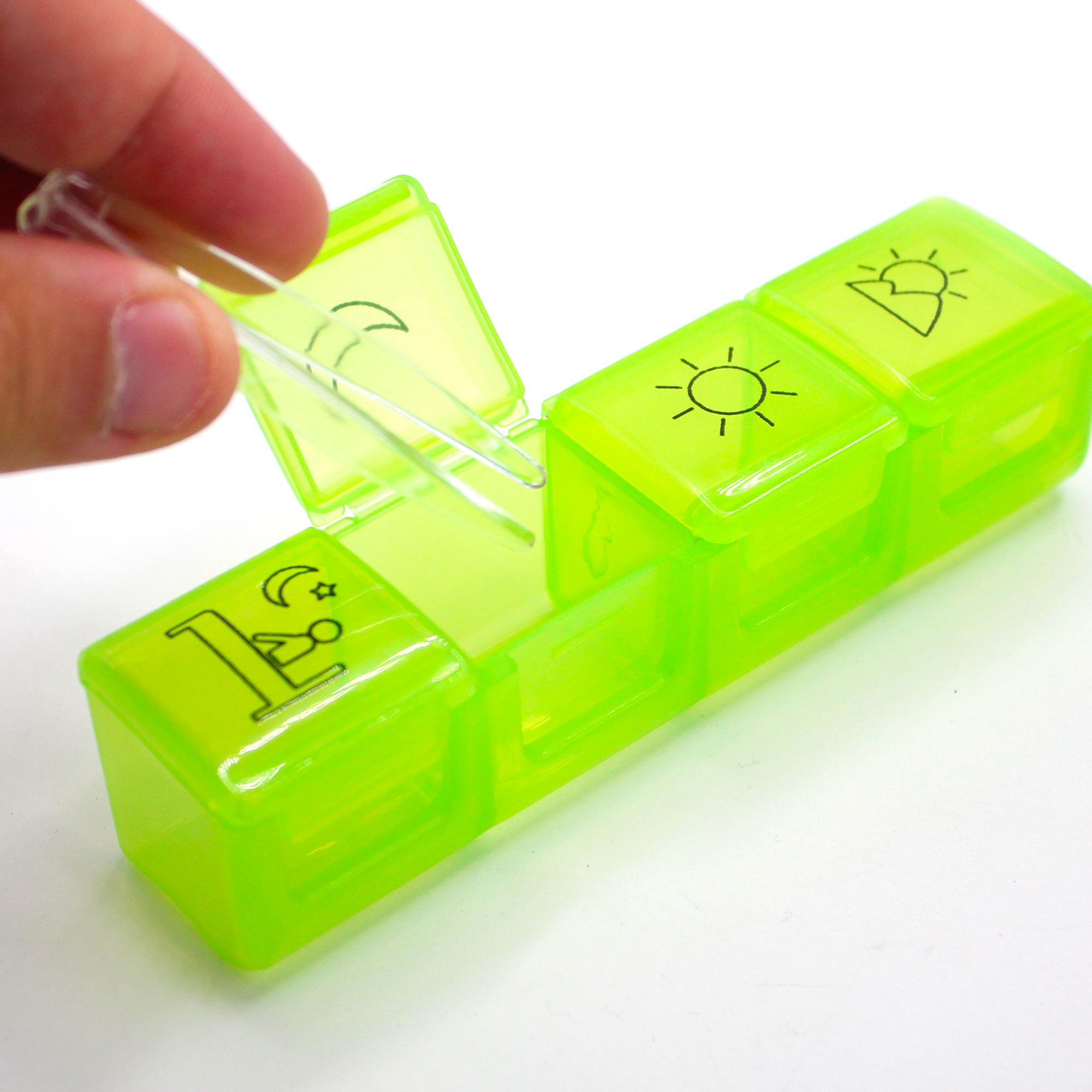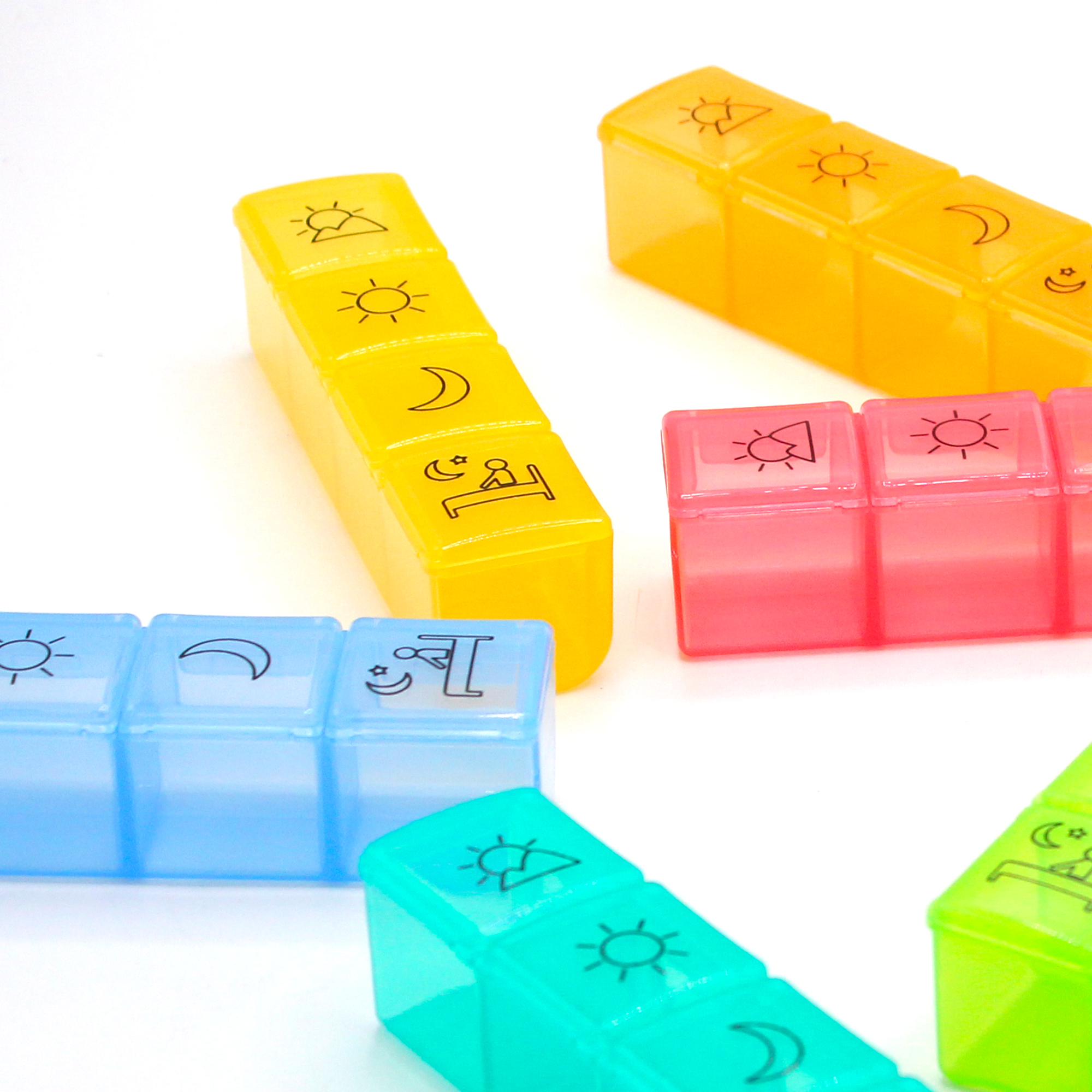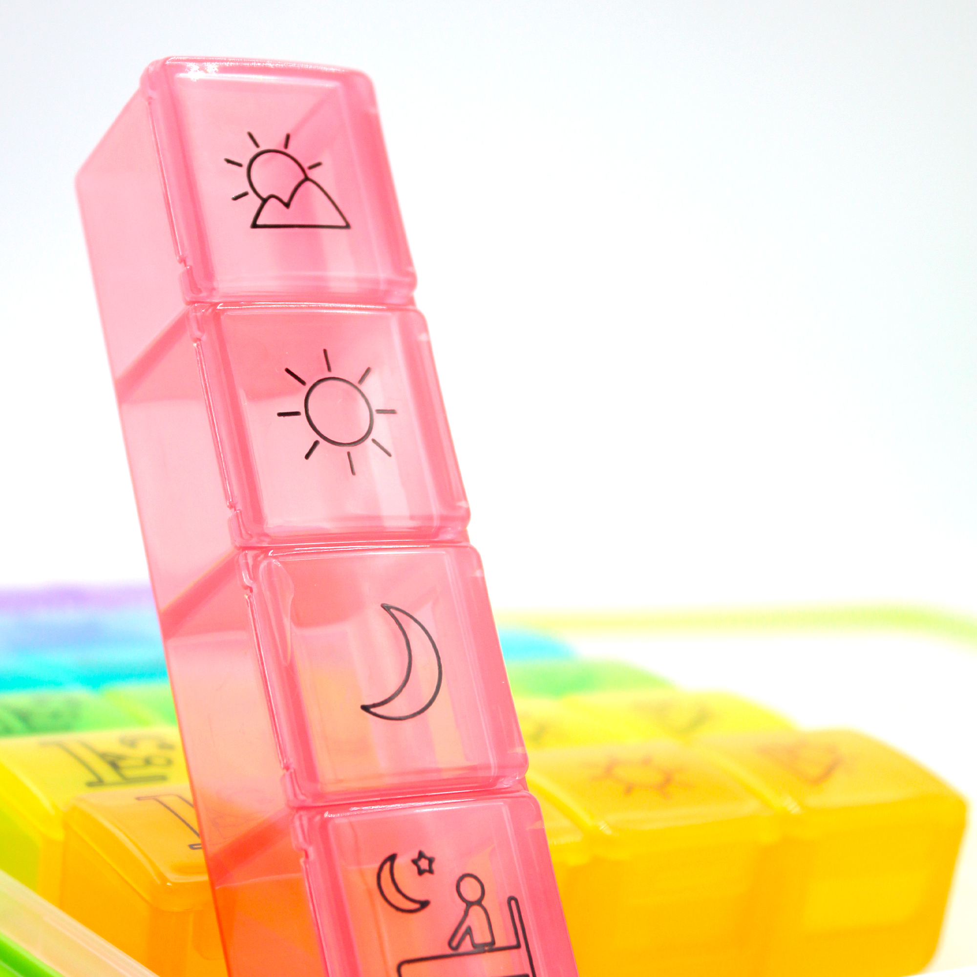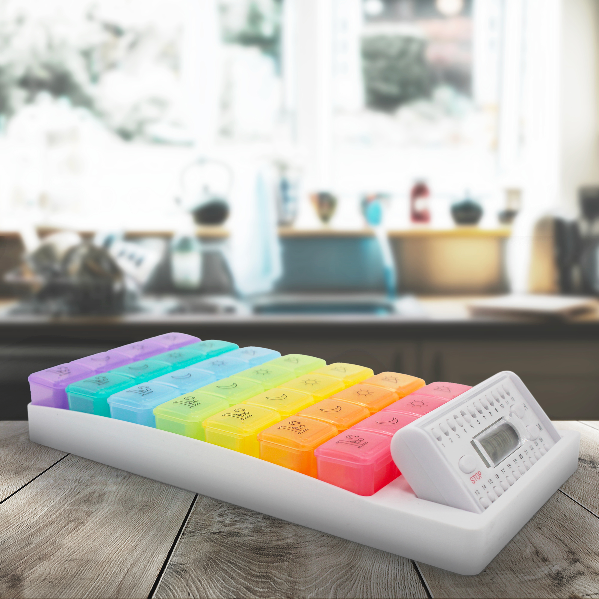 L’heure et le dosage exact pour tous vos médicaments ! Ce pilulier semainier est un modèle d’organisation pour ne manquer aucune prescription : – Son timer affiche l’heure sur l’écran LCD et permet de programmer jusqu’à 6 alarmes par jour. Très simple d’utilisation, il suffit de pousser le bouton correspondant à l’heure voulue. 2 rappels d’alarme sont effectués si elle n’a pas été désactivée : aucun risque d’oubli ! – Composé de 7 barrettes de couleurs, chaque journée est identifiée par sa couleur, plus d’erreur possible ! Chaque barrette est divisée en 4 cases : Matin, Midi, Soir et Nuit identifiées par des pictogrammes. – Le timer ainsi que toutes les barrettes sont indépendants et peuvent être emportés dans une poche ou un sac à main. Caractéristiques : – Matières : polypropylène et HIPS – Alimentation : 1 piles CR2032 fournies – Capot transparent de protection du timer inclus – Certifié CE, RoHS et LFGB