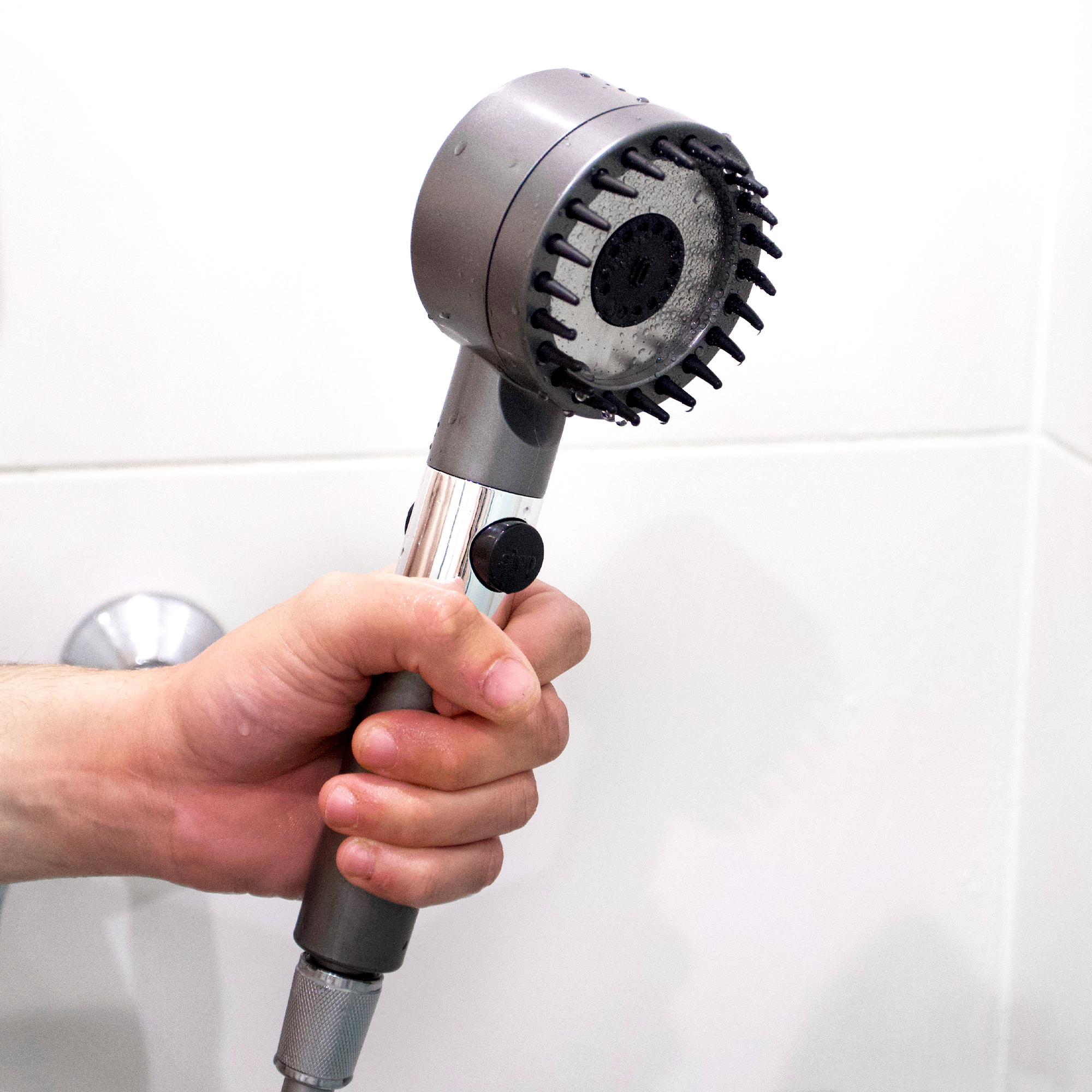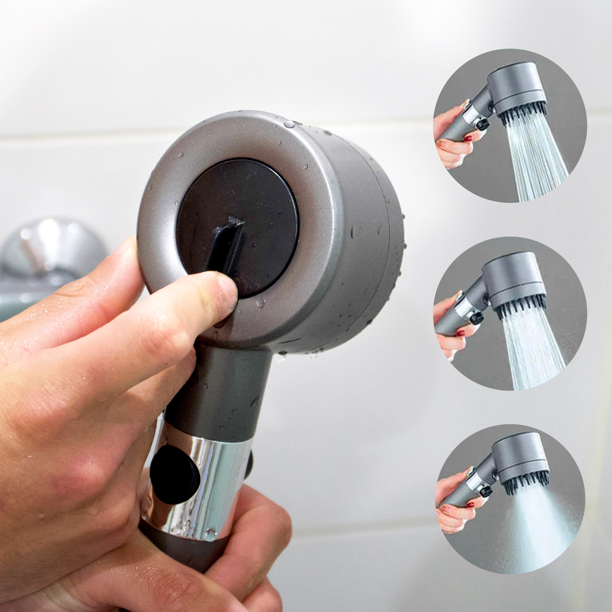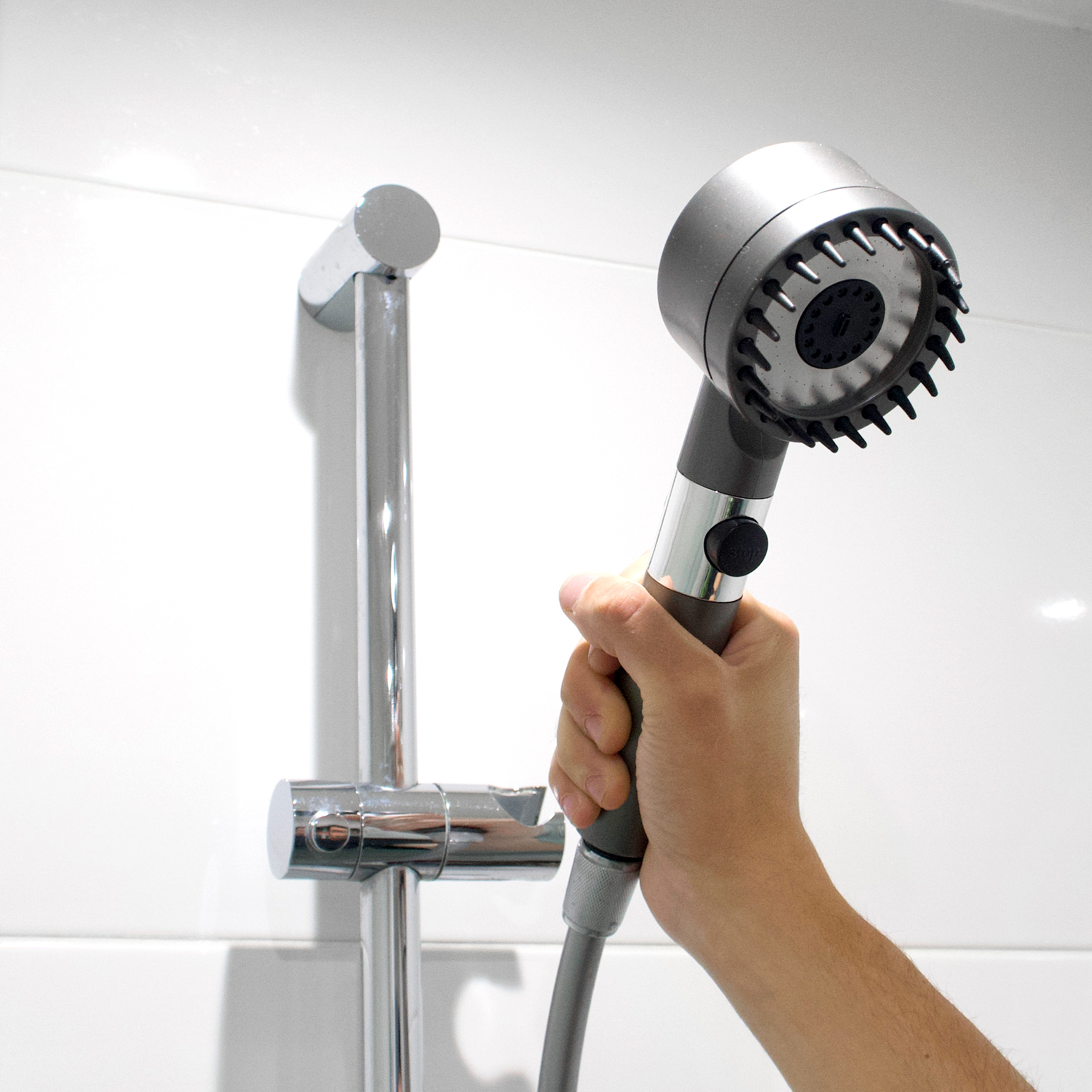 Tonique ou relaxante, à vous de choisir ! Avec ses 3 modes de jets allant du plus tonique au plus doux, ce pommeau de douche répondra à toutes vos envies. Pour une expérience “spa” complète, la tête du pommeau dispose de picots souples en caoutchouc que vous pourrez utiliser pour vous masser le corps ou le cuir chevelu. Le bouton de sélection des modes est situé à l’arrière de la tête, vous pouvez ainsi facilement changer la puissance du jet au cours de votre douche. Le bouton poussoir sur le manche du pommeau permet de gérer la mise en route et l’arrêt du jet sans avoir à toucher le robinet. Universel, ce pommeau s’installe sur tous les tuyaux de douche du commerce Caractéristiques : – Matières : ABS, Acier inoxydable, caoutchouc – Dimensions : Ø 7.5 x 25 cm
