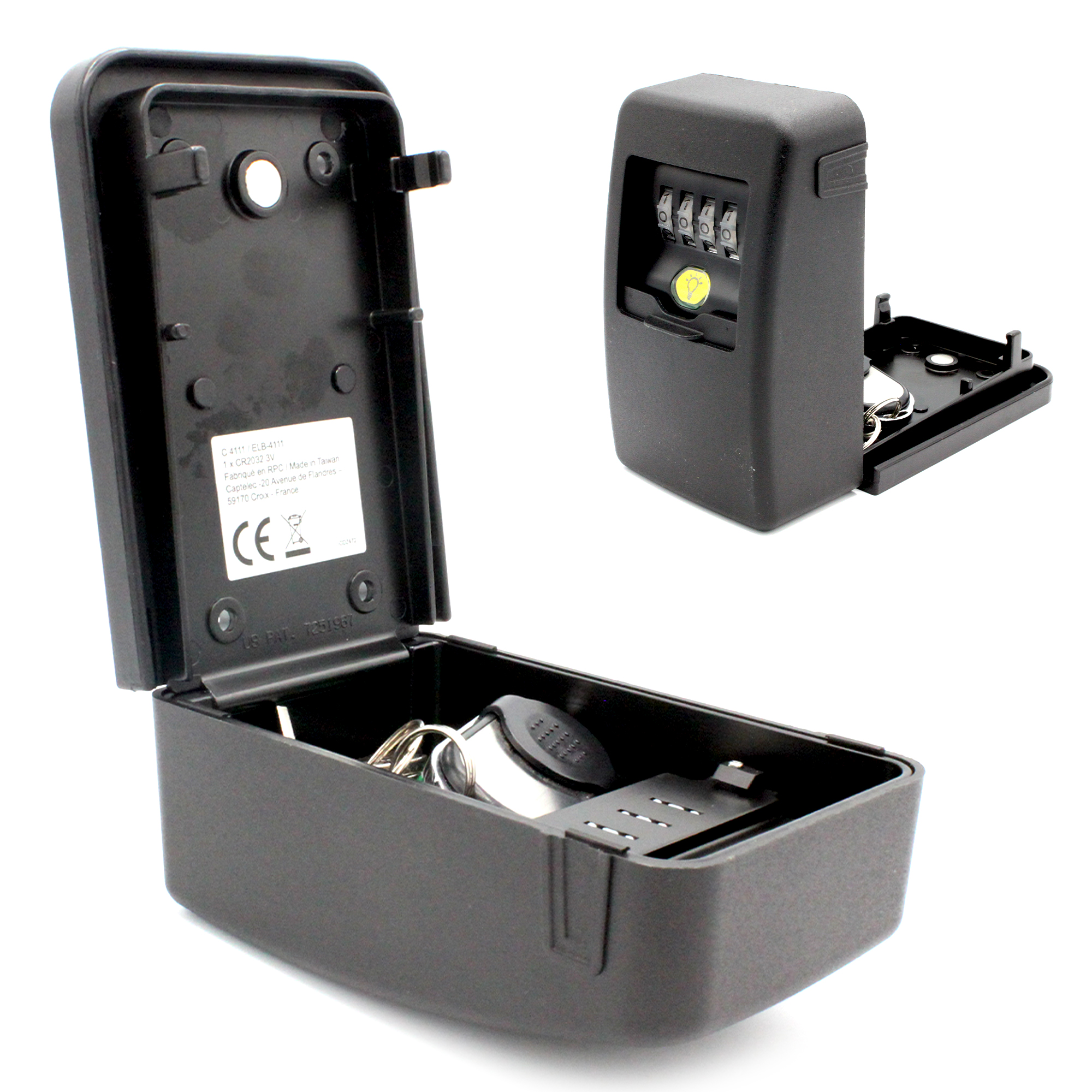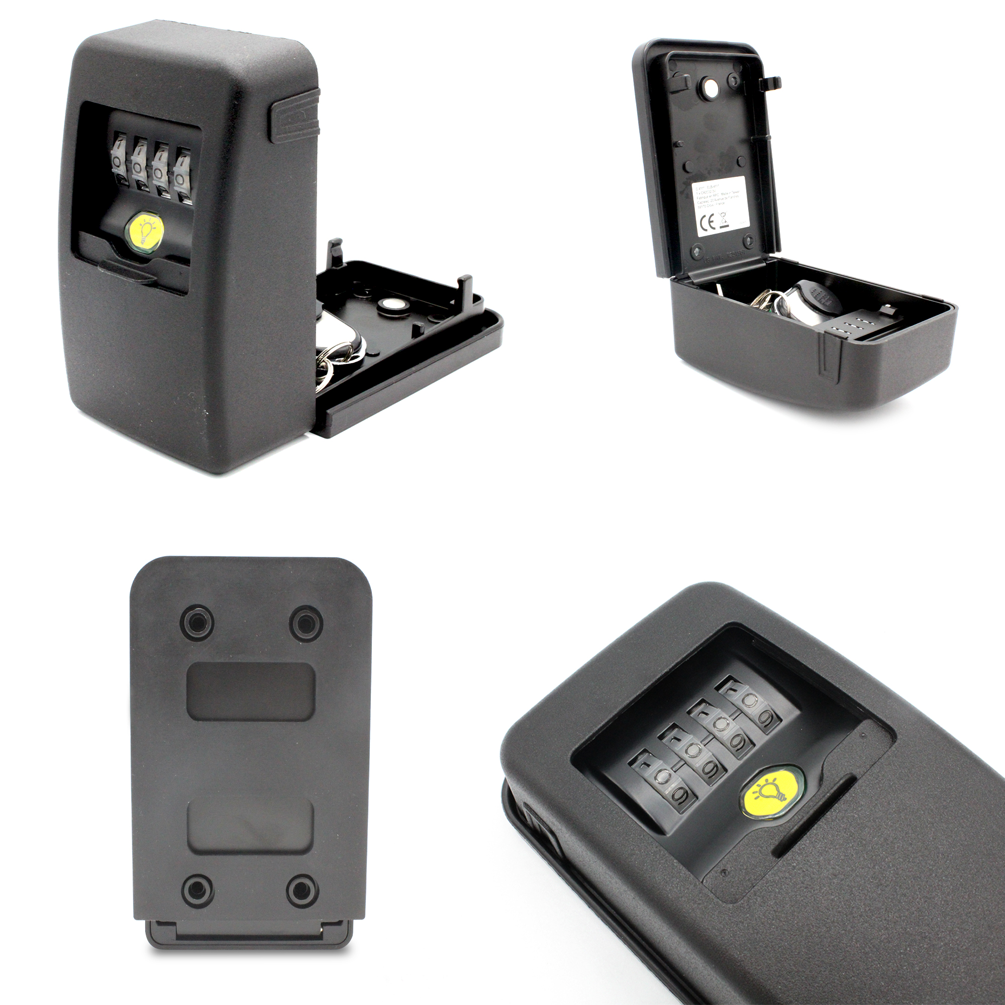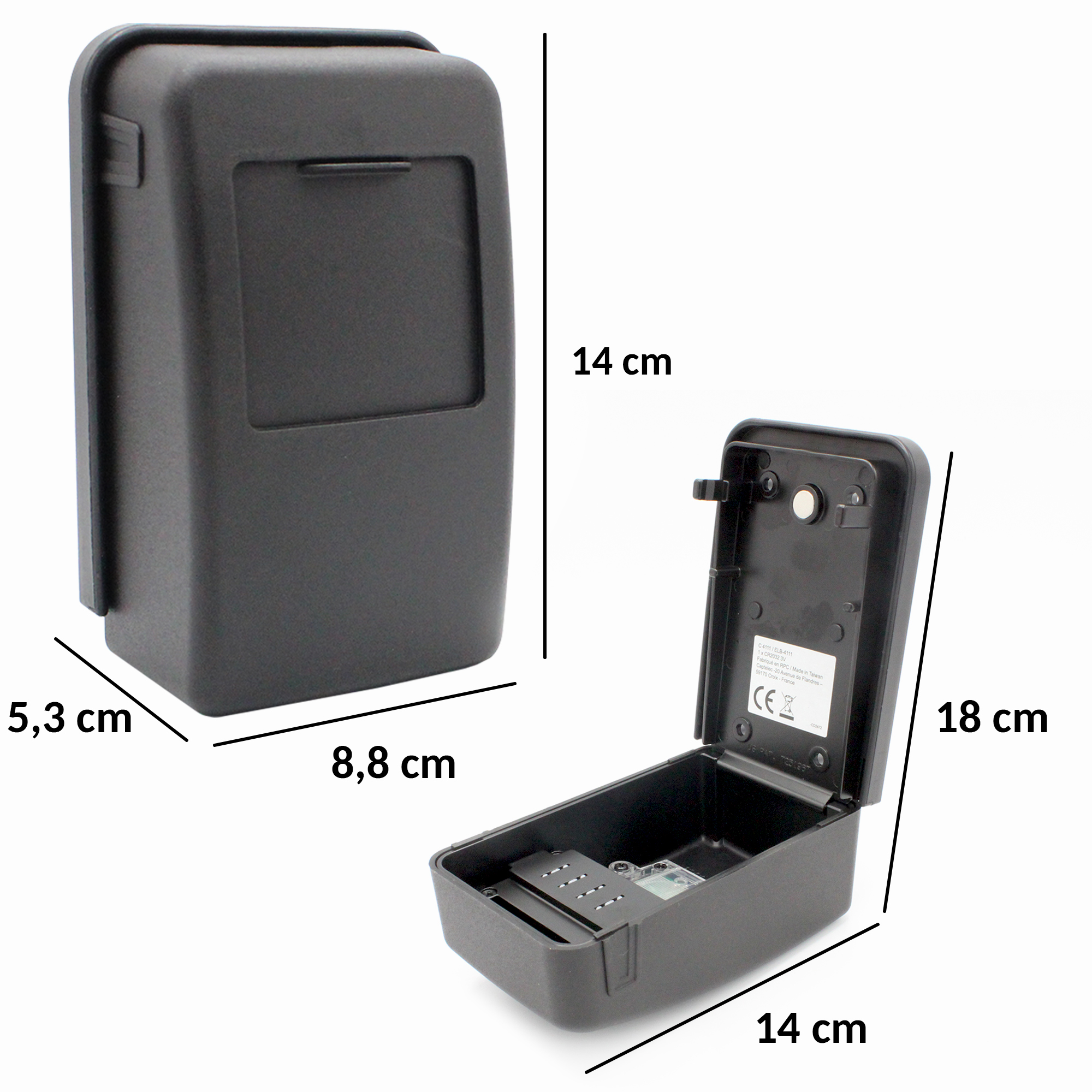 Aujourd’hui nous sommes de plus en plus souvent amené à laisser l’usage de nos clés de maison à d’autre personnes (amis ou famille de passage, infirmier, kiné, auxilliaire de vie, location courte durée…) Terminée l’époque où l’on cachait ses clés sous le paillasson ou le pot de fleur devant sa porte de maison ! Avec ce coffre de clé vous disposez d’un mini coffre fort pour vos clés. Fabriqué dans un alliage de zinc ultra résistant d’une épaisseur de 2 mm, vos clés seront bien protégées. Contrairement à d’autres modèles, ce coffre dispose d’une combinaison à 4 chiffres avec la possibilité d’utiliser plusieurs fois le même chiffre. Cela multiplie considérablement le nombre de combinaisons possibles et rend les tentatives de décodage malveillantes quasi impossible. Les roulettes en plastique et non en métal ne risque pas la corrosion et les crans à chaque chiffre en rendent la manipulation aisée. Le boîtier monté sur charnière rend sa manipulation pratique et évite au clés de tomber lors de l’ouverture. Une base en caoutchouc permet à la fois de corriger les irrégularité du mur et renforce l’étanchéité du coffre. Un clapet de fermeture rend le coffre discret et le protège des intempéries. Enfin, une led vous permet d’éclairer les chiffres. Une aide précieuse lorsqu’il fait nuit ou sombre. Caractéristiques: – Matière: Alliage zinc (2 mm), caoutchouc, plastique – Poids : 721 g – Dimensions Hors tout : 14.1 x 8.3 x 5.2 cm. – Dim utile du compartiment : 7.2 x 7.7 x 3.8 cm – Accessoires inclus : 4 vis, 4 chevilles, base en caoutchouc, 1 pile bouton CR 2032 (pour LED)