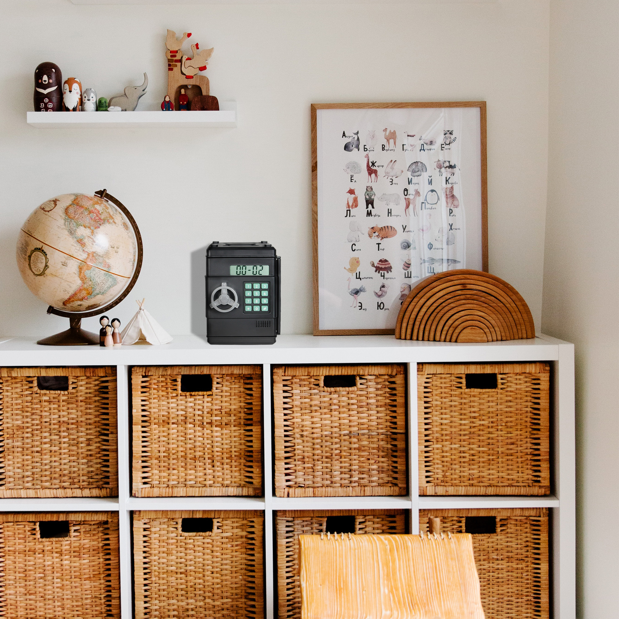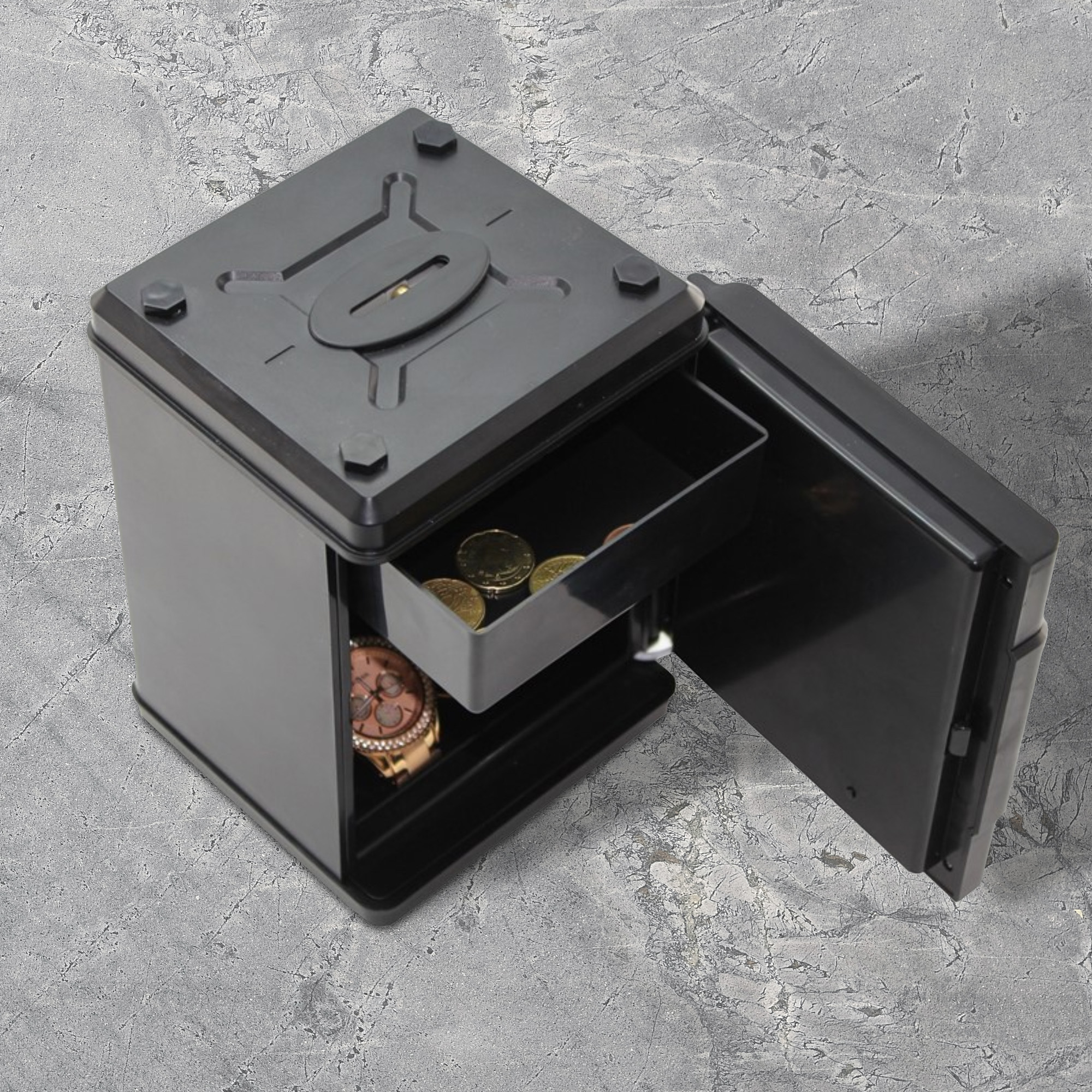 Protégez vos effets personnels ! La tirelire Strong box abrite vos pièces de monnaie ainsi que vos petits objets de valeur. L’ouverture de la tirelire est protégée grâce à un code à 6 chiffres, modifiable à tout moment. Il suffit de le composer sur le clavier apposé sur la porte et de tourner le verrou pour avoir accès à vos économies. Astucieuse, la tirelire compte le montant des pièces qu’elle contient. Chaque pièce insérée est identifiée et comptabilisée électroniquement. L’écran LCD affiche en temps réel la somme rangée dans la tirelire. A chaque fois que vous ajoutez des pièces, le montant se cumule avec le précédent, permettant ainsi de compter sur une semaine ou plus. Les pièces sont stockées dans le compartiment supérieur. Lorsqu’il n’y a pas de pièces insérées, l’écran affiche l’heure. Le compartiment inférieur permet quant à lui de ranger des billets, une montre, des bijoux… Avec son fonctionnement simple, vous prendrez plaisir à l’utiliser quotidiennement. La tirelire Strong Box convient pour les pièces en euros uniquement. Caractéristiques : – Fonctionne avec 2 piles AA non fournies (pour l’écran) – Dimensions : 13 x 13 x 19.5 cm – Matière : ABS – Bruitage “bip” par pression des touches du clavier – Conforme aux normes CE et RoHS