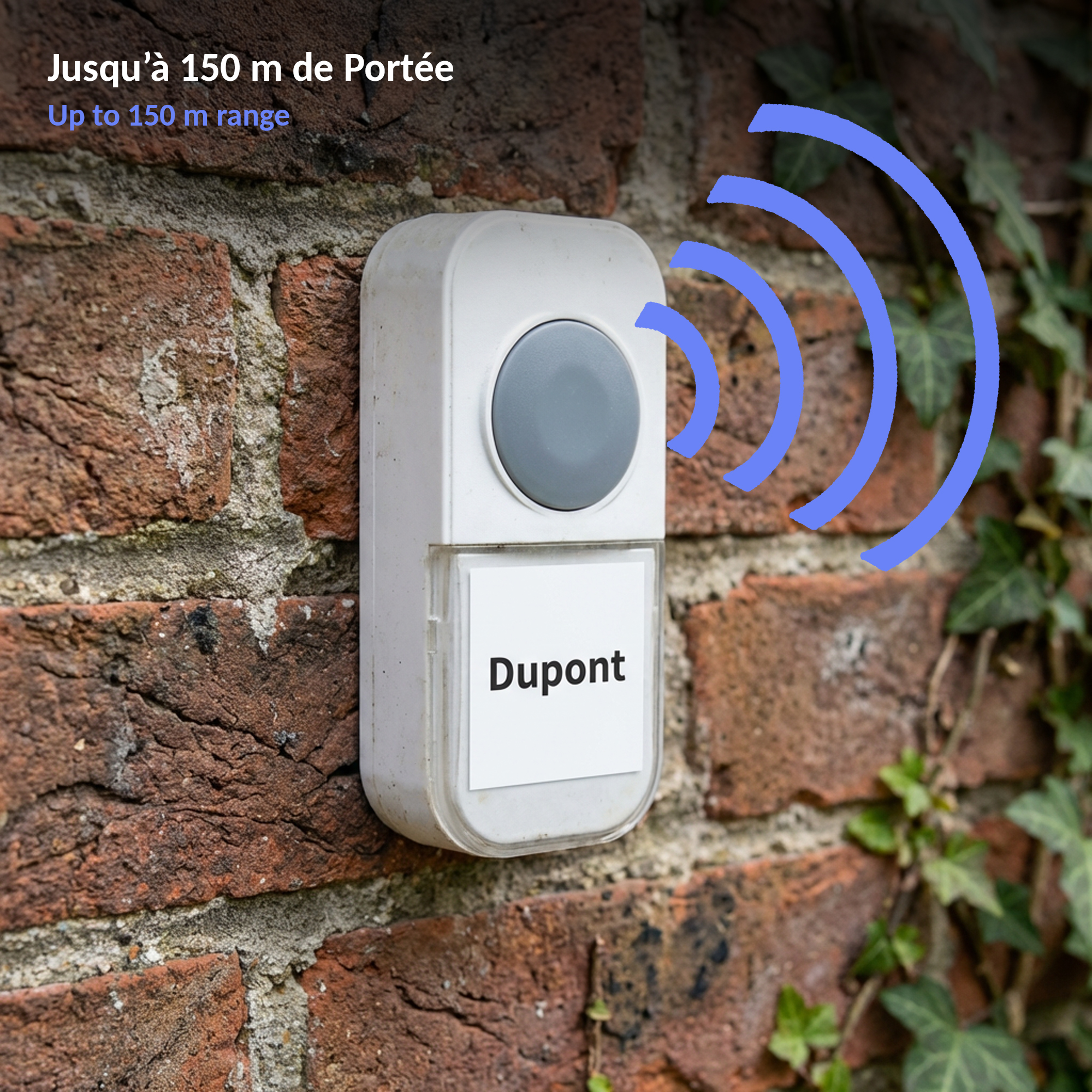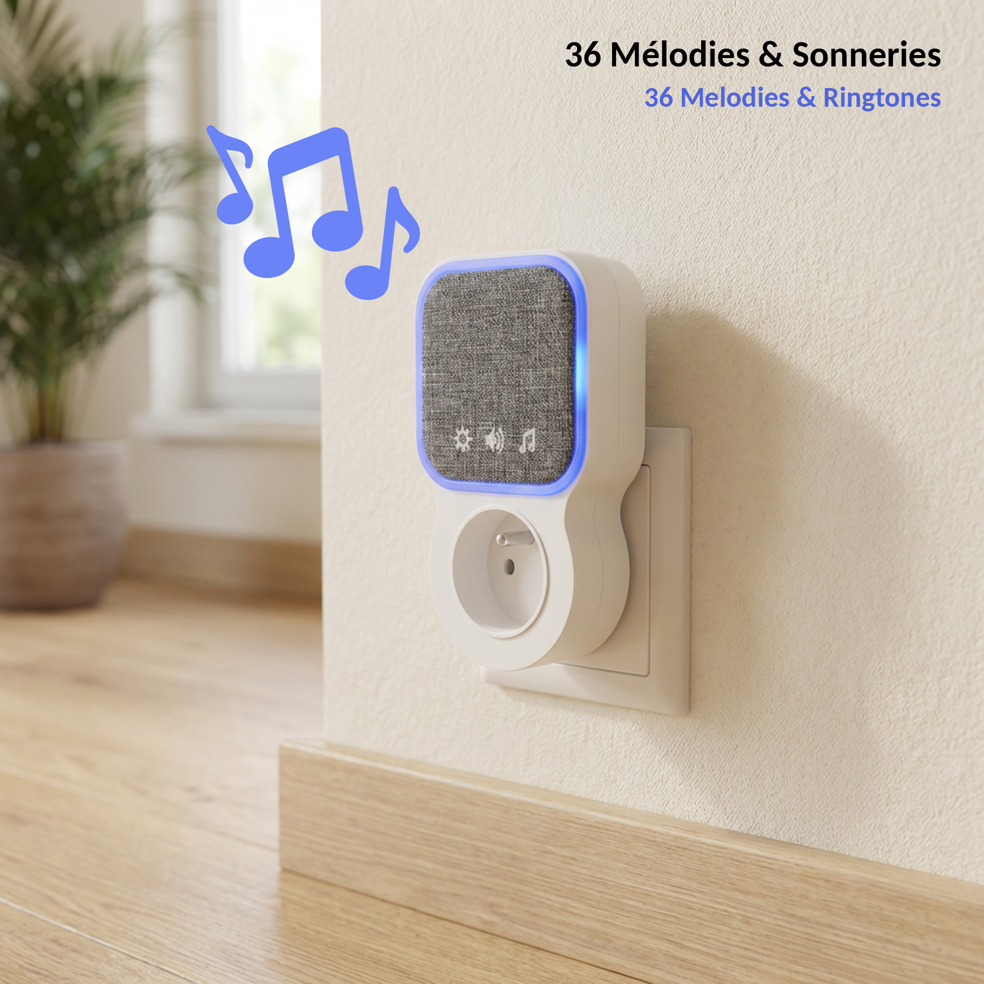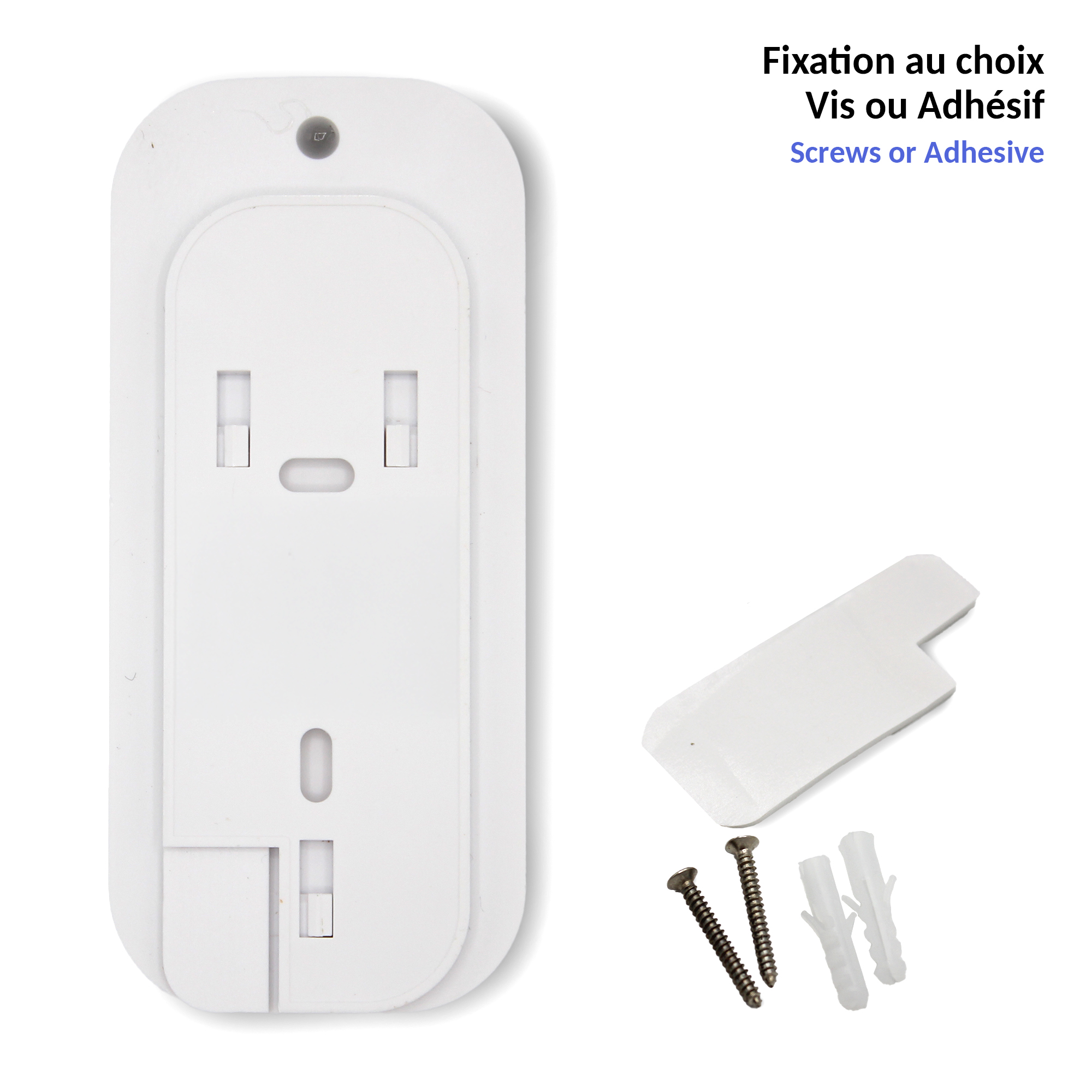 Appuyez sur la sonnette et donnez vie à la technologie sans fil Petite merveille de technologie, cet émetteur transforme l’énergie cinétique en signal radio fréquence, le tout sans pile ni fil électrique ! Vous installez l’émetteur où bon vous semble, sur votre porte d’entrée ou près de votre portail extérieur. Conçu pour un usage en intérieur et extérieur, il résiste aux intempéries. Le récepteur quant à lui, se branche simplement sur la prise de votre choix. Discret et facile à déplacer, il trouvera sa place dans n’importe quelle pièce de votre maison. Pratique le récepteur dispose d’une fiche qui vous permet de conserver l’utilisation de votre prise. Choisissez entre 36 mélodies et sonneries différentes. Le volume est réglable sur 4 niveaux d’intensité Complet, le receveur dispose de 3 modes différents : sonnerie + flash, sonnerie uniquement ou flash uniquement. Ces 3 modes permettent d’adapter parfaitement cette sonnette à vos besoins Caractéristiques : – Matière : ABS – Dimensions : Recepteur : 12.7 x 7.4 x 6.1 cm Emetteur : 8.9 x 4 x 2.2 cm – Alimentation du récepteur : 220-240V 50HZ – Fréquence : 433.92 MHz – Portée de 150 mètres en champ libre – Certifiée CE, RoHS, LVD, RED, IP 55 – Accessoires : visserie et double face pour fixer l’émetteur